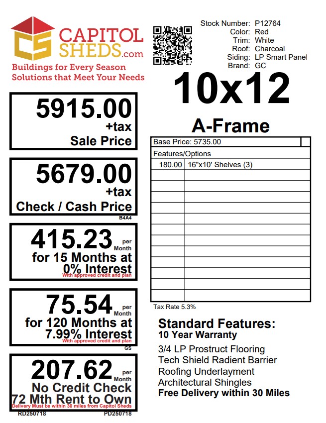 This 10×12 A‑Frame is a classic and practical storage solution with a bold look. Its LP Smart Panel siding is finished in vibrant Red with crisp White trim, topped with Charcoal architectural shingles over roof felt paper for long‑lasting protection. Built for strength, it features 2×4 wall studs and rafters 16″ on center, LP Tech Shield roof sheeting, and LP T&G Prostruct flooring supported by pressure‑treated 2×4 joists 12″ on center. Two windows bring in natural light, while two doors provide easy access. Inside, a pair of 16″x10′ shelves are included, giving you convenient built‑in storage right away.