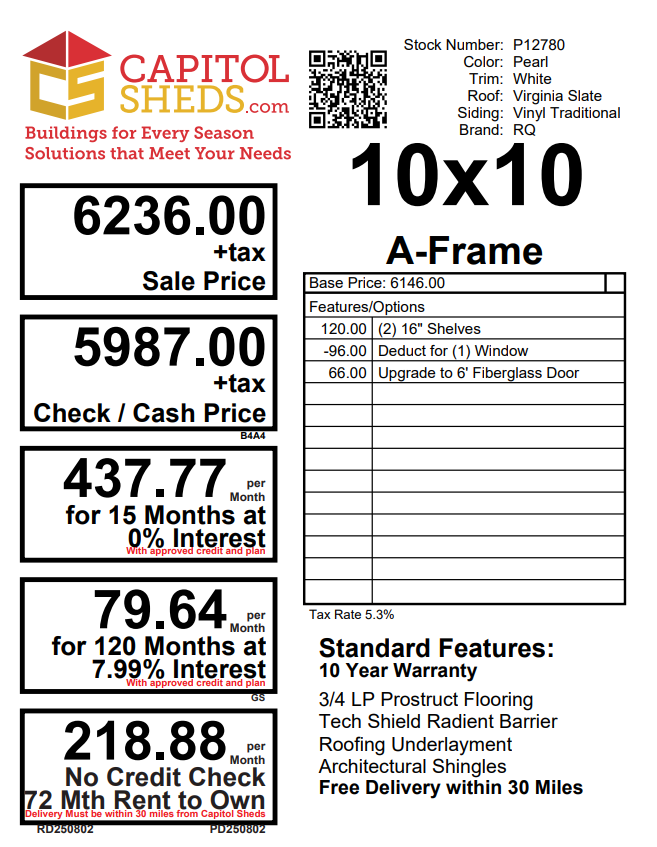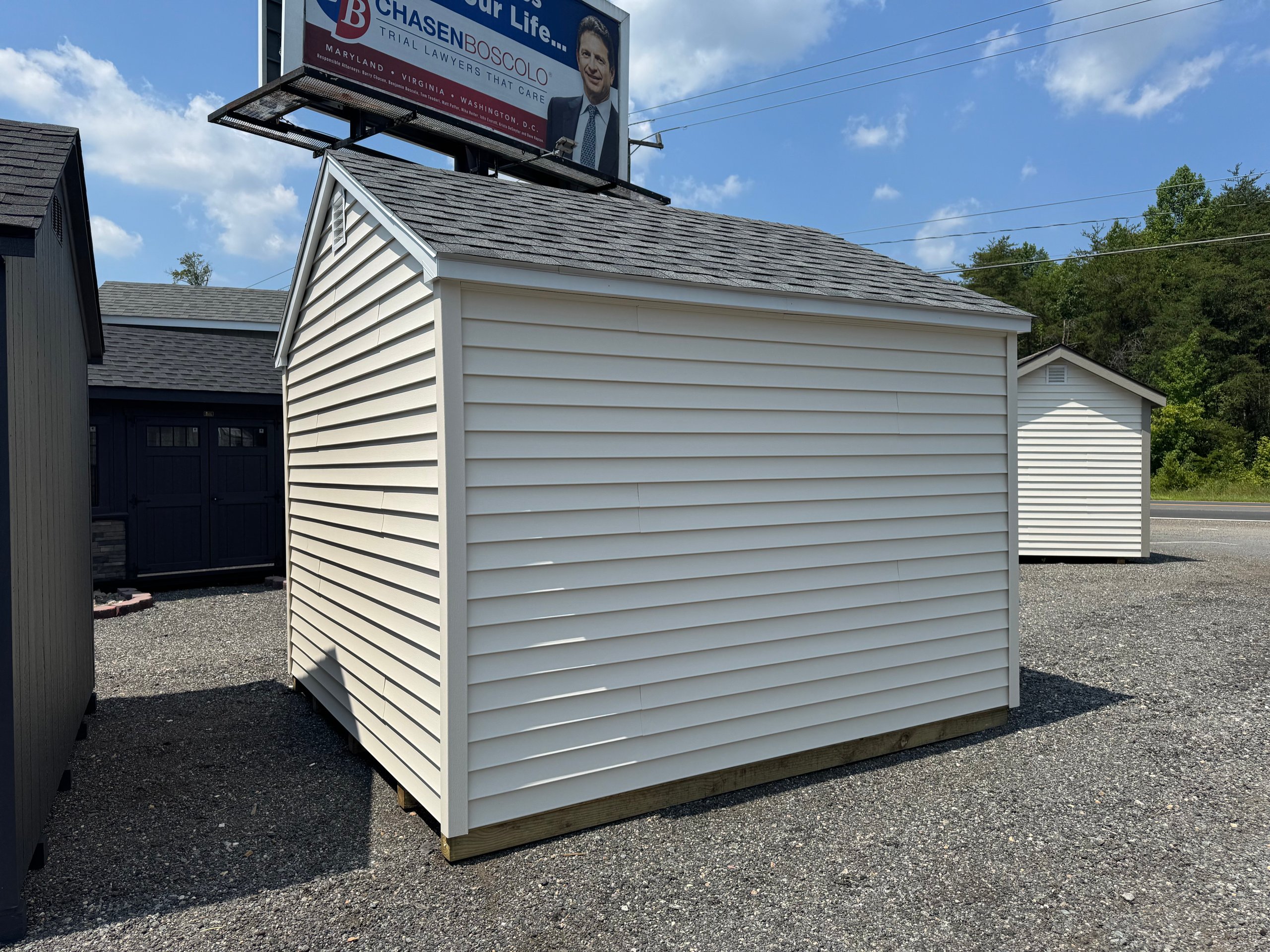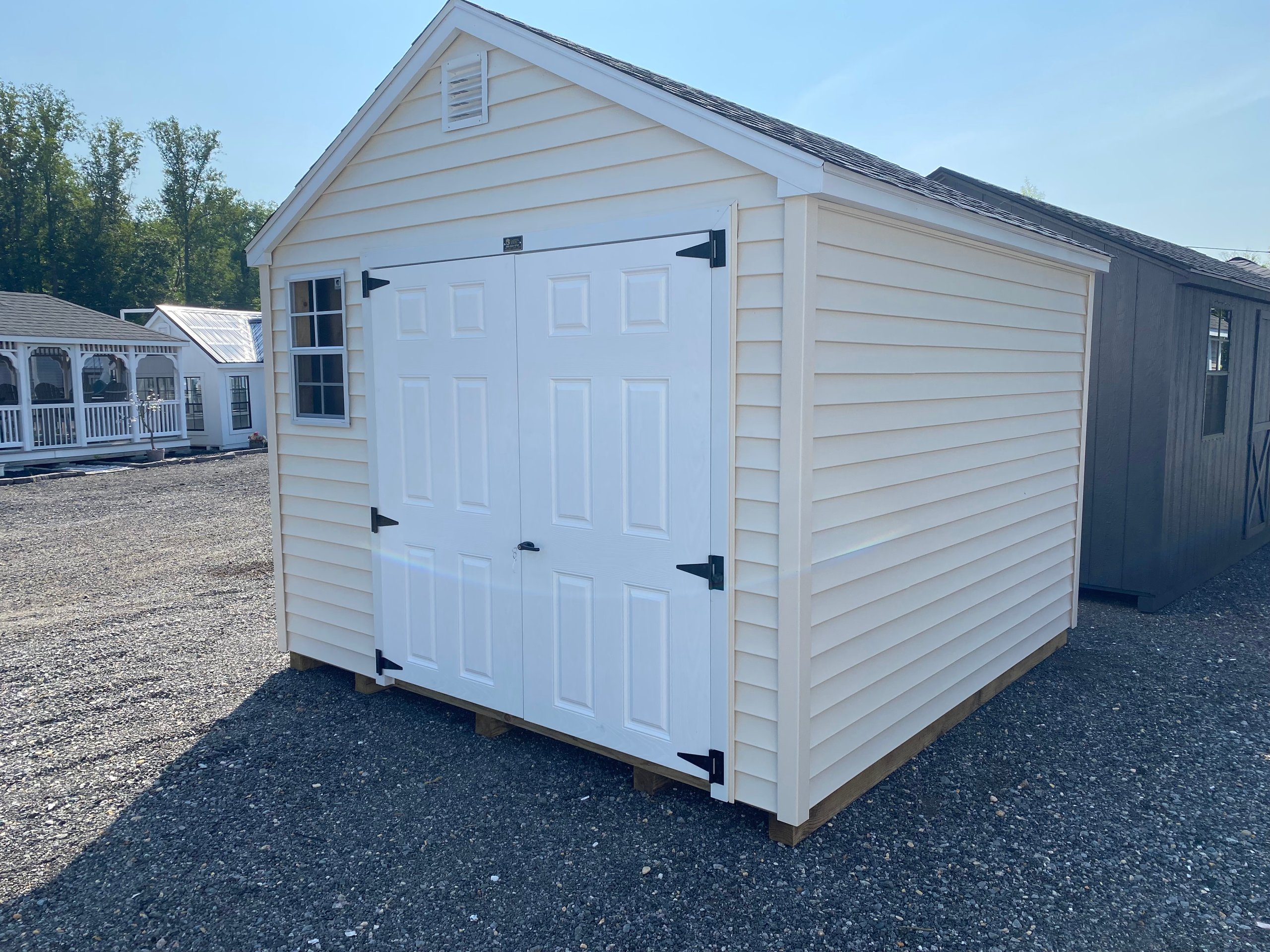 Built with Amish craftsmanship, this 10×10 A-Frame storage shed offers durable, low-maintenance vinyl siding in Pearl with clean white trim. The Virginia Slate architectural shingles and LP Tech Shield roof sheathing help regulate interior temperatures year-round. Inside, you’ll find 2×4 framing throughout, a pressure-treated floor system, and LP Prostruct Flooring for long-term strength. The upgraded 6-foot double doors provide easy access, complemented by a single window for light. Two 16″ interior shelves are included for added storage efficiency. Ideal for homeowners seeking compact, quality-built storage that blends seamlessly with the backyard.
