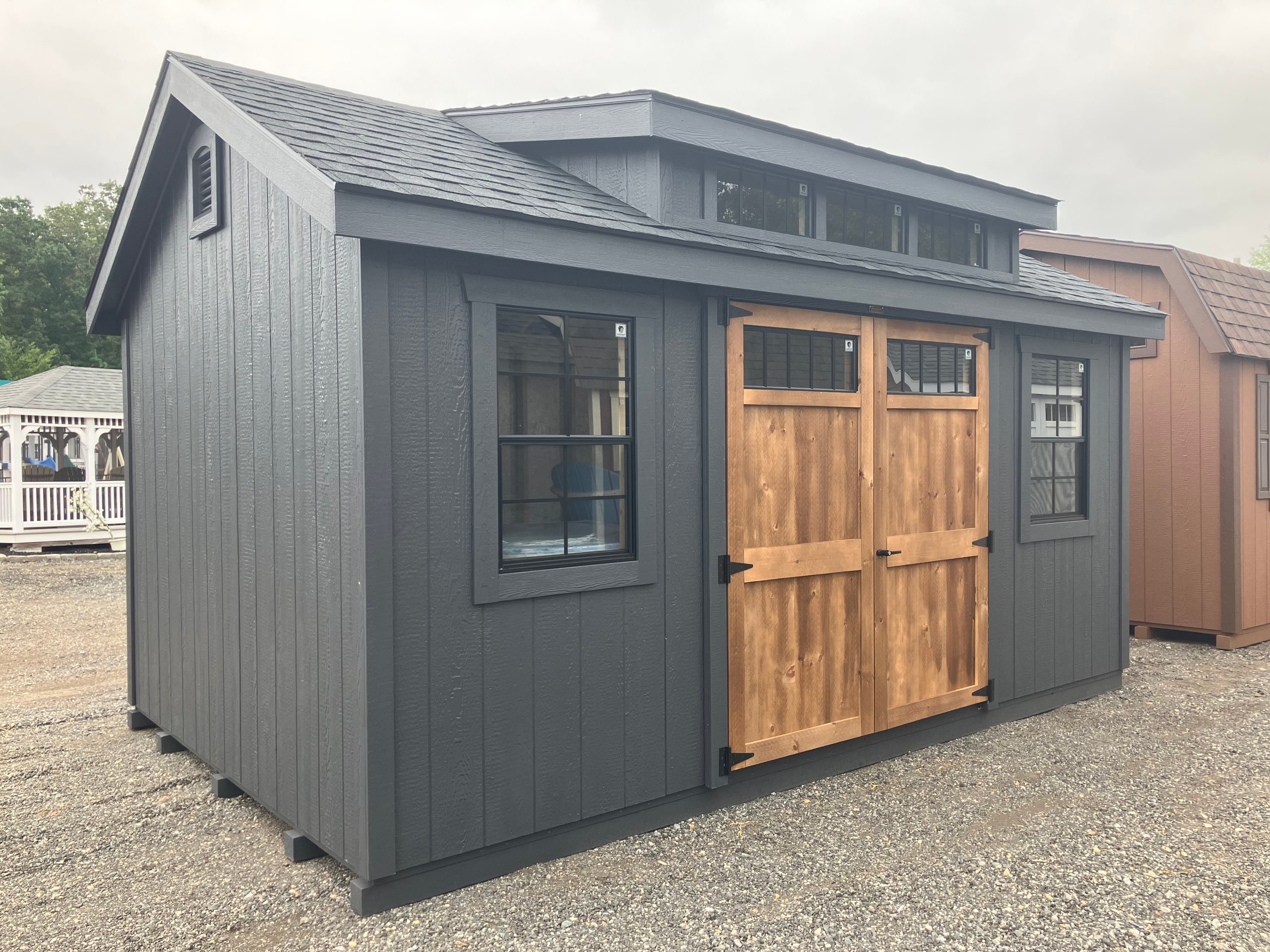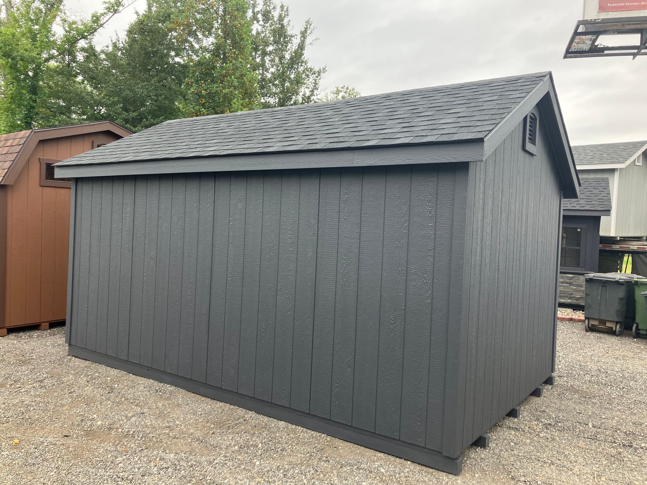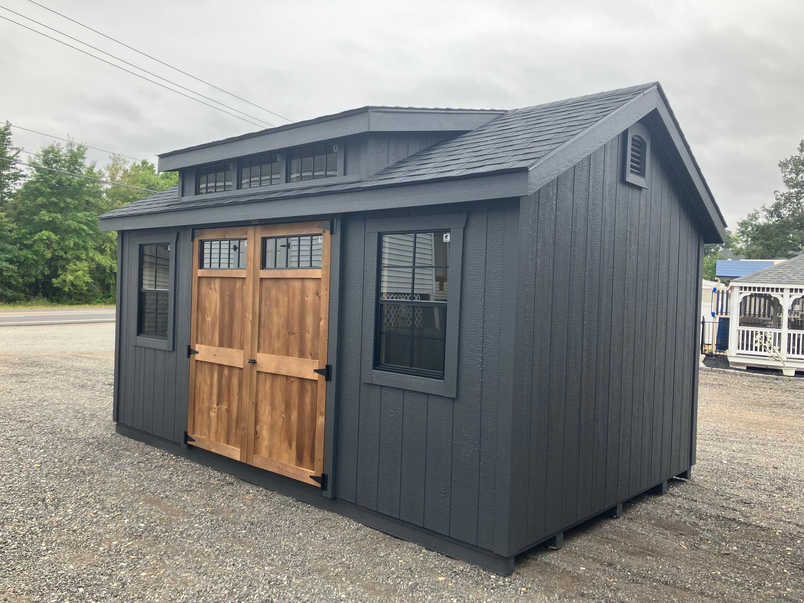 This 10×16 Colonial A-Frame shed combines classic elegance with practical design. Finished in Mopboard siding and trim with a sleek Black shingle roof, it offers timeless curb appeal. Seven windows, including upgraded 24″x36″ sizes and a striking three-window transom dormer, flood the interior with natural light. A pine door with transom windows and decorative Victorian vents add sophisticated charm. Built for strength and longevity, it features 2×4 framing on 16-inch centers, LP Tech Shield roof sheeting, LP Prostruct flooring, and pressure-treated joists. Perfect for storage, hobbies, or workspace, this shed delivers durability, beauty, and exceptional functionality in one refined package.