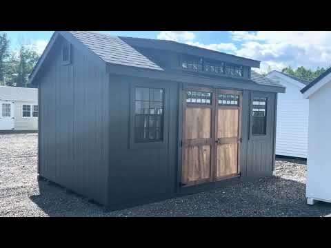 Bring timeless charm and durability to your backyard with this 10×16 Colonial A-Frame Amish-built storage shed. Designed with precision and strength, it features LP Smart Panel siding, LP ProStruct flooring, and pressure-treated floor joists for long-lasting performance. The classic Mopboard siding and trim pair beautifully with the black dimensional shingle roof, enhanced by a three-transom dormer and Victorian vents for added elegance. Upgraded 6′ pine double doors with transom windows and large 24×36 windows with black grids provide both style and natural light. Built with 2×4 framing throughout, this shed is as sturdy as it is stunning—perfect for storage or a backyard retreat.