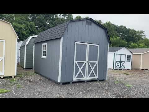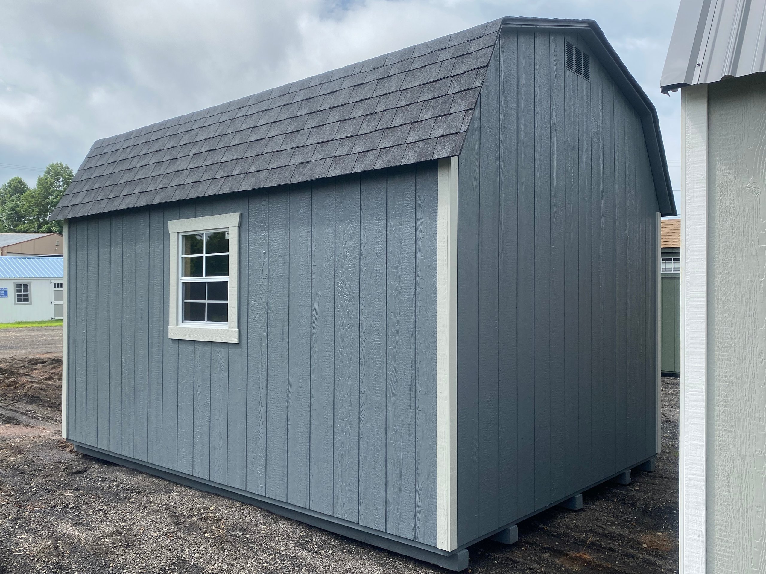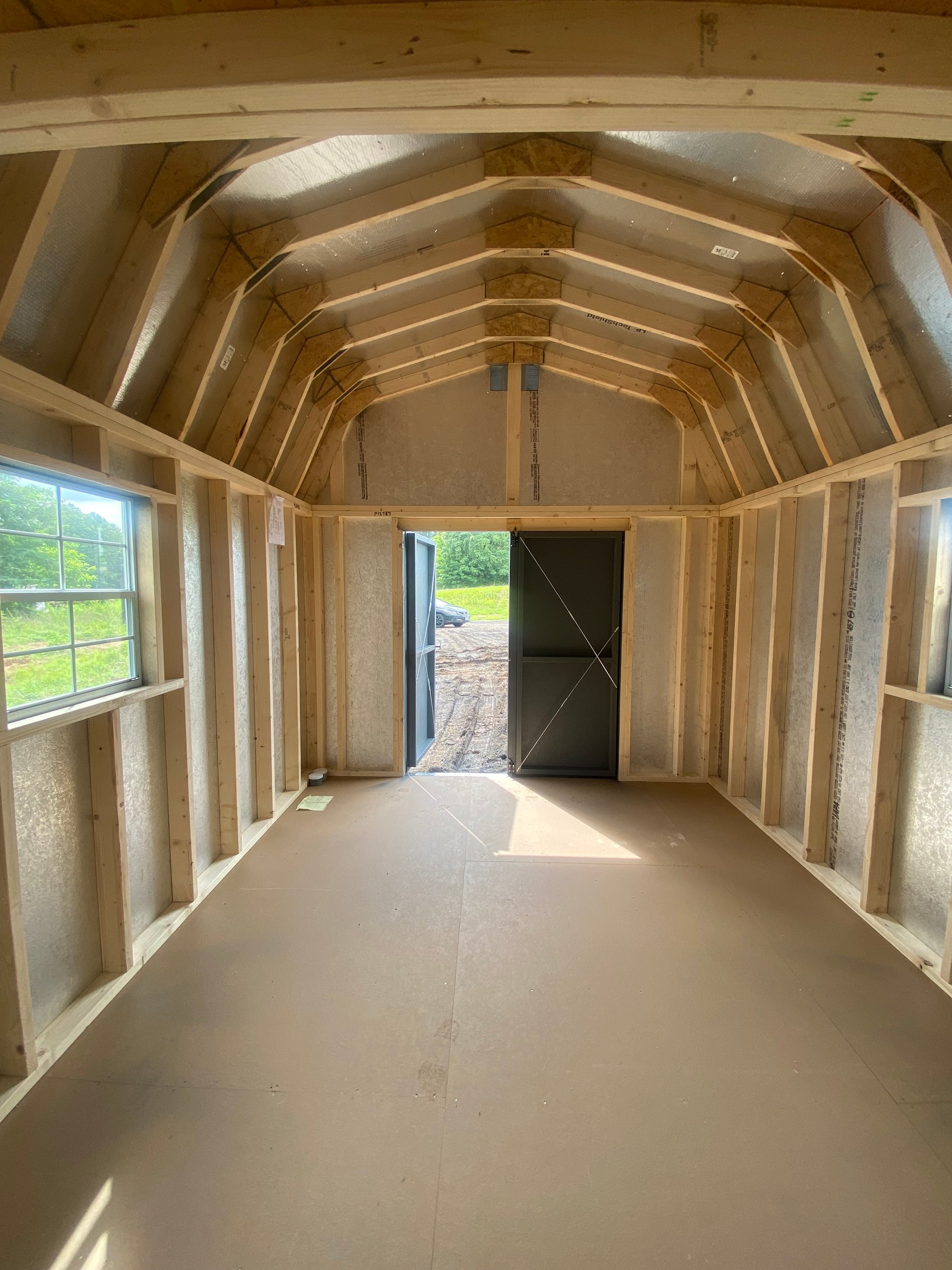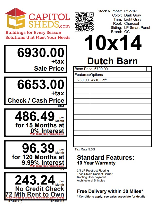 This 10×14 Dutch Barn offers a classic barn profile with superior functionality. The exterior features LP Smart Panel siding finished in a bold dark gray with light gray trim, perfectly accented by a charcoal architectural shingle roof with roof felt underlayment for long‑lasting protection. Built with 2×4 wall studs and rafters 16″ on center, LP Tech Shield roof sheeting, and LP T&G Prostruct flooring over 12″ on‑center joists, this shed is designed for strength and durability. Two windows bring in natural light, while double doors provide easy access. A spacious 4×10 loft adds valuable overhead storage, making organization simple.