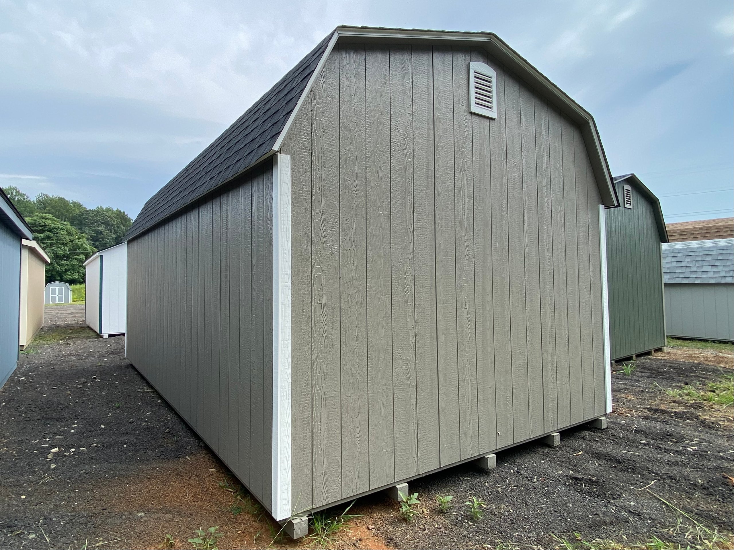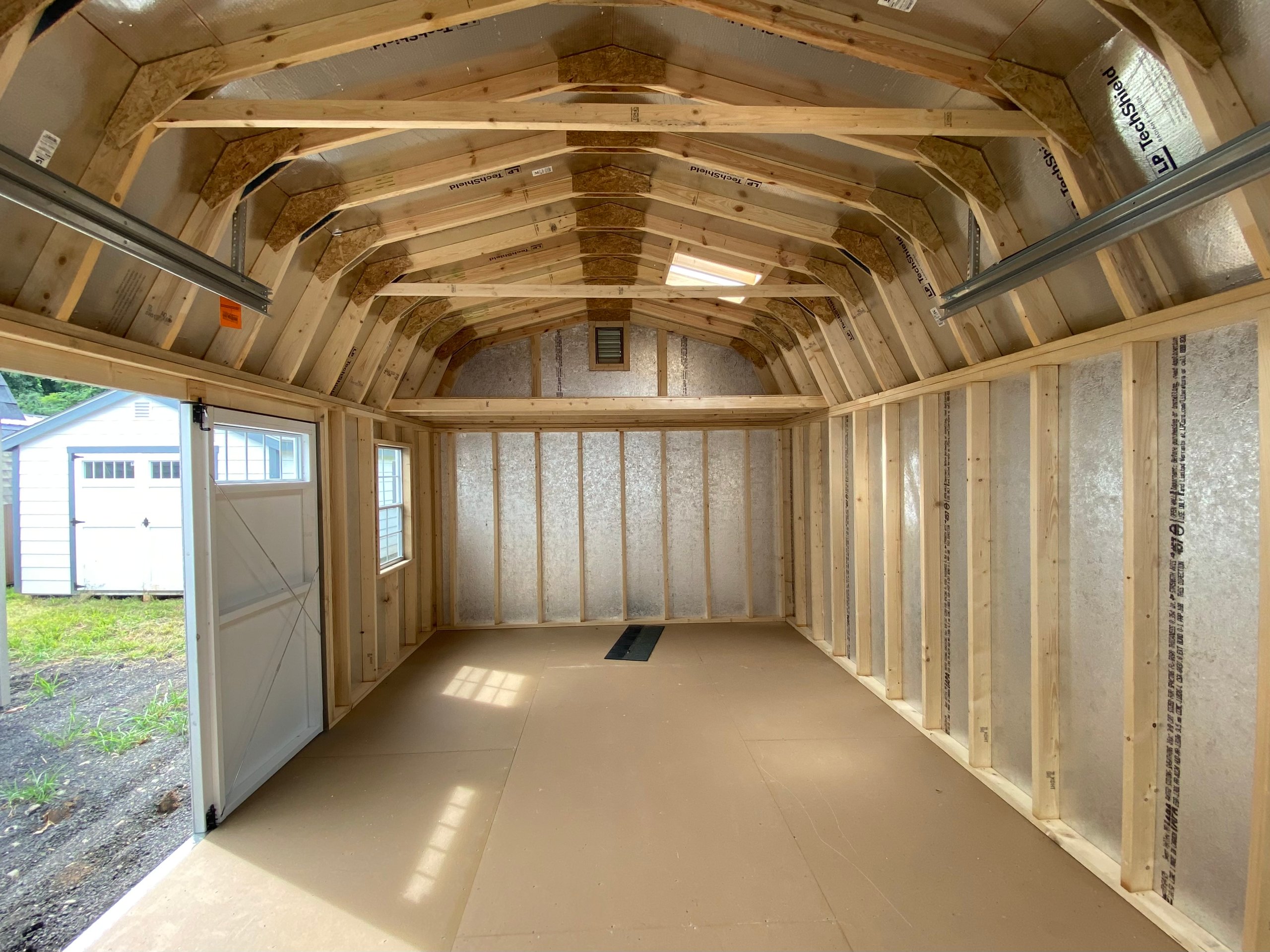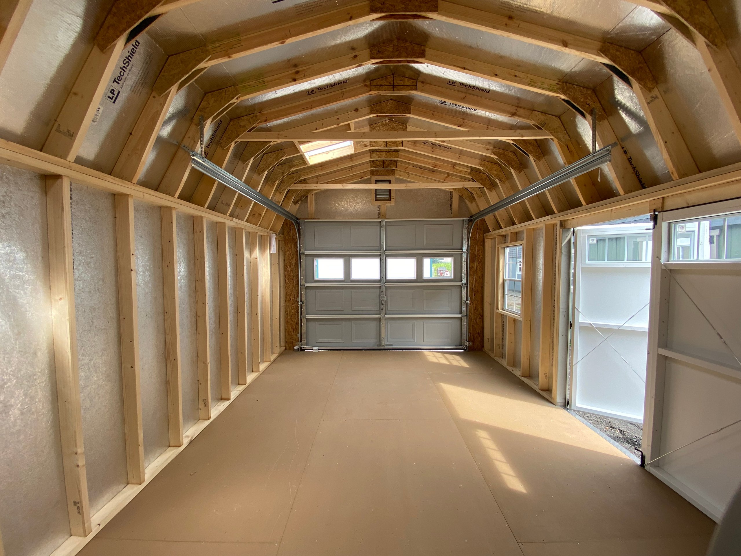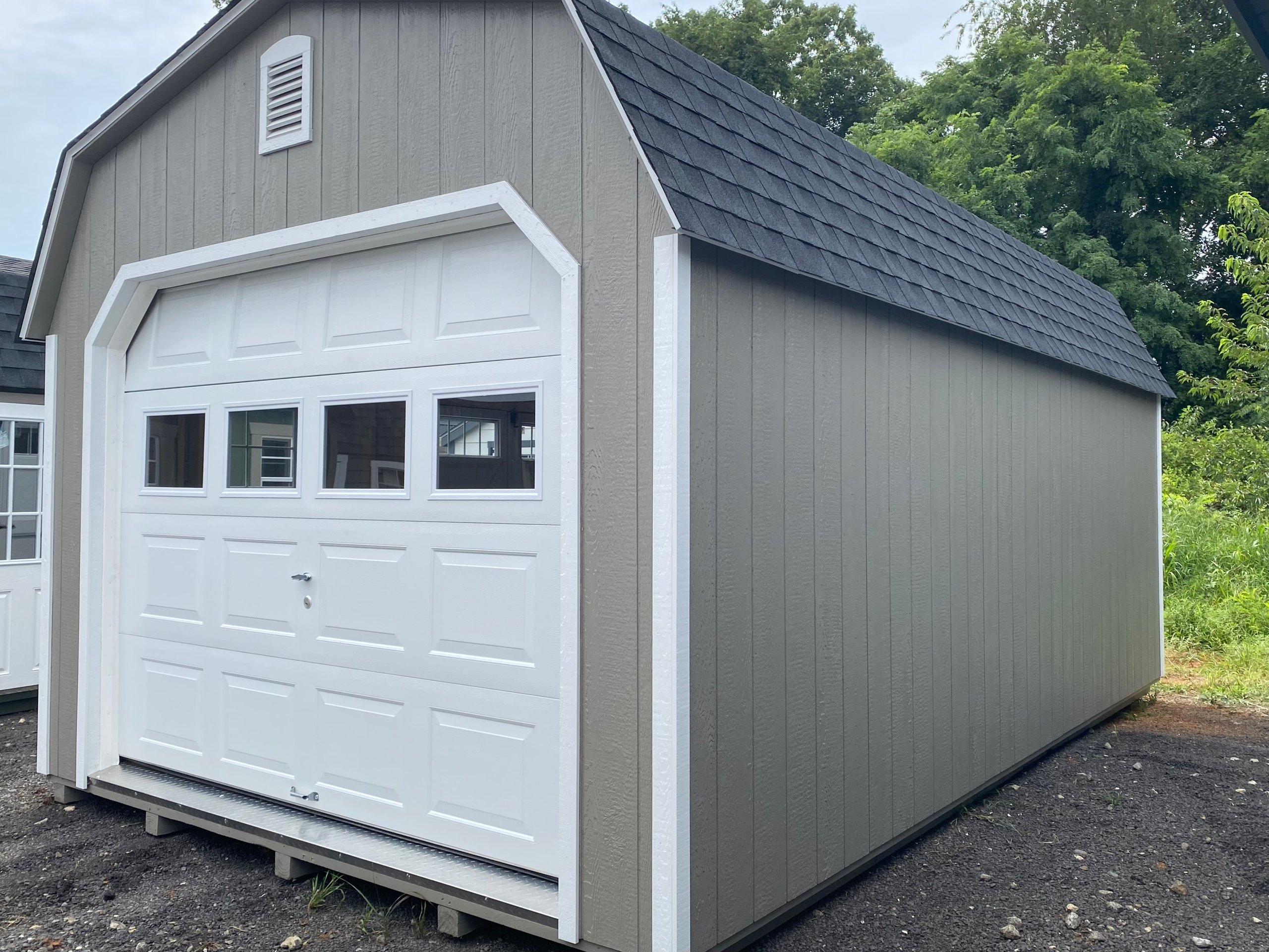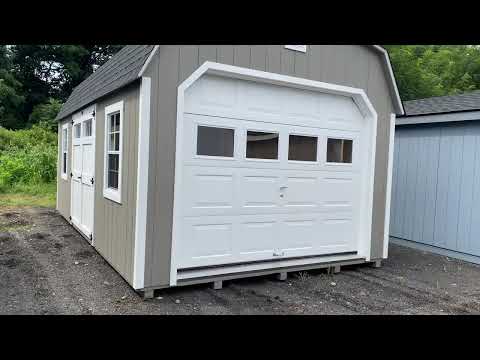 This 12×20 Dutch Barn Garage combines charm and strength with Clay LP Smart Panel siding, crisp White trim, and a Charcoal architectural shingle roof over roof felt paper. Built with 2×4 wall studs and roof rafters spaced 16″ on center, it includes LP Tech Shield roof sheeting, LP T&G Prostruct flooring, and pressure-treated 2×4 floor joists spaced 8″ on center for extra strength. Two 24×36 windows, two skylights, and two garden vents provide abundant light and airflow. A 9×7 garage door with windows, standard door, and a 4×10 loft make this garage perfect for storage, hobbies, or light vehicle use.