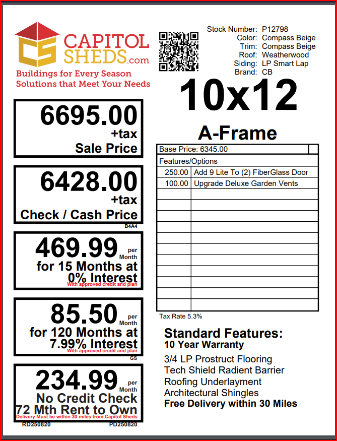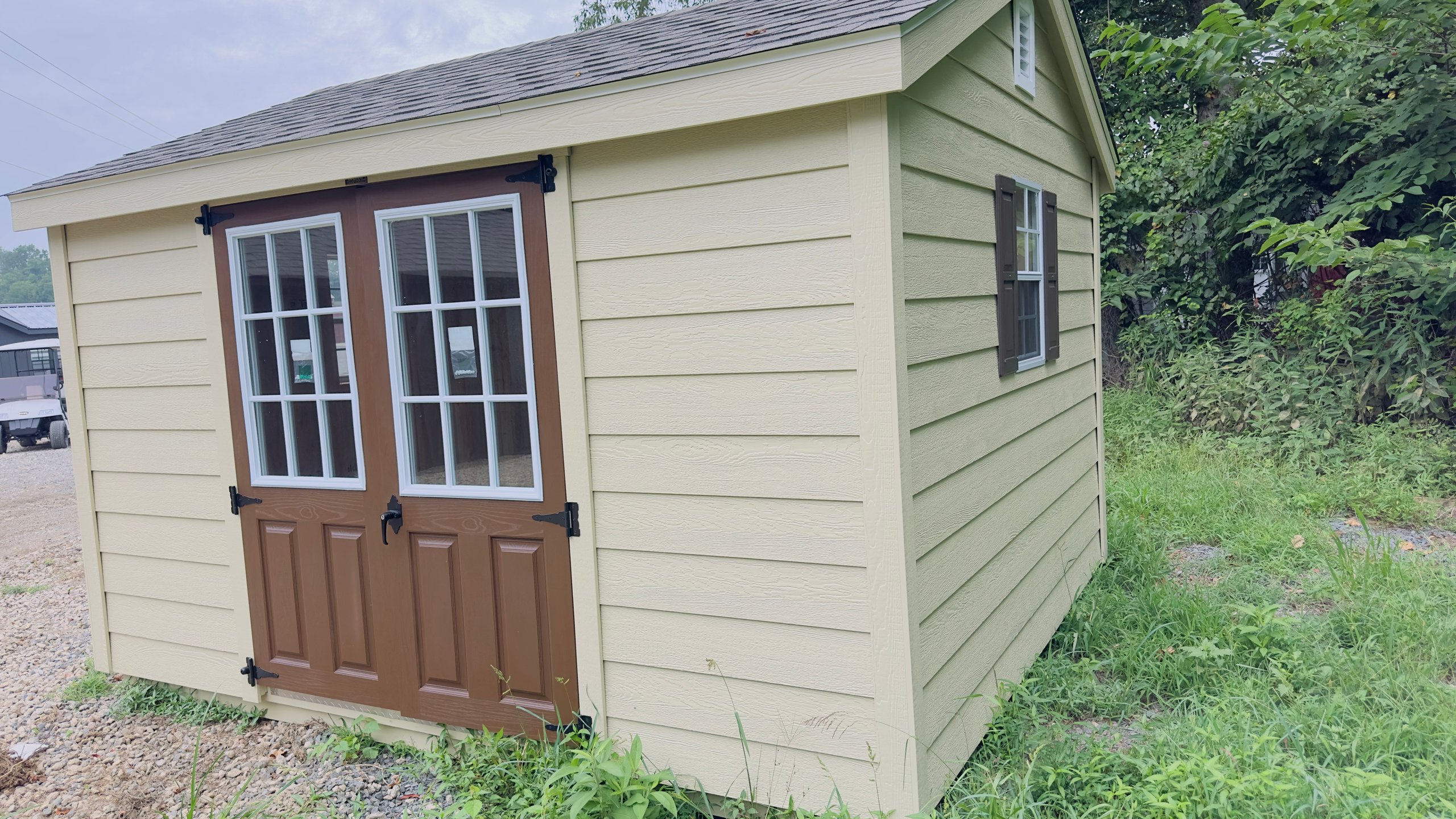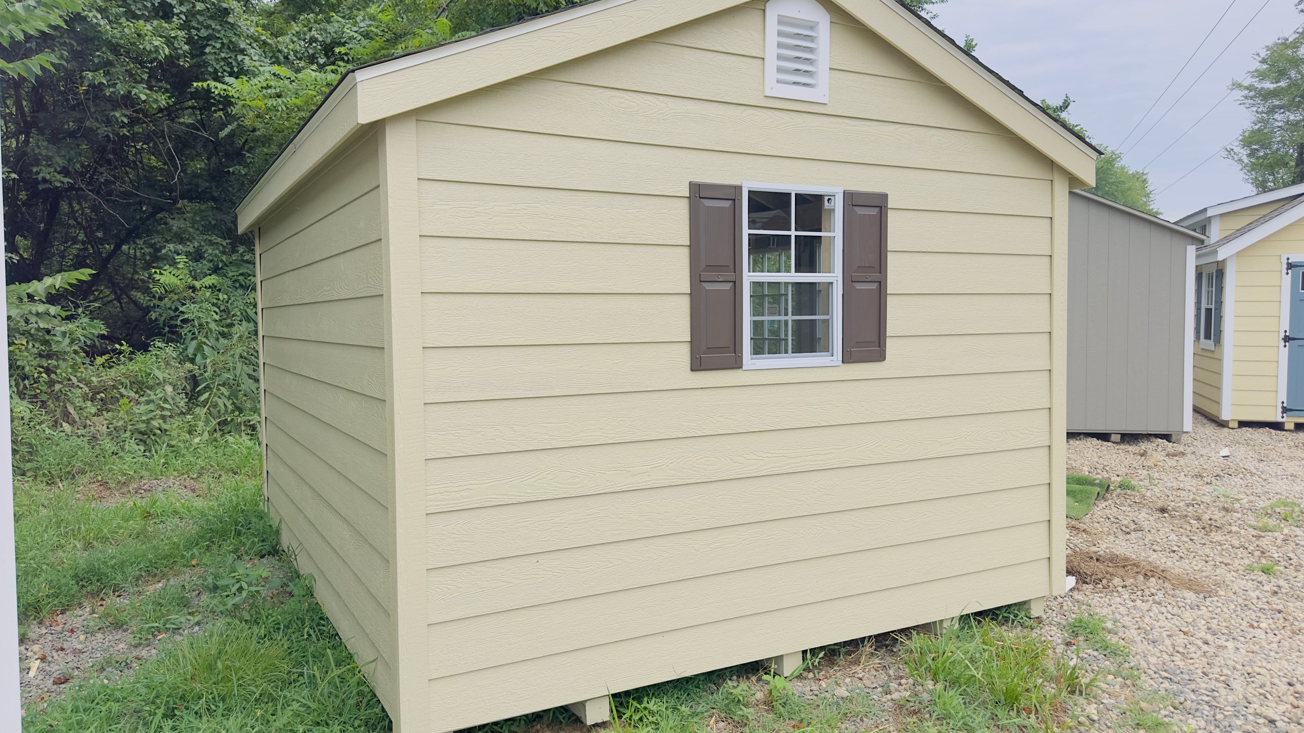 This 10×12 A-Frame shed, finished in Compass Beige siding with matching trim and a WeatherWood roof, offers timeless design with practical enhancements. Built with durable LP Smart Panel siding and sturdy LP ProStruct flooring, it’s made to last while maintaining a clean, neutral appearance. The upgraded fiberglass double doors include 9-lite glass inserts, adding both natural light and a refined touch. Deluxe garden vents improve airflow, making this shed a functional storage solution for tools, equipment, or hobby space. With its balanced design and thoughtful upgrades, the A-Frame delivers everyday usefulness wrapped in classic, understated style.
