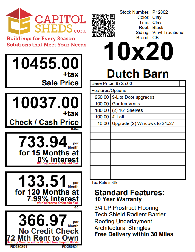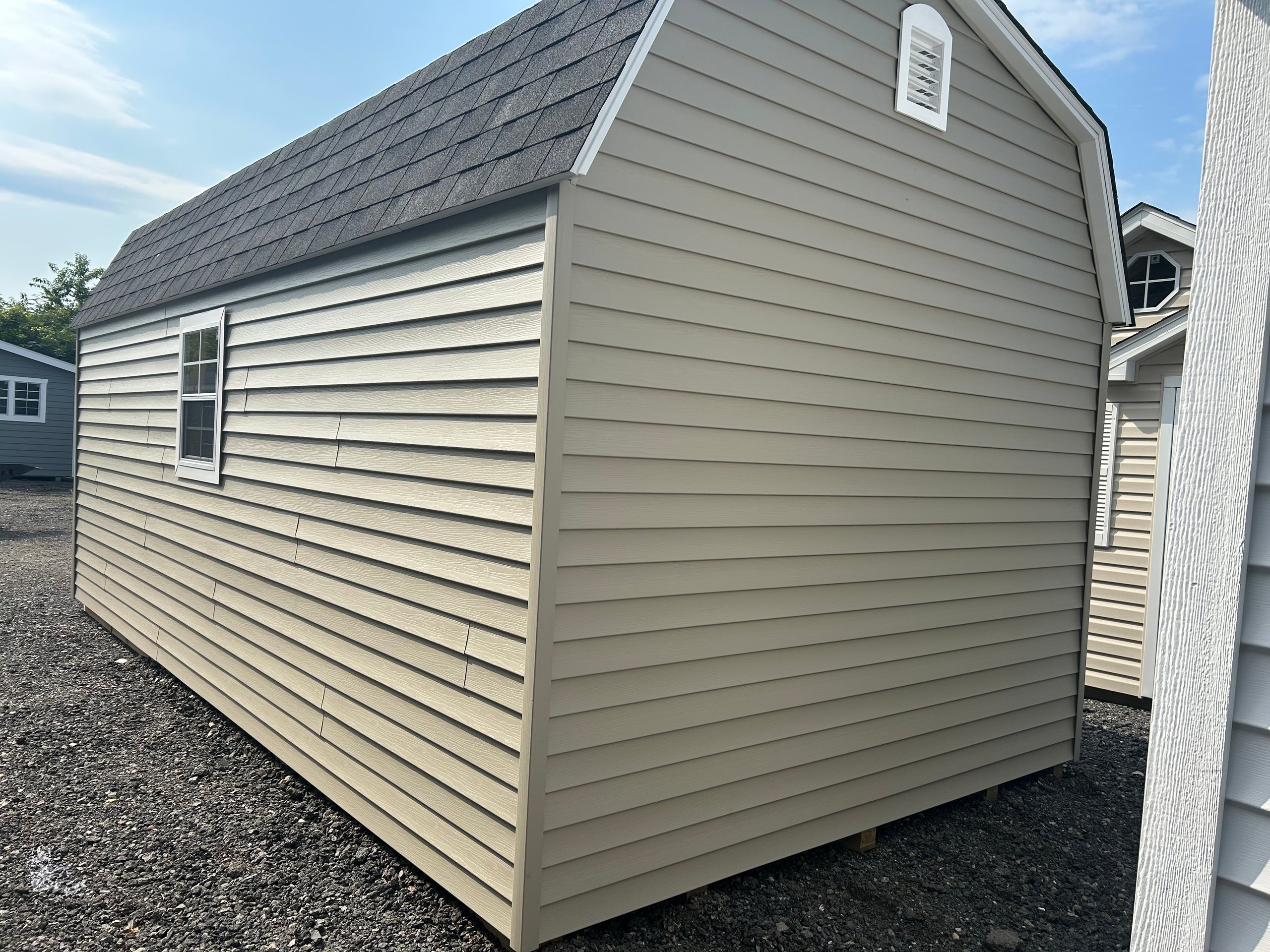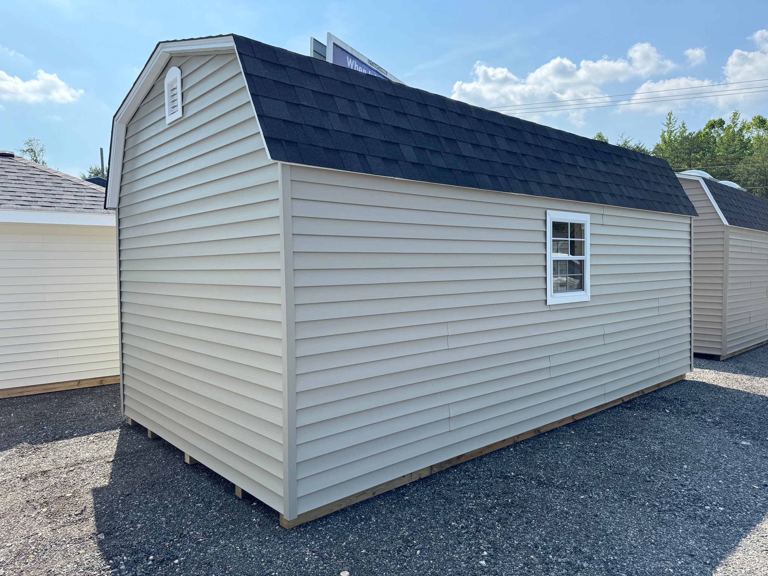 Maximize your storage space in style with this 10×20 Dutch Barn, handcrafted by Amish builders for superior quality and durability. Featuring clay vinyl siding, matching trim, and a black dimensional shingle roof, this shed blends seamlessly with any property. Built with 2×4 framing 16″ on center, LP Prostruct flooring, and a Tech Shield roof, it’s made to last. Enjoy upgraded features like a 9-lite fiberglass door, garden vents, two windows, two 16″ shelves, and a 4′ loft—perfect for organizing tools, seasonal décor, and more. Smart, stylish, and built to endure—this is storage done right.