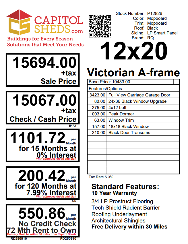 Reserve this building for a $500 deposit. Within 1 business day a rep will contact you to discuss delivery details and discounts you may qualify for such as cash/check, military/1st responder, etc. Don’t lose out on this beautiful building – Place your deposit today to hold it!