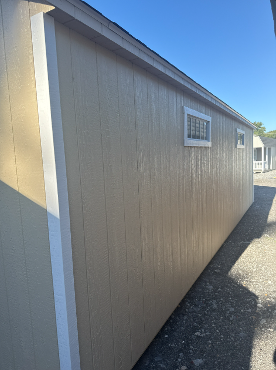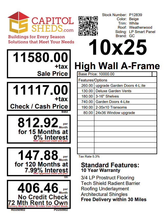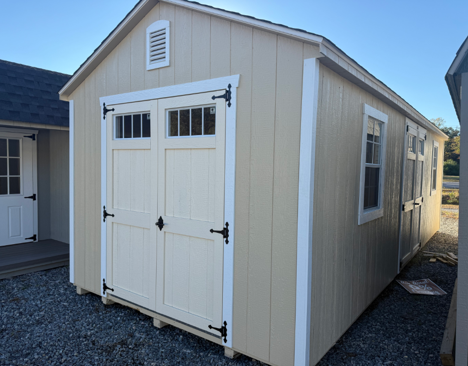 Introducing the Traditional High Wall A-Frame -A masterpiece of craftmanship by the Amish artisans. This 10×25 High Wall A-Frame is built to endure, offering exceptional quality and functionality for all your storage needs. The High Wall A-Frame siding provides superior durability while exuding timeless elegance in Beige, complemented by pristine White. The Weatherwood colored dimensional shingles protect your belongings from the elements ensuring long-lasting reliability. With 3-doors for easy access, the interior boasts 2×4 stud wall framing, 2×4 rafter roof framing, and LP Tech Shield roof sheeting for added strength. The LP Prostruct Flooring, coupled with pressure-treated 2×4 floor joists ensures stability and longevity. invest in the High Wall A-Frame for a storage solution that’s built to last.