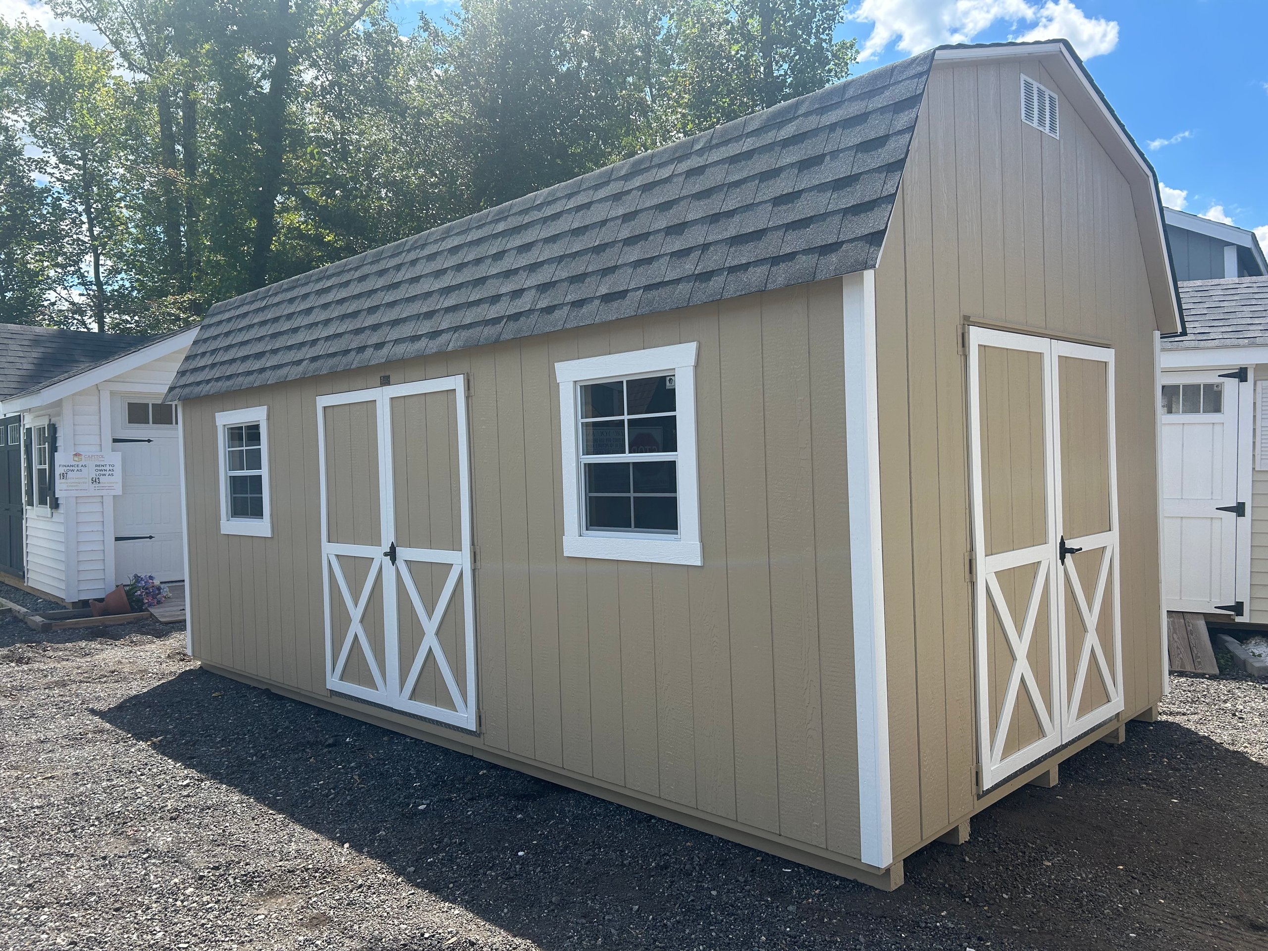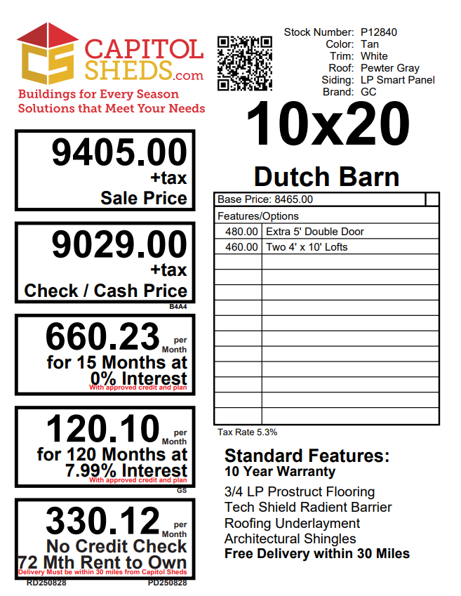 This 10×20 Amish-built Dutch Barn offers timeless style with exceptional storage capacity. Featuring durable Smart Panel siding in Tan with crisp White trim and a Pewter Gray dimensional shingle roof, it’s built to last. The structure includes two windows, two doors (with an added 5′ double door upgrade), and two spacious 4′ x 10′ lofts for maximizing overhead storage. Crafted with 2×4 studs and rafters 16″ on center, LP Tech Shield roof sheathing, and LP Prostruct flooring over pressure-treated joists, this shed delivers strength and functionality. Perfect for storing equipment, seasonal items, or transforming into a workshop or hobby space.