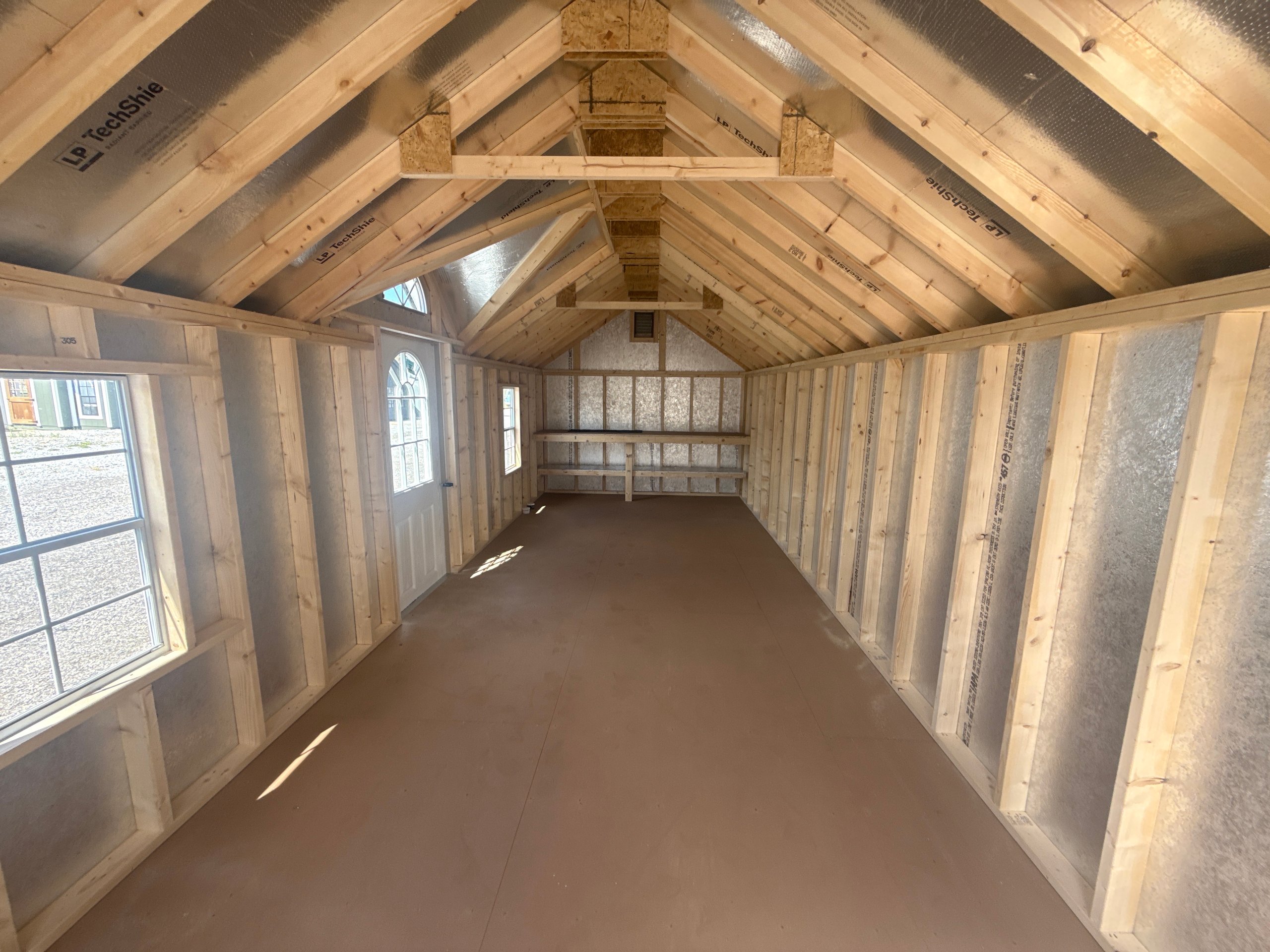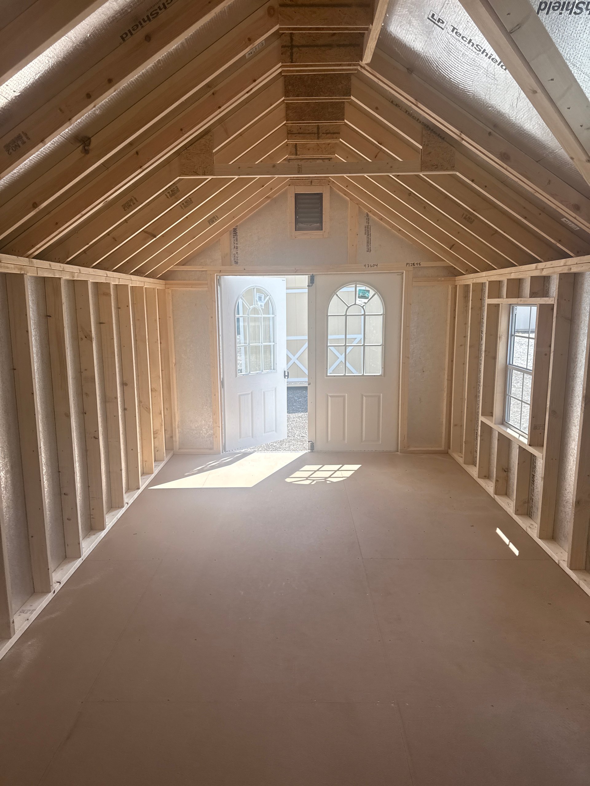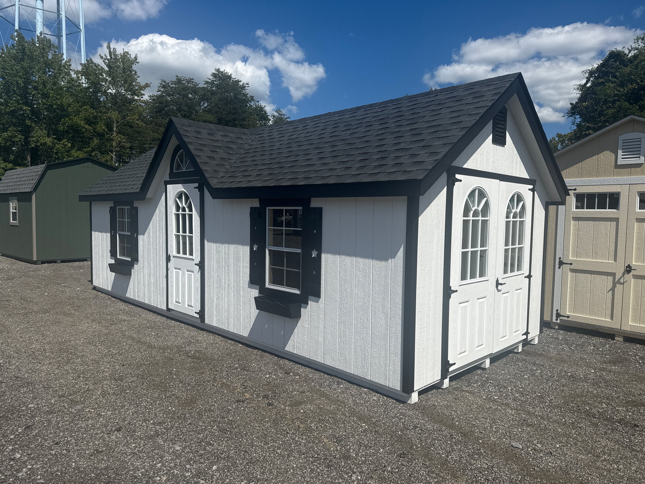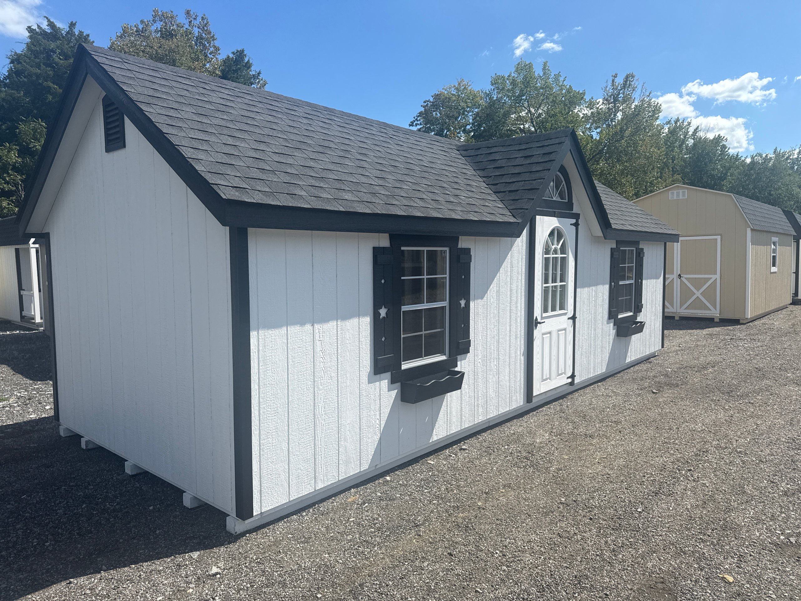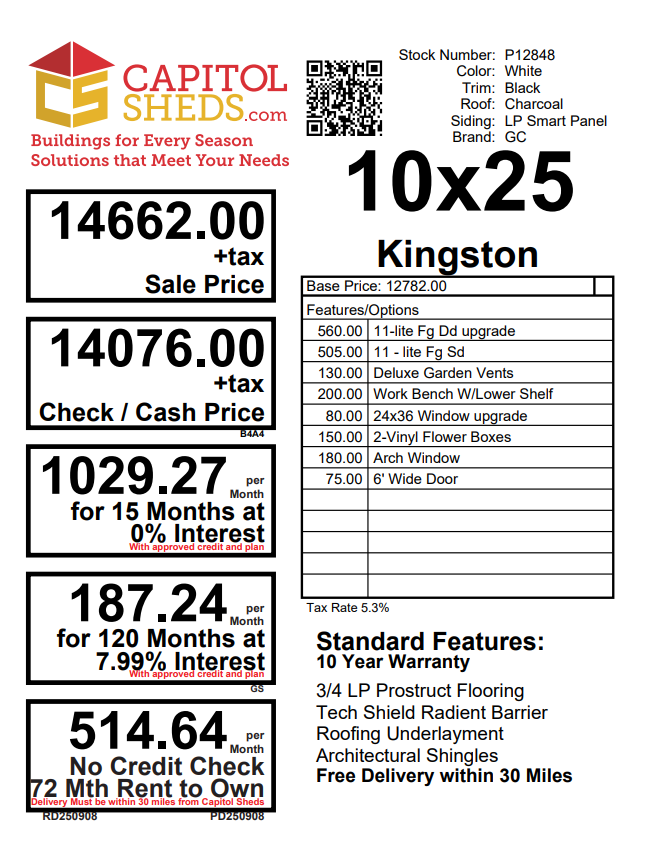 Introducing the Traditional Dutch Barn -A masterpiece of craftmanship by the Amish artisans. This 10×25 Kingston is built to endure, offering exceptional quality and functionality for all your storage needs. The Kingston siding provides superior durability while exuding timeless elegance in White, complemented by pristine Black. The Charcoal colored dimensional shingles protect your belongings from the elements ensuring long-lasting reliability. With 3-doors for easy access, the interior boasts 2×4 stud wall framing, 2×4 rafter roof framing, and LP Tech Shield roof sheeting for added strength. The LP Prostruct Flooring, coupled with pressure-treated 2×4 floor joists ensures stability and longevity. invest in the Kingston for a storage solution that’s built to last.