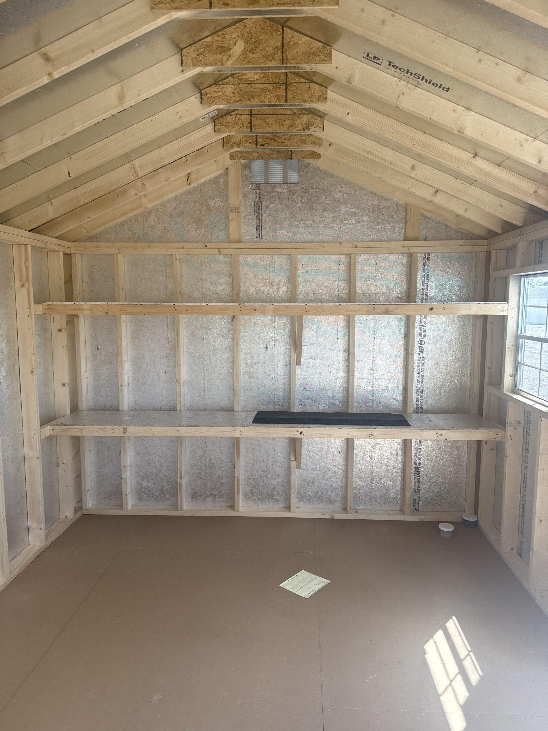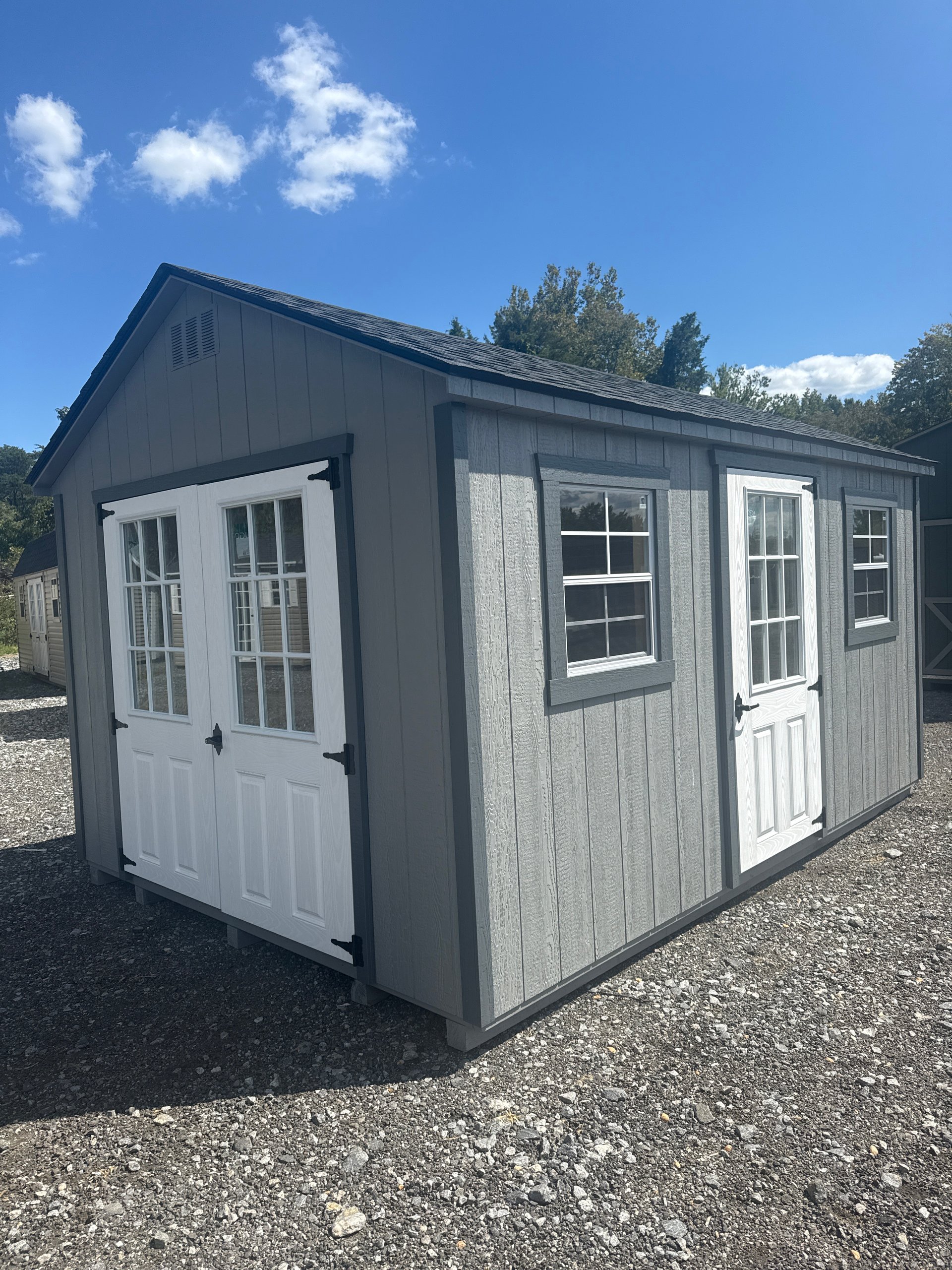 Introducing the Traditional A-Frame -A masterpiece of craftmanship by the Amish artisans. This 10×14 A-Frame is built to endure, offering exceptional quality and functionality for all your storage needs. The A-Frame siding provides superior durability while exuding timeless elegance in Ronks Gray , complemented by pristine Dark Gray. The Charcoal colored dimensional shingles protect your belongings from the elements ensuring long-lasting reliability. With 3-doors for easy access, the interior boasts 2×4 stud wall framing, 2×4 rafter roof framing, and LP Tech Shield roof sheeting for added strength. The LP Prostruct Flooring, coupled with pressure-treated 2×4 floor joists ensures stability and longevity. invest in the A-Frame for a storage solution that’s built to last.