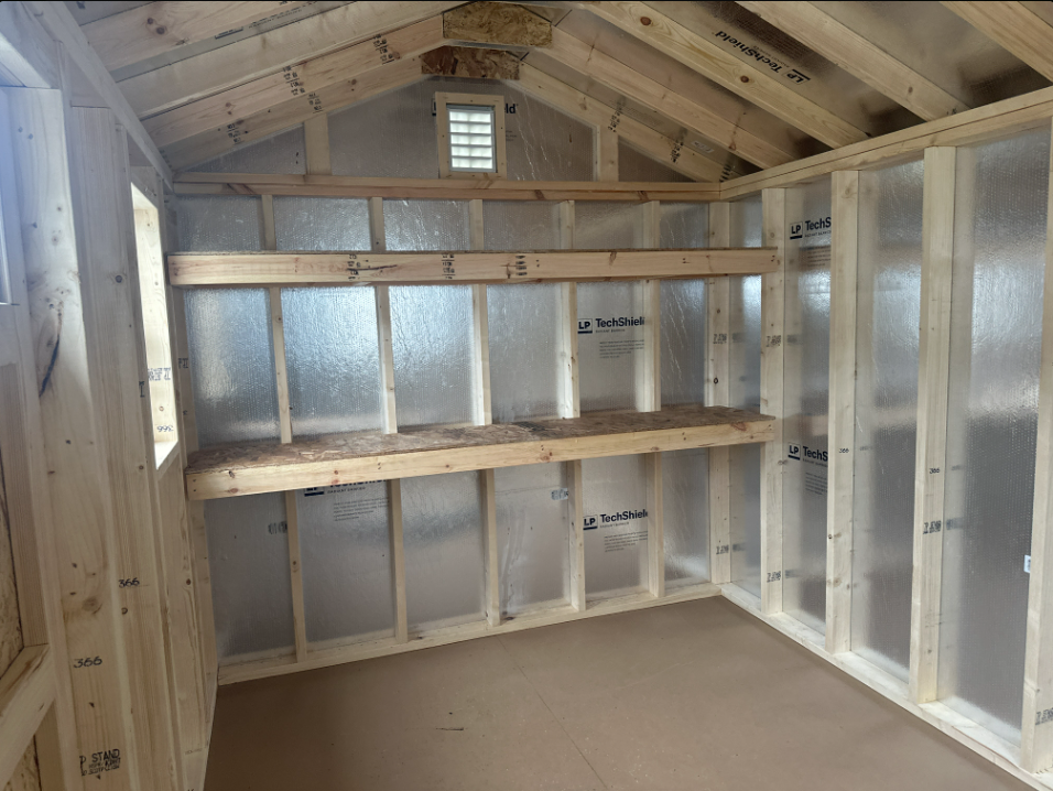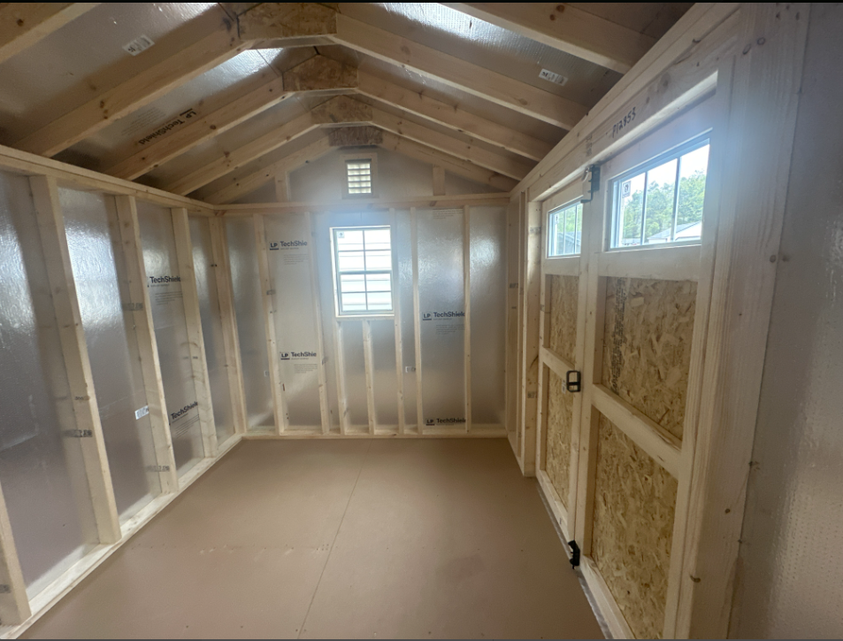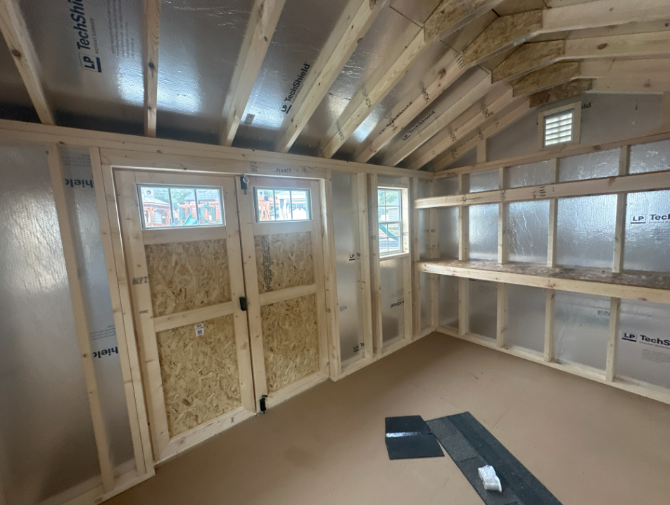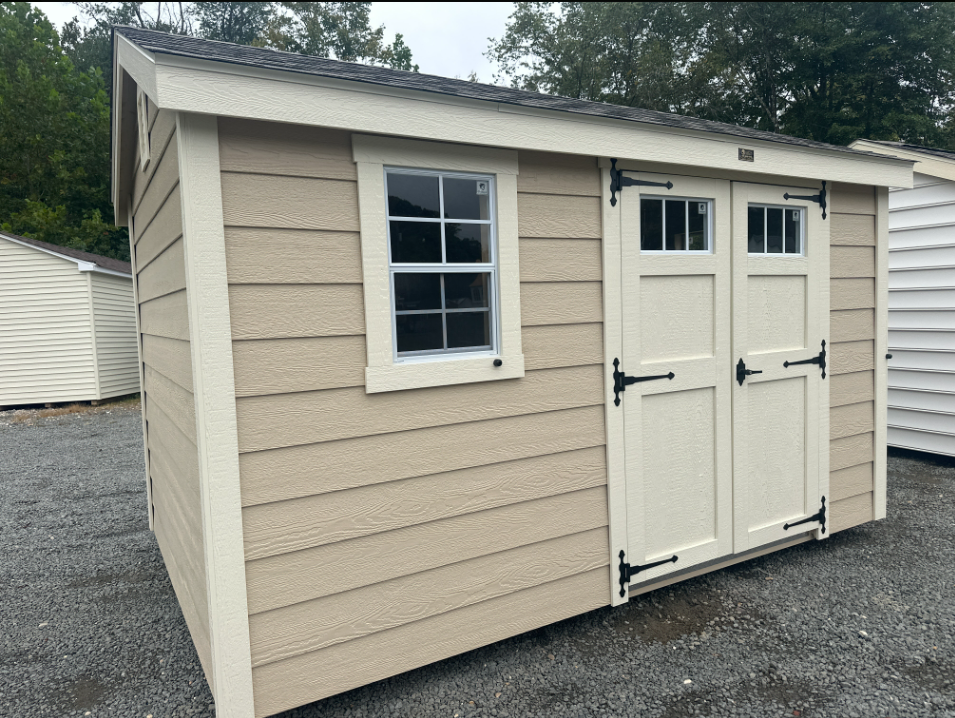 This 8×12 A-Frame shed is designed for style, durability, and functionality. Constructed with LP Smart Lap siding in Tan and accented with Navajo trim, it features a Weatherwood roof with architectural shingles and LP Tech Shield underlayment for superior weather resistance. The 4′ double garden door allows easy access, while two windows provide natural light, and shelving for storage. Built with 2×4 framing, pressure-treated joists, and 3/4-inch LP Prostruct flooring, this shed delivers long-lasting strength and versatility—ideal for storing tools, equipment, or creating a functional workspace.