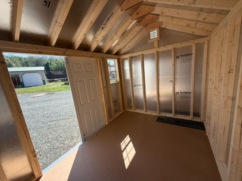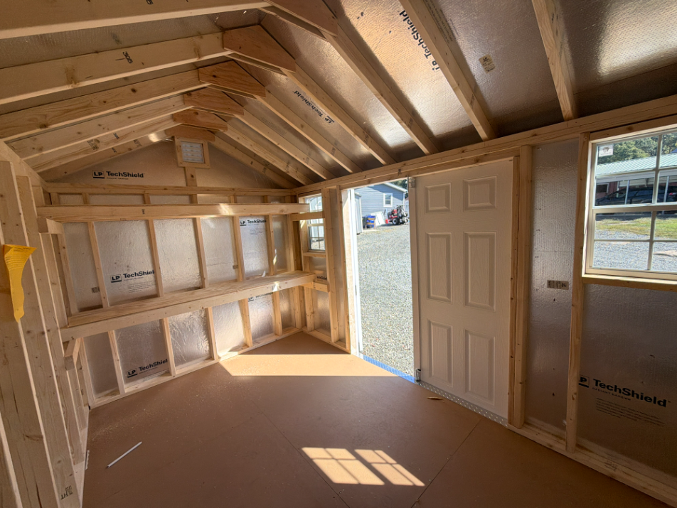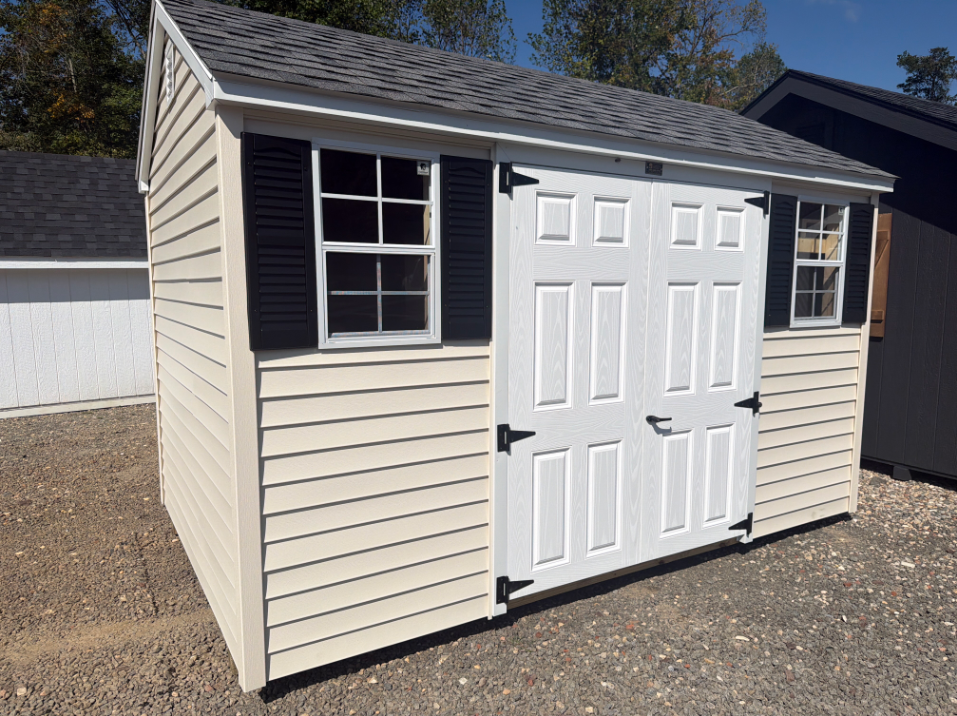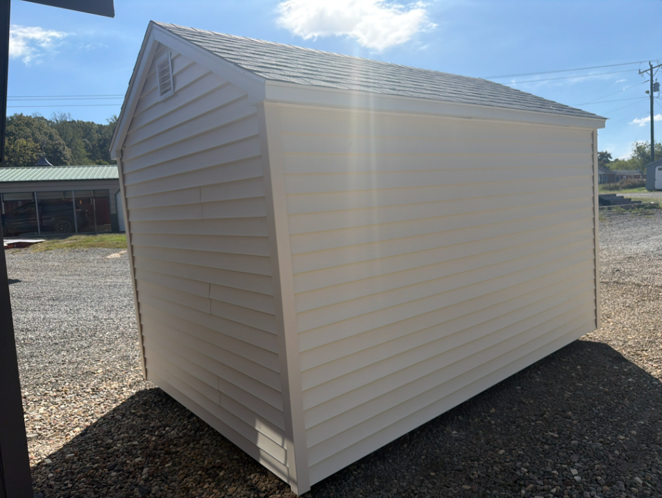 The 8×12 A-Frame combines timeless charm with durable craftsmanship. Built with Traditional Vinyl siding in Pearl with crisp White trim, it features a Slatestone Gray dimensional shingle roof with roof felt underlayment and LP Tech Shield sheeting for maximum protection. Inside, pressure-treated 2×4 joists 12″ on center support LP Prostruct flooring, while 2×4 wall studs and rafters 16″ on center provide lasting strength. Shelving, two slider windows with shutters, enhance natural light and curb appeal, upgrade 5′ double door.