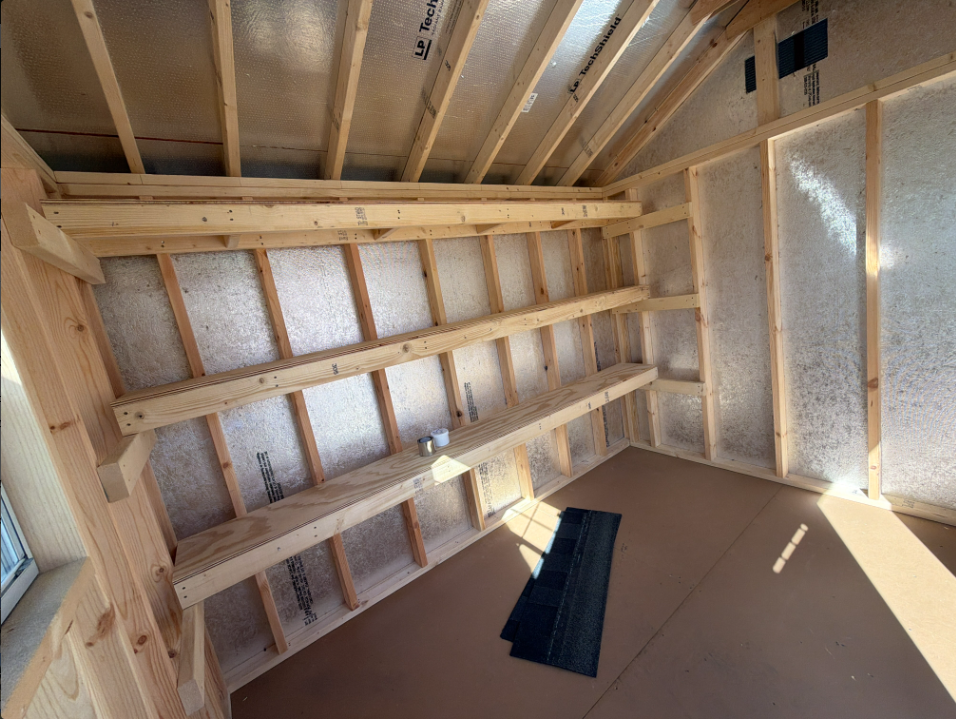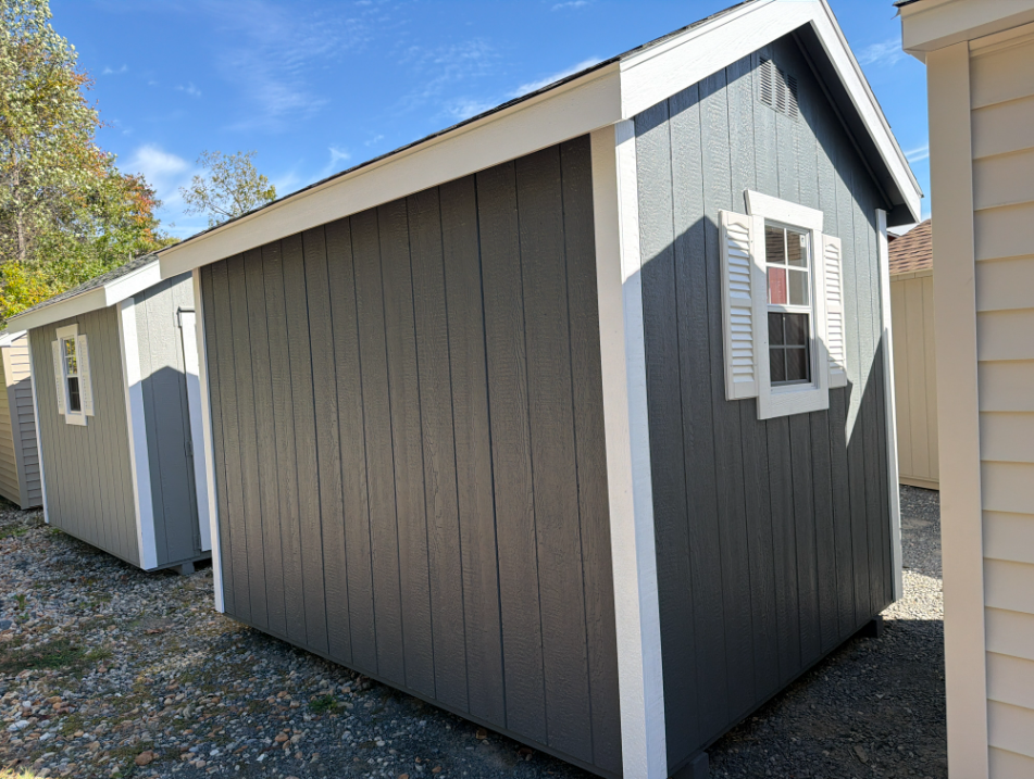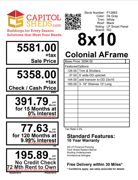 Style Name: Colonial A-Frame Size: 8×10 Siding: LP Smart Panel Main Color: Dark Gray Trim Color: White Roof Color: Black Roofing: Dimensional Shingles Roofing Underlayment: Roof Felt Number of Windows: 2 Number of Doors: 1 Wall Framing: 2×4 studs 16 inches on center Roof Framing: 2×4 rafters 16 inches on center Roof Sheeting: LP Tech Shield Flooring: LP Prostruct Flooring Floor Joists: Pressure Treated 2×4 joists 12 inches on center Included Upgrades: Added Shutters with trim wood shelves 16″ wide