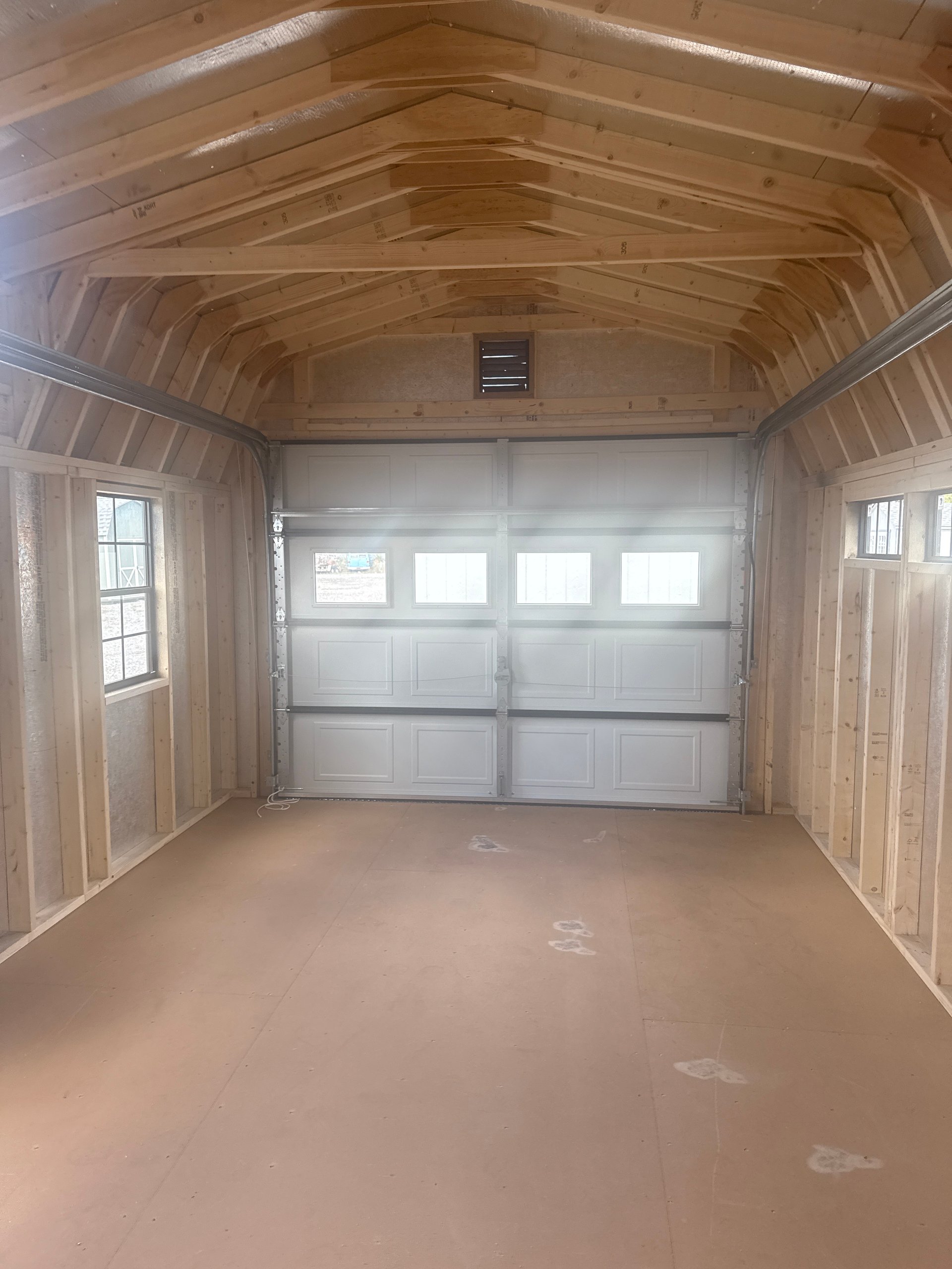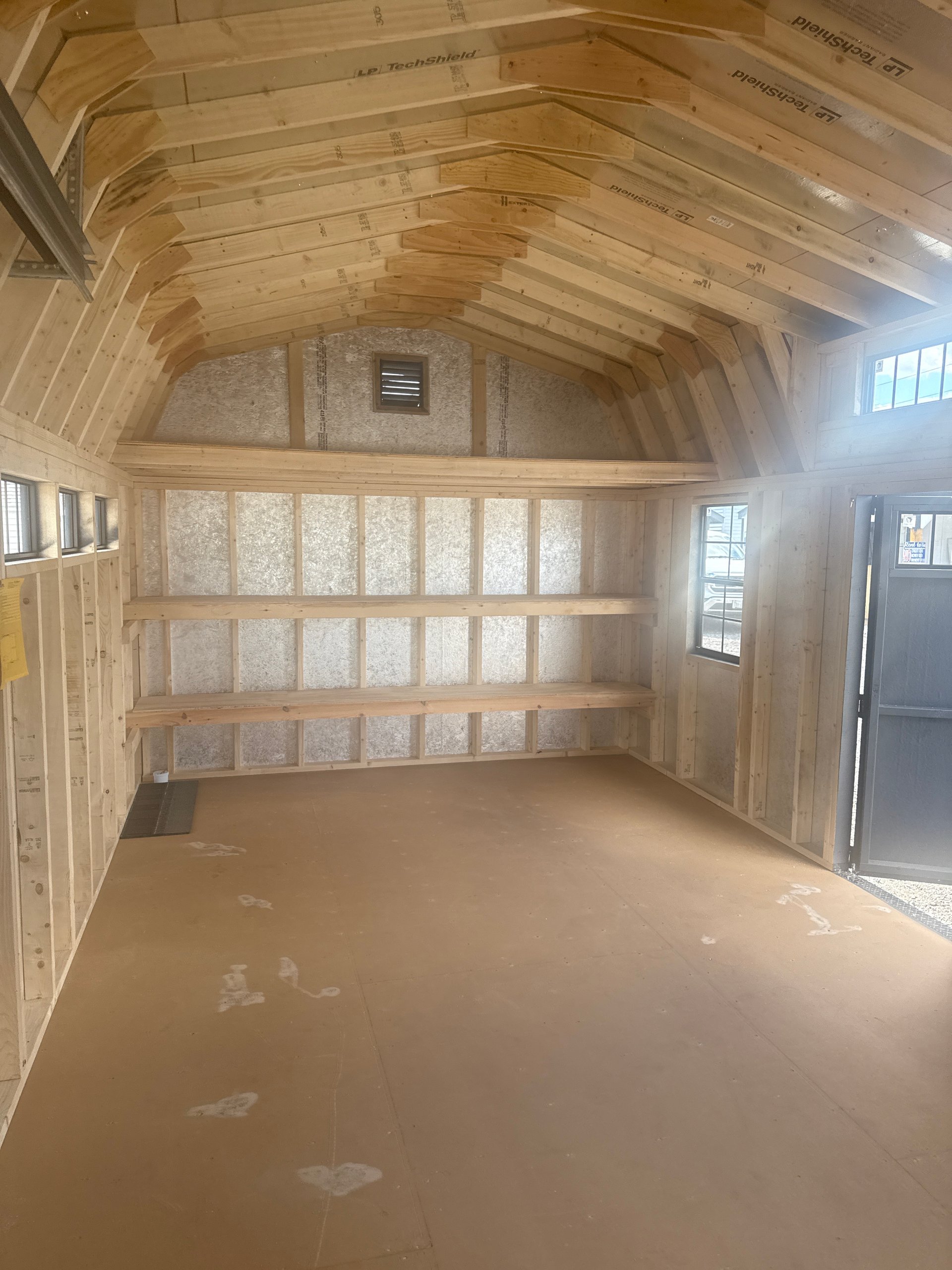 This 12×21’8″ Colonial Dutch Barn showcases timeless sophistication with its all–Mopboard Black LP Smart Panel exterior and matching trim. Featuring thirteen upgraded black windows, including 26×36 panes and six sleek 29×10 transoms, this structure offers abundant natural light and refined symmetry. The 9×7 garage door with black windows and a transom-accented double door complete the upscale design. Inside, a 4′ deep loft expands vertical storage, while two-tier 16′ shelves provide organization and workspace. Victorian end vents and a three-window transom dormer enhance both charm and ventilation. Built on durable 3/4 LP Prostruct flooring, this barn blends beauty and function effortlessly.
