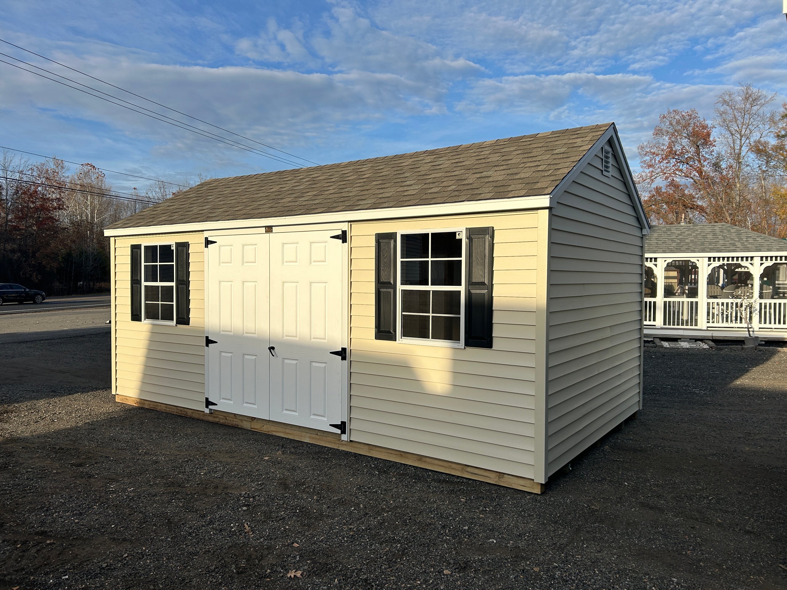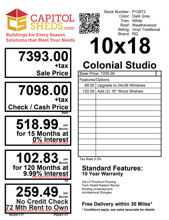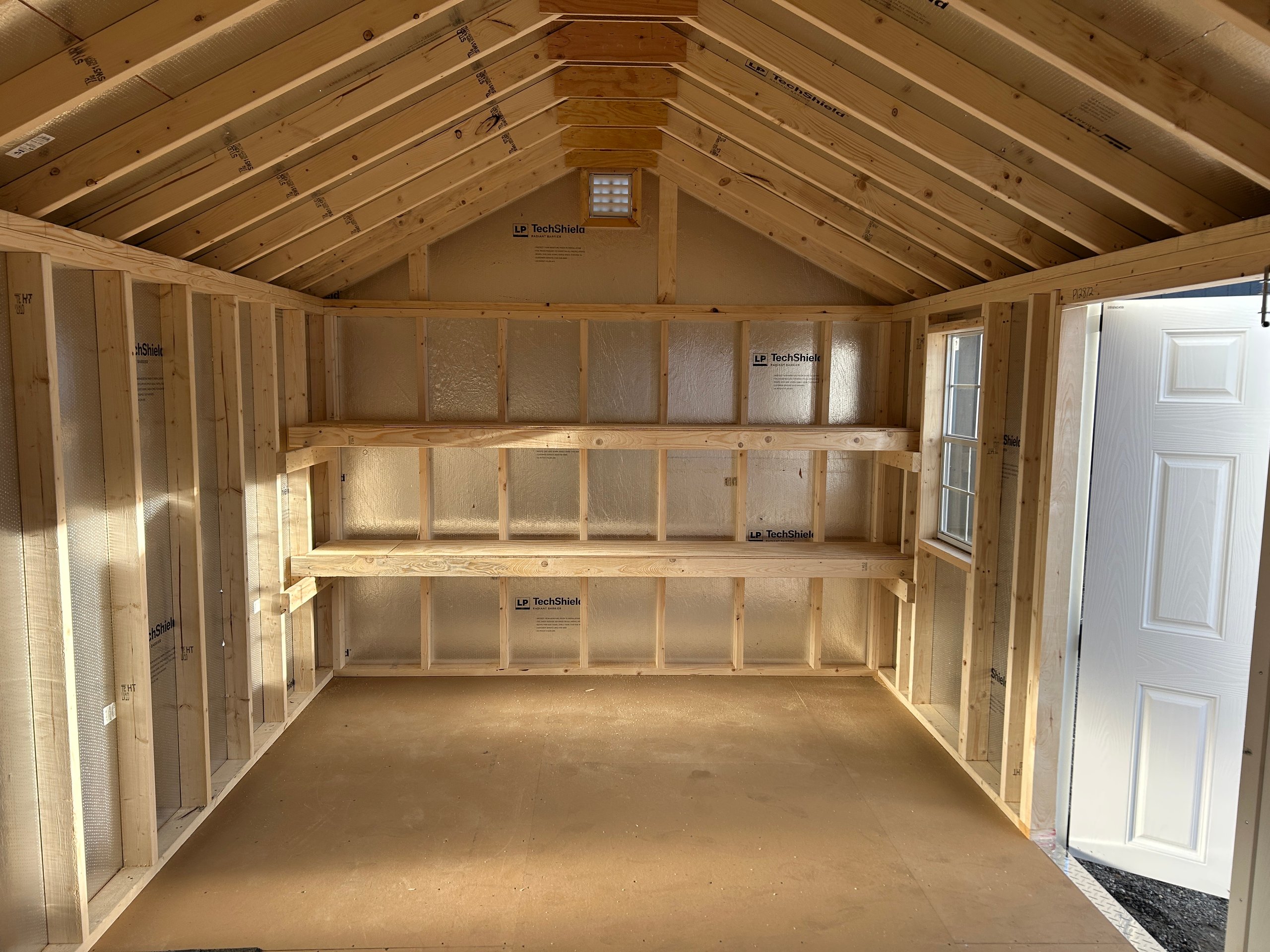 The 10×18 Standard A-Frame offers dependable quality and clean visual appeal, making it a strong fit for a wide range of storage and workspace needs. Finished in Almond vinyl siding with crisp White trim and a Weatherwood architectural shingle roof, it delivers a polished, long-lasting exterior. Built with 2×4 framing 16″ on center, LP Tech Shield roof sheeting, LP ProStruct flooring, and pressure-treated floor joists, this structure provides reliable strength throughout. Upgraded 24×36 windows bring in natural light, while two 16″ wood shelves enhance organization. This A-Frame delivers practical value with a refined, versatile design.