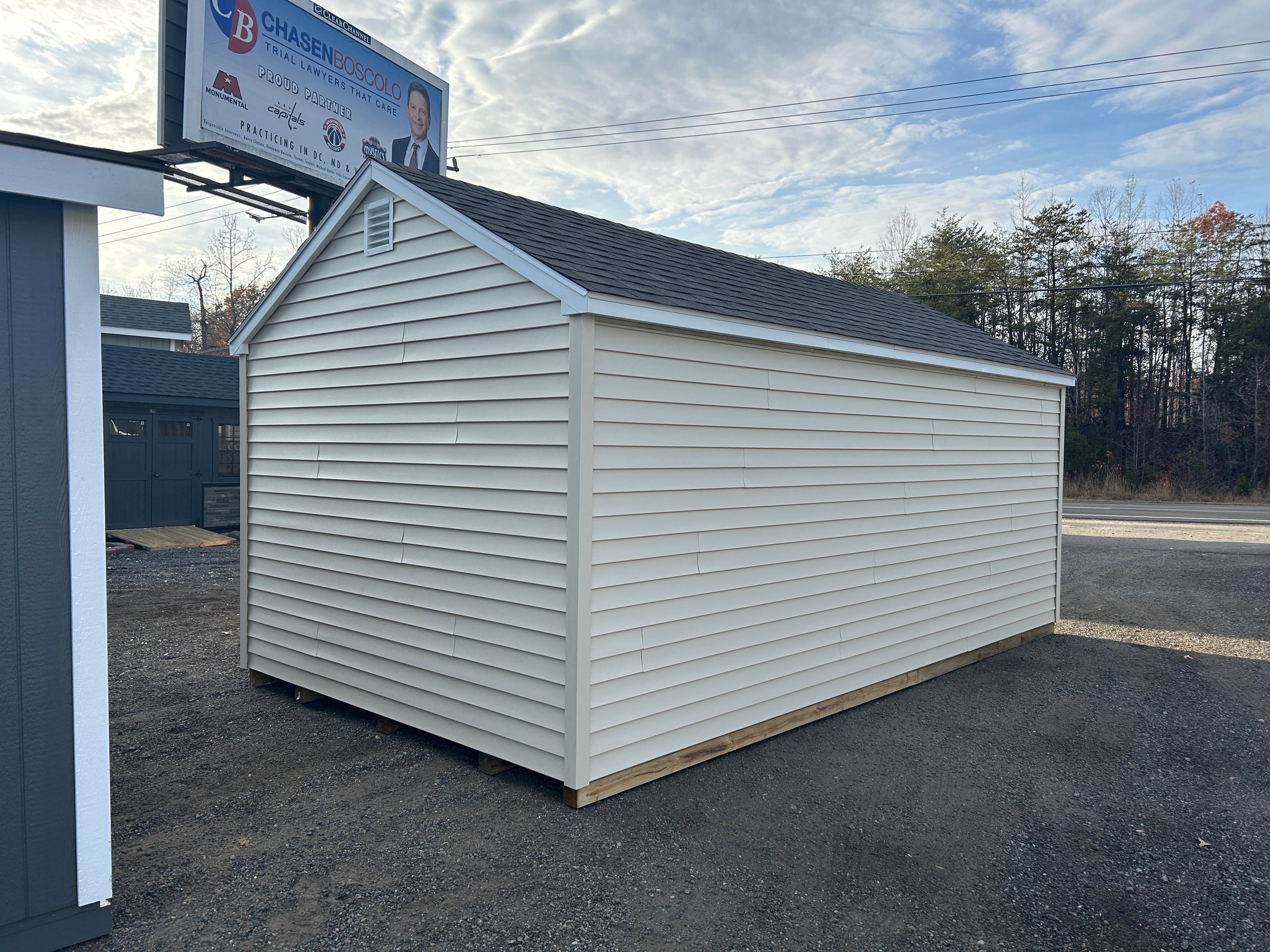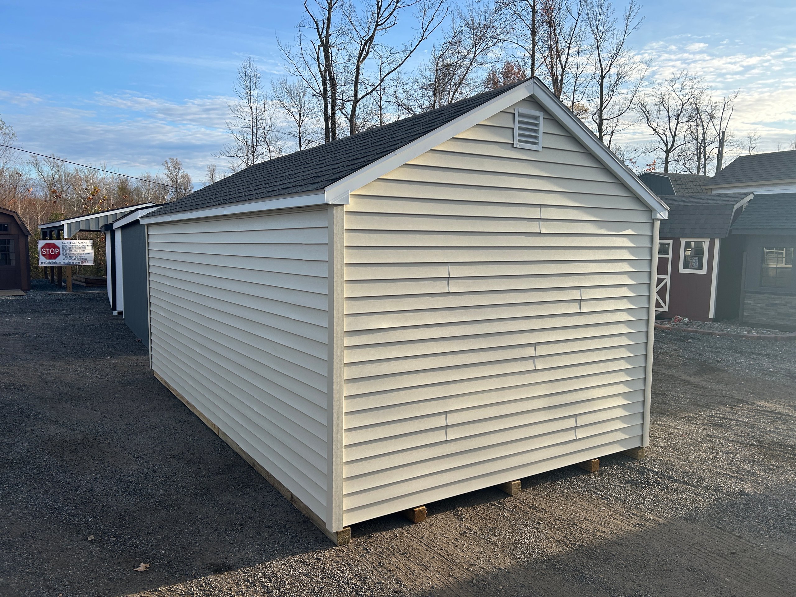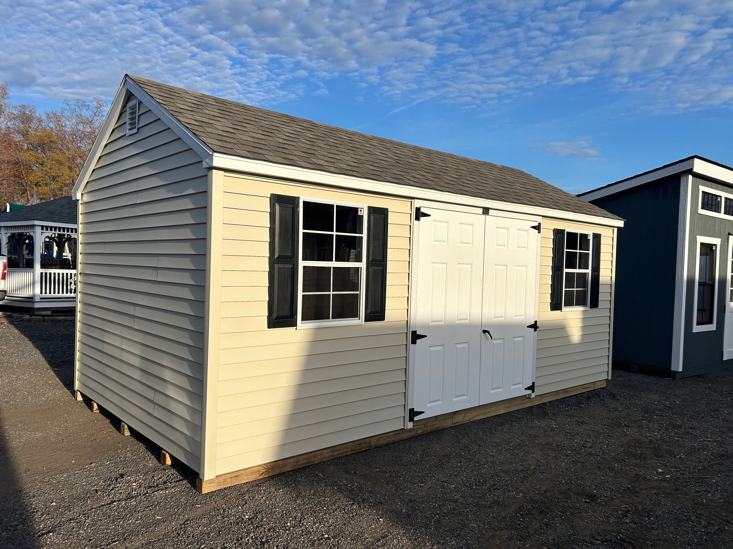 The 10×18 Standard A-Frame offers dependable quality and clean visual appeal, making it a strong fit for a wide range of storage and workspace needs. Finished in Almond vinyl siding with crisp White trim and a Weatherwood architectural shingle roof, it delivers a polished, long-lasting exterior. Built with 2×4 framing 16″ on center, LP Tech Shield roof sheeting, LP ProStruct flooring, and pressure-treated floor joists, this structure provides reliable strength throughout. Upgraded 24×36 windows bring in natural light, while two 16″ wood shelves enhance organization. This A-Frame delivers practical value with a refined, versatile design.