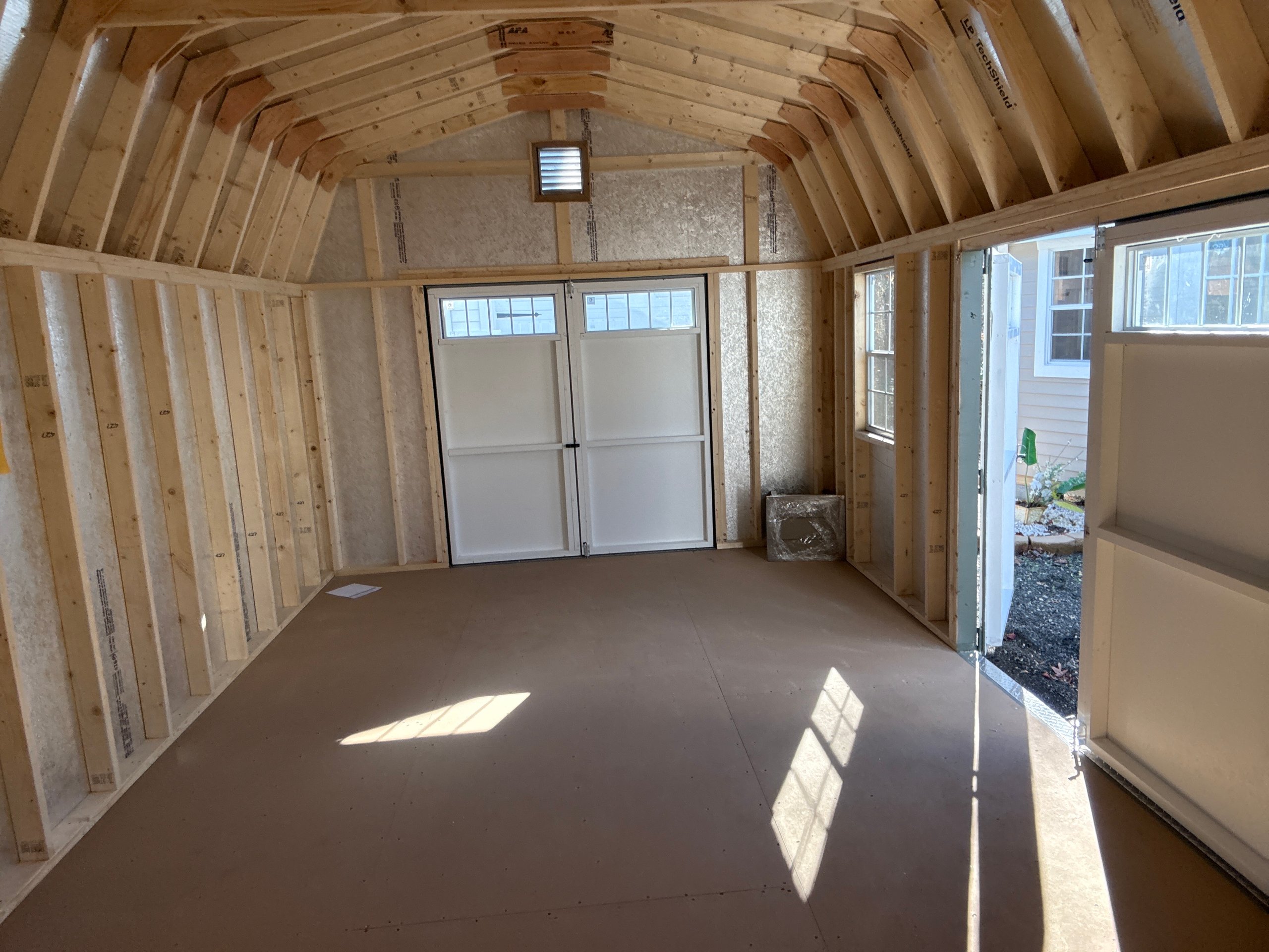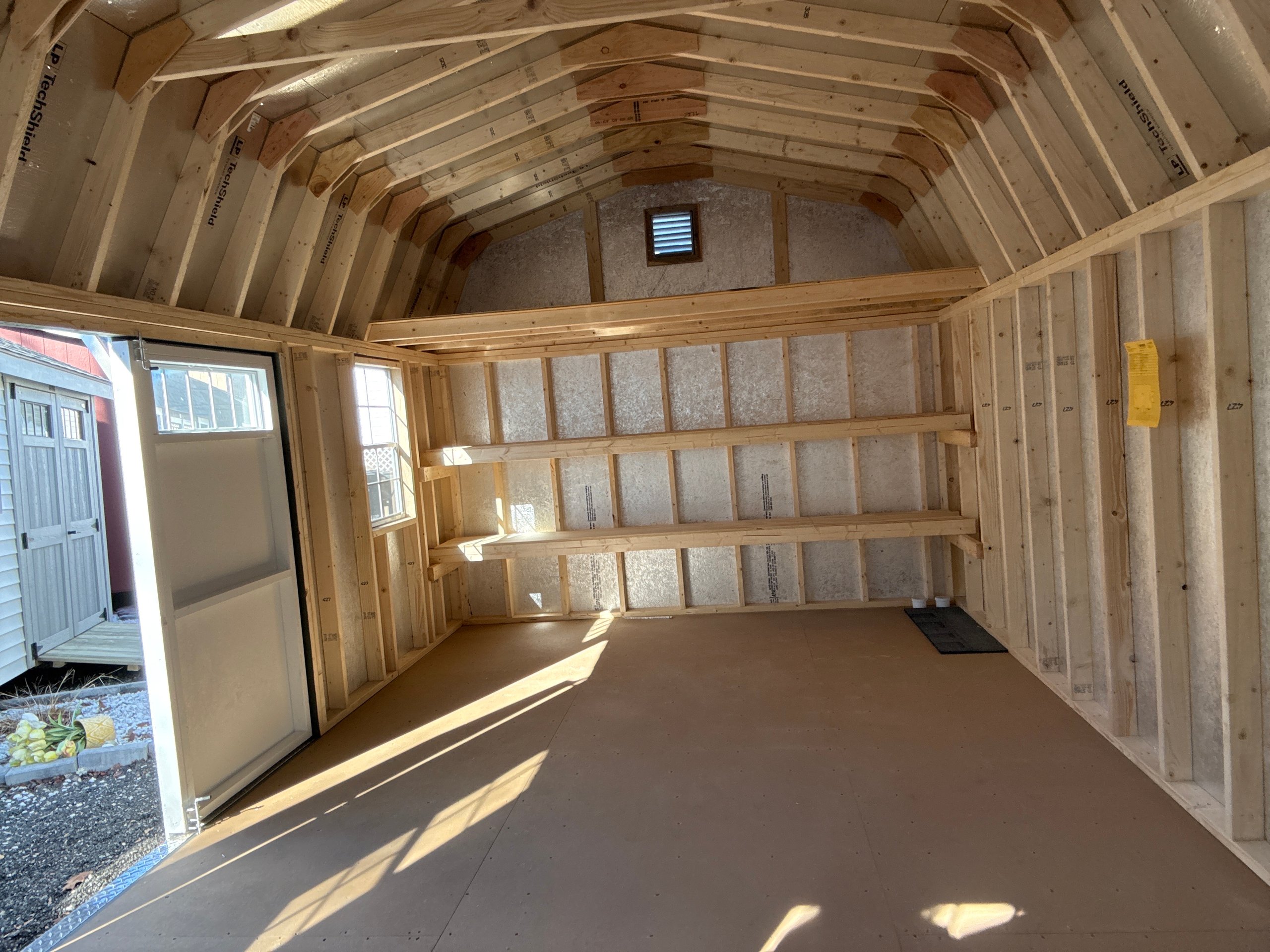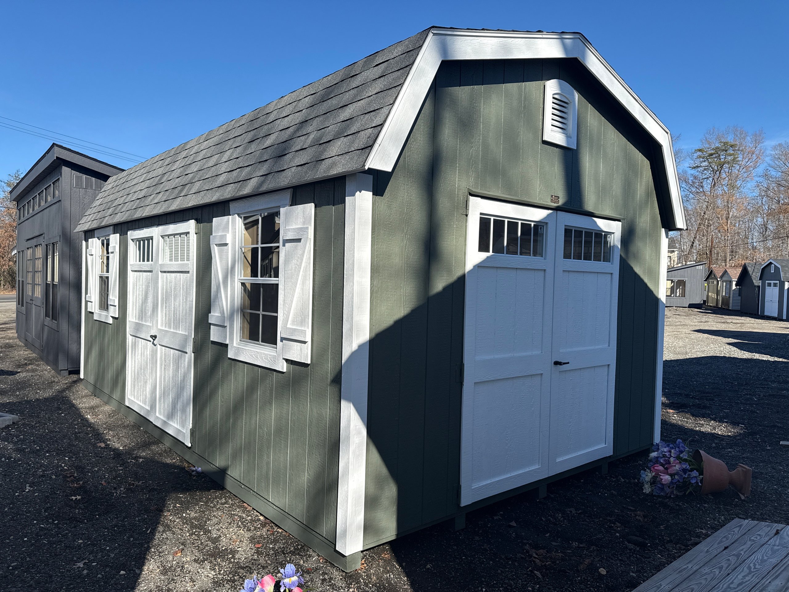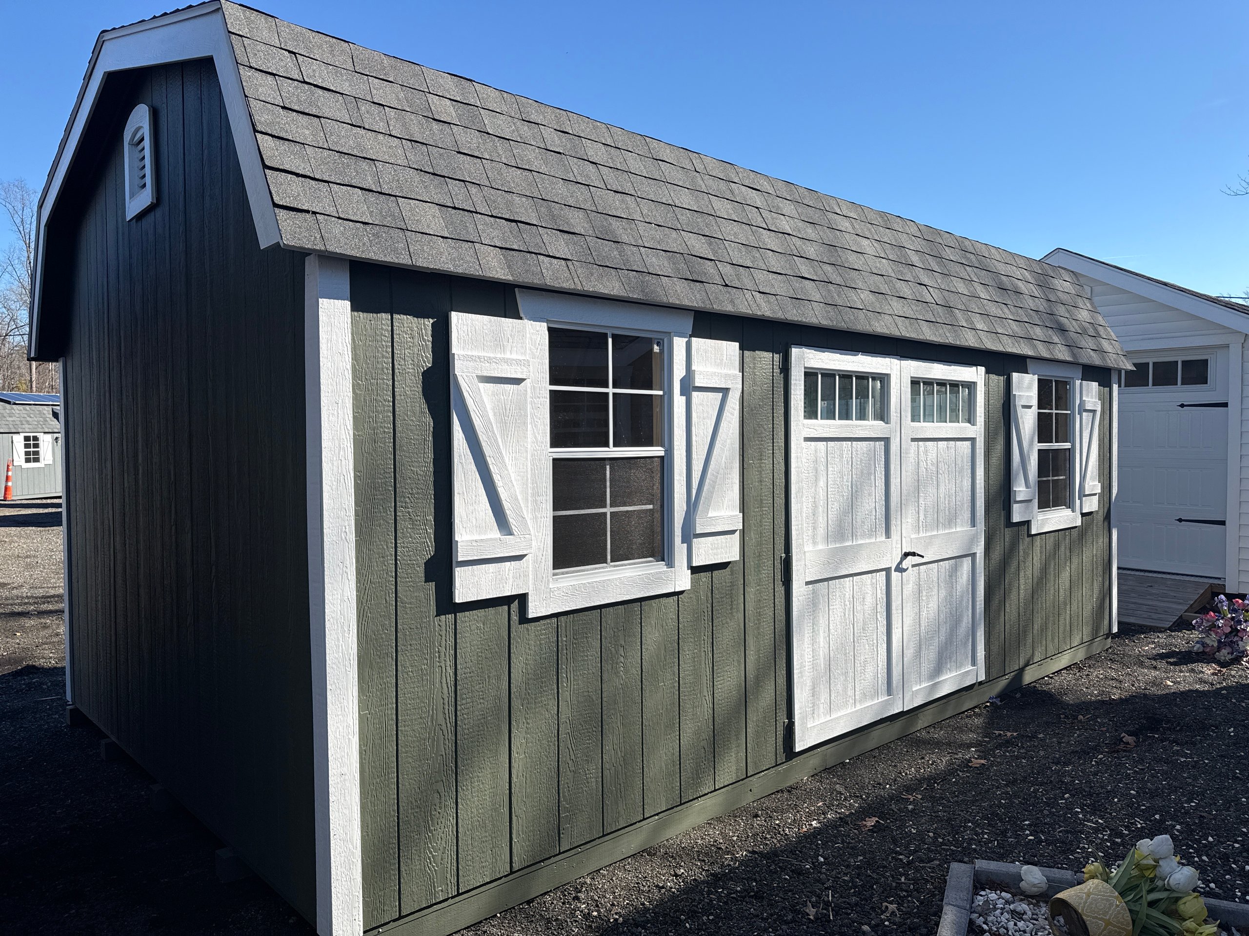 The Colonial Dutch Barn 12×20 combines classic barn styling with exceptional functionality and craftsmanship. Built with durable LP Smart Panel siding in Avocado with crisp white trim, this spacious structure offers impressive storage capacity with its signature high Dutch roofline. Inside, LP ProStruct flooring and pressure-treated 2×4 joists spaced 8″ on center create a strong, long-lasting foundation. Upgrades include a 6′ wooden double door, 29×10 transom windows, 24×36 window upgrades with Victorian shutters, Victorian vents, a 4′ loft for overhead storage, and two 16″ shelves. Finished with Virginia Slate dimensional shingles and LP Tech Shield roof sheeting, this barn is built for beauty and performance.