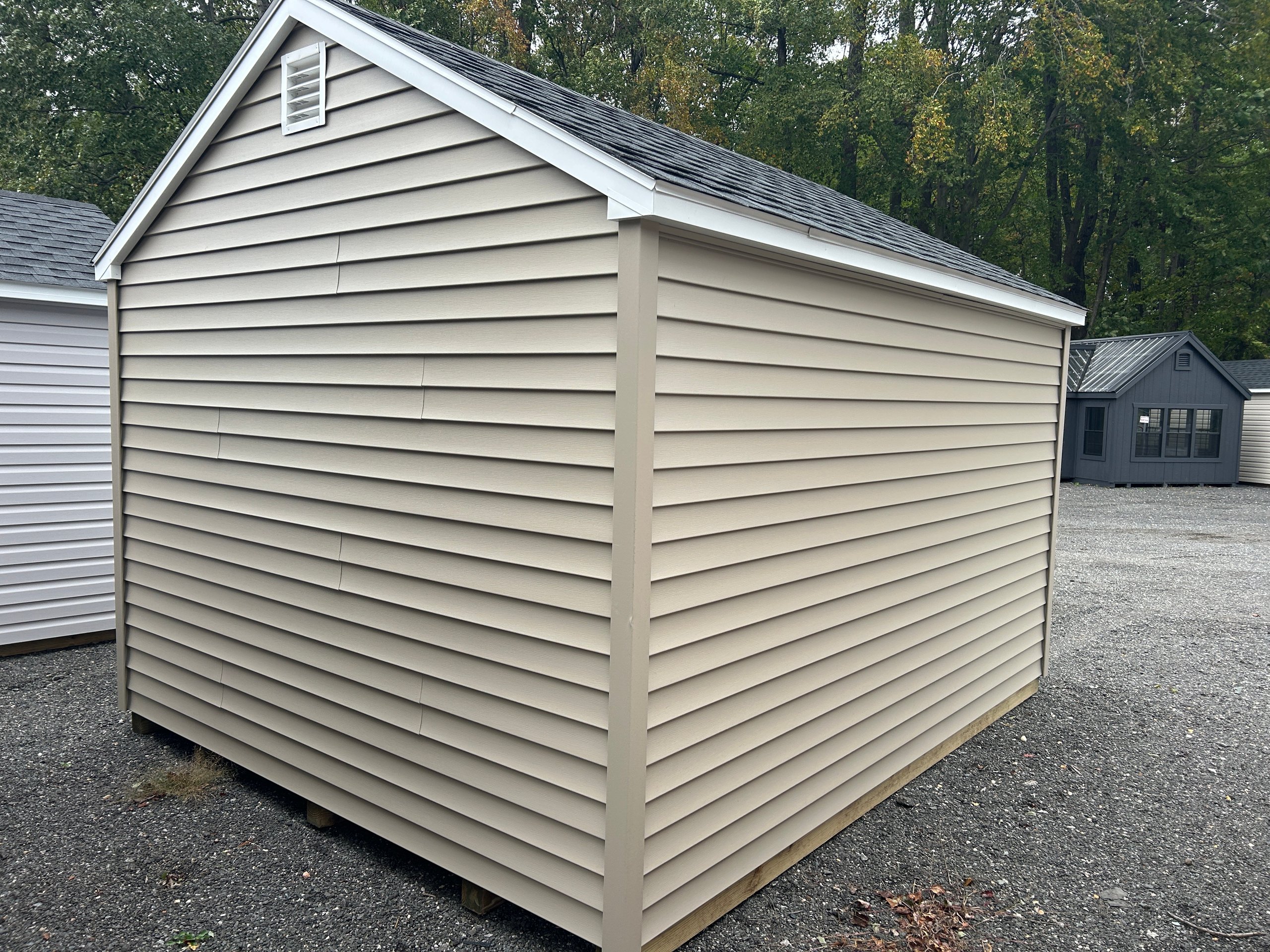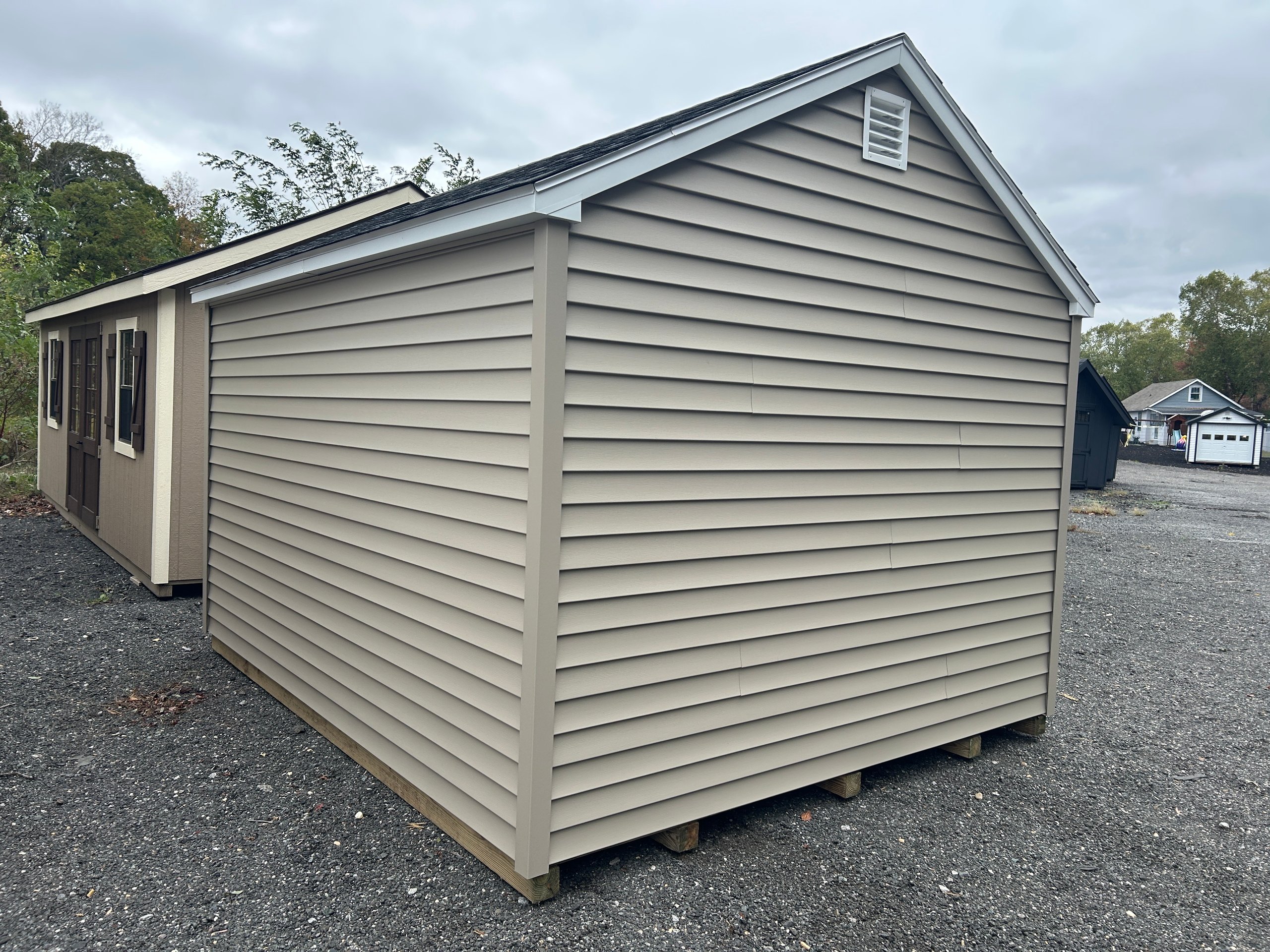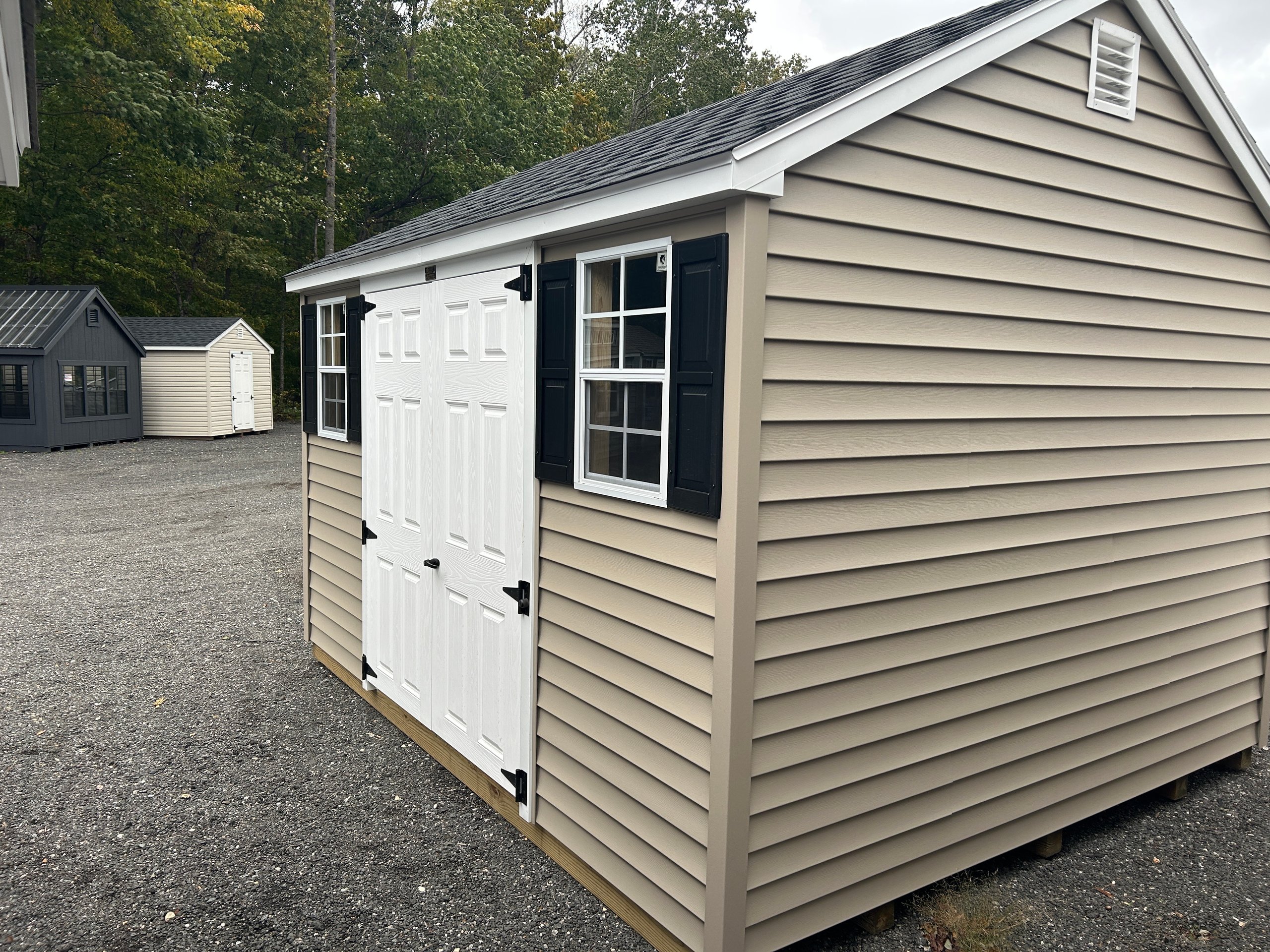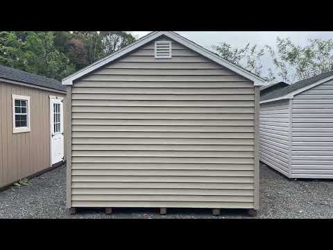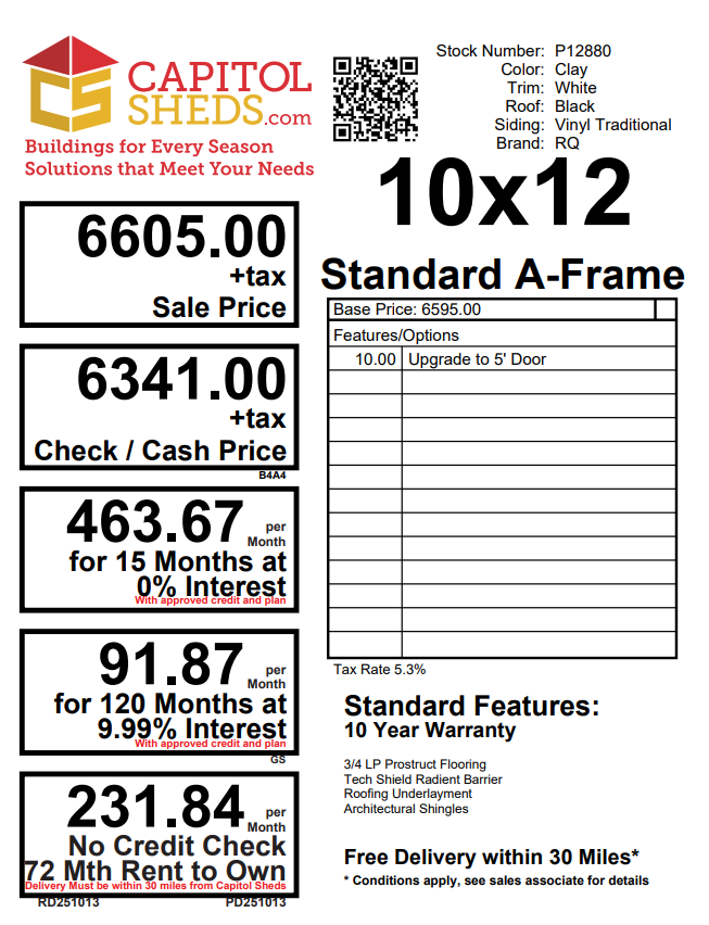 The 10×12 A-Frame offers timeless style and durable construction in a compact, versatile design. Featuring Traditional Vinyl siding in Clay with White trim and a Black architectural shingle roof, this structure delivers a clean, classic look that complements any property. Built with 2×4 framing and rafters 16″ on center, LP Tech Shield roof sheeting, and LP ProStruct flooring supported by pressure-treated joists 12″ on center, it’s engineered for long-term performance. Upgraded with a 5′ fiberglass door for added durability and convenience, this A-Frame combines everyday functionality with refined appeal.