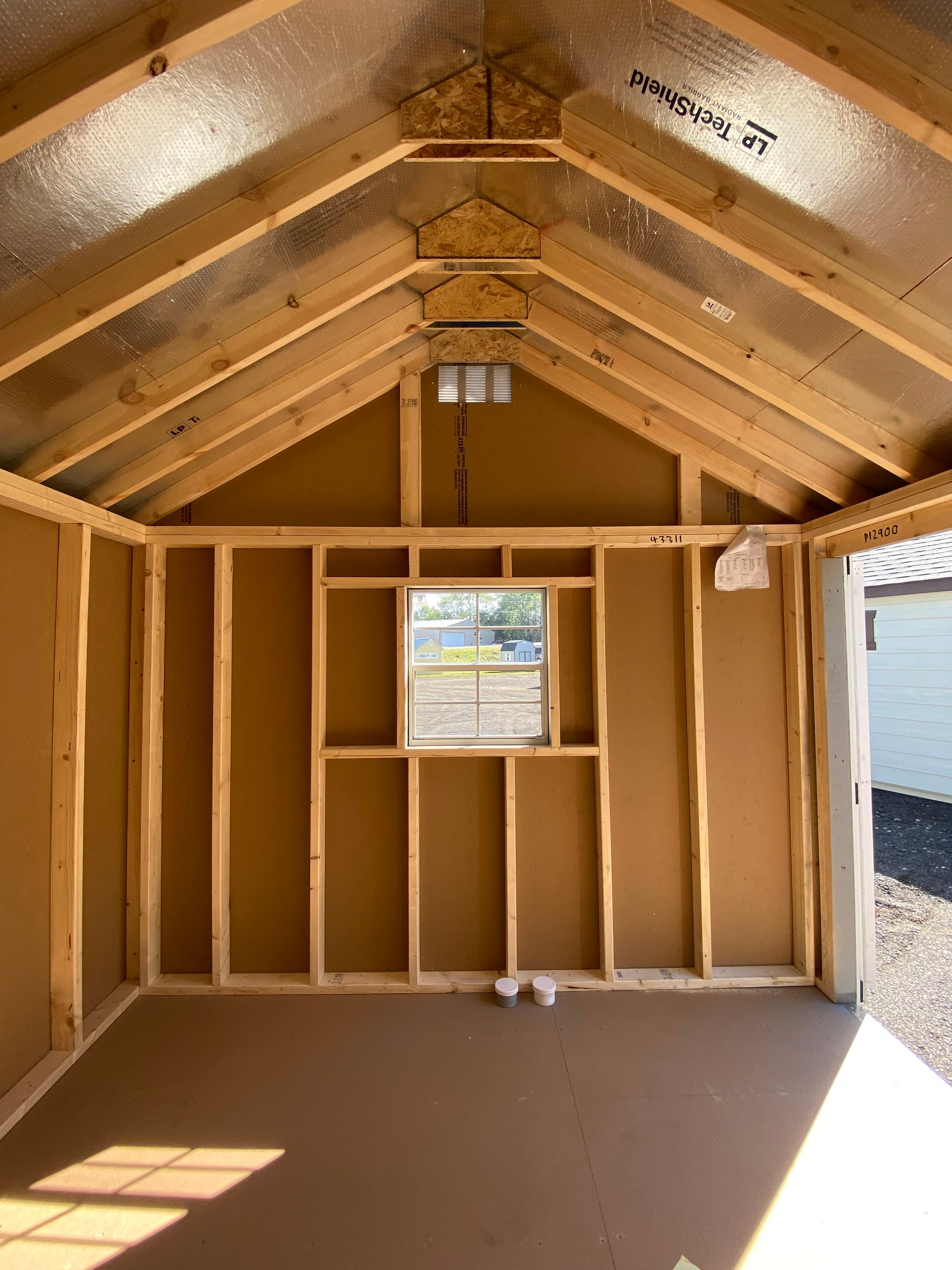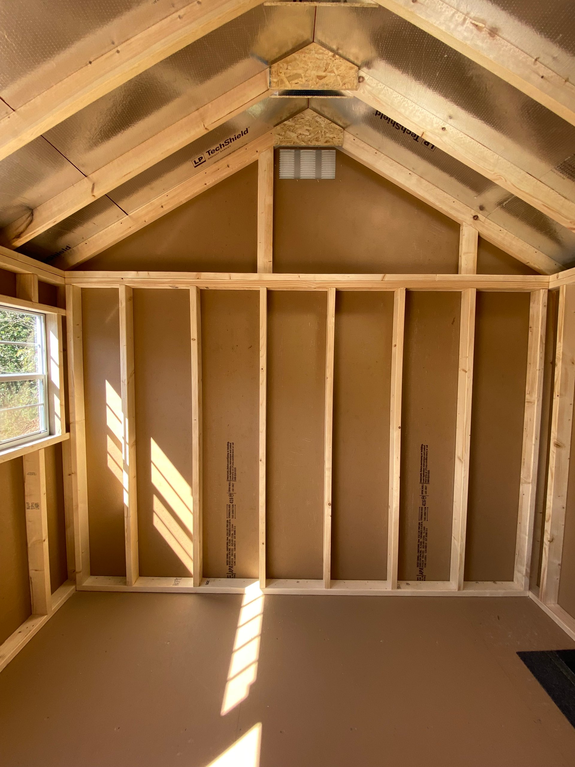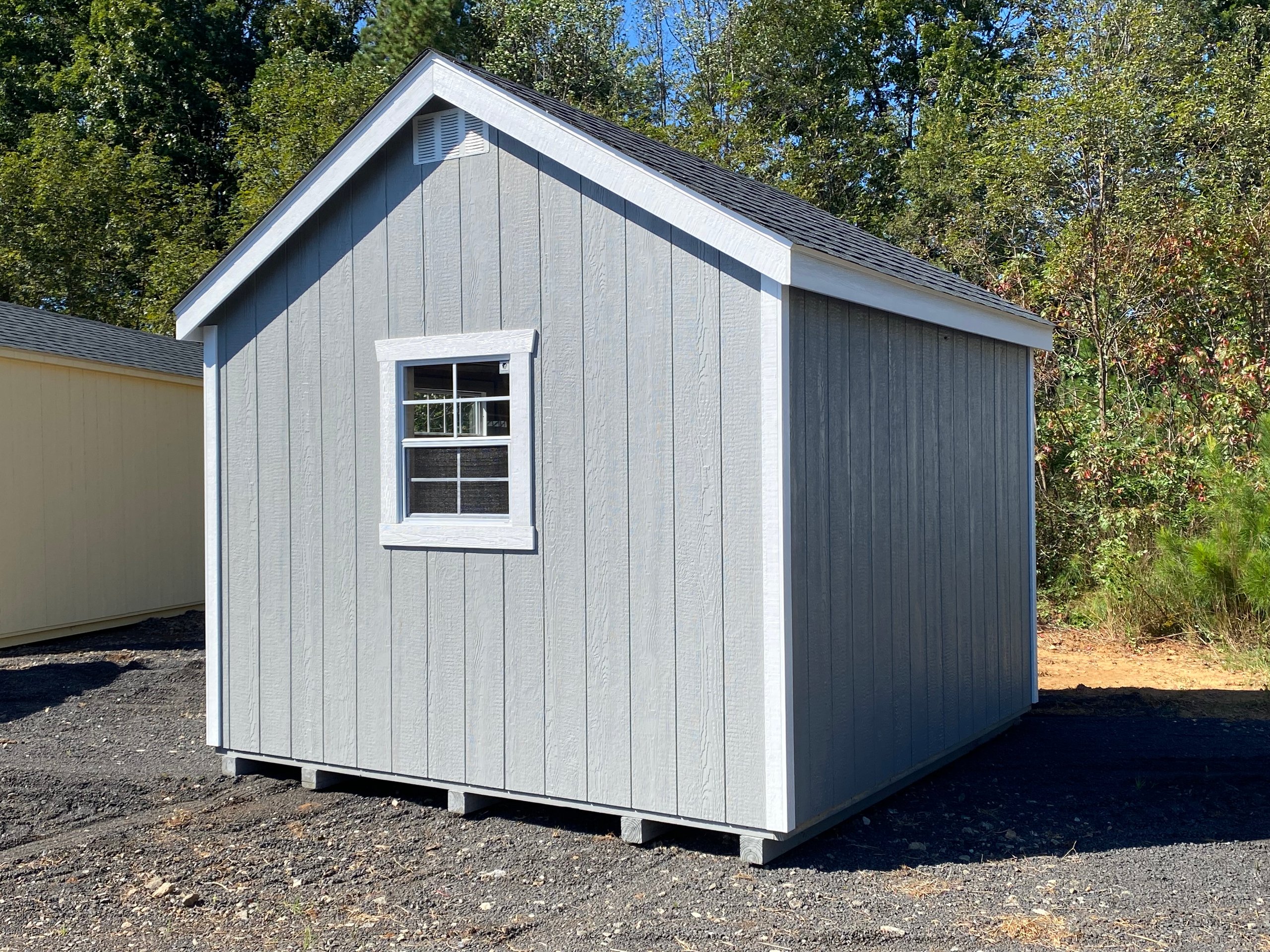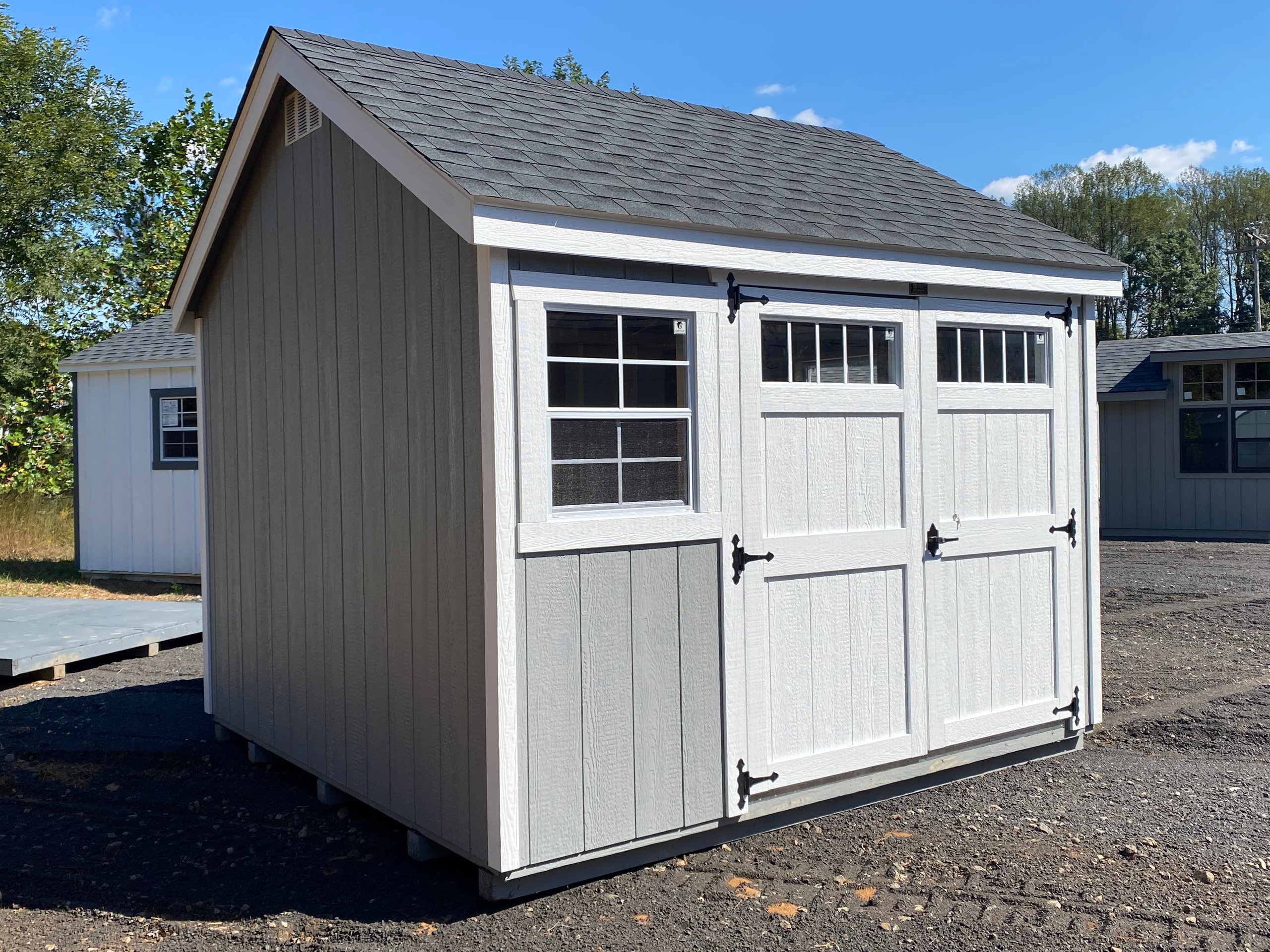 Style Name: Garden Size: 10×10 Siding: LP Smart Panel Main Color: Ronks Gray Trim Color: White Roof Color: Charcoal Roofing: Architectural Shingles Roofing Underlayment: Roof Felt Paper Number of Windows: 2 Number of Doors: 2 Wall Framing: 2×4 studs 16 inches on center Roof Framing: 2×4 rafters 16 inches on center Roof Sheeting: LP Tech Shield Flooring: LP T&G Prostruct Flooring Floor Joists: Pressure Treated 2×4 joists 12 inches on center   Included Upgrades: