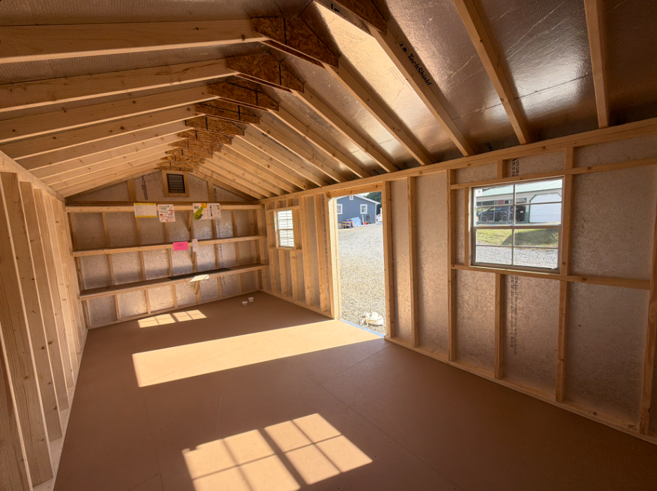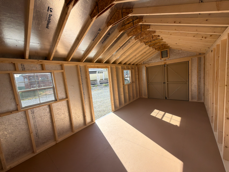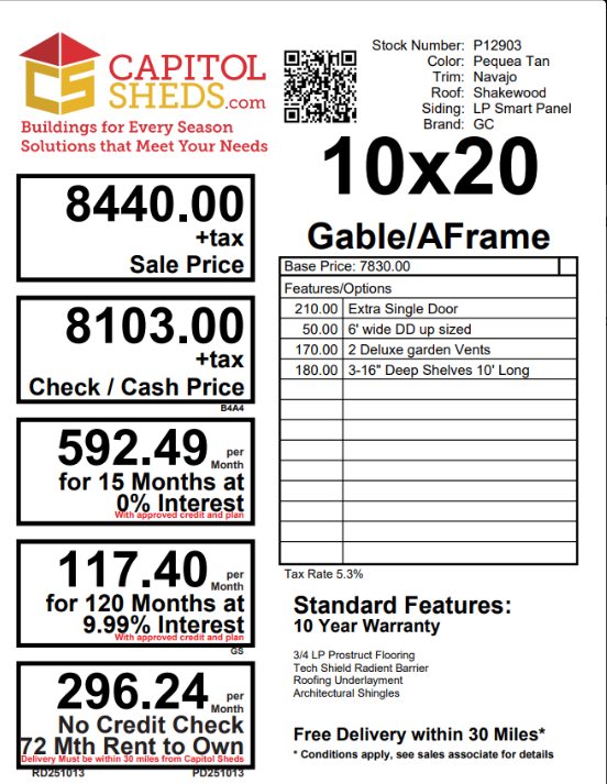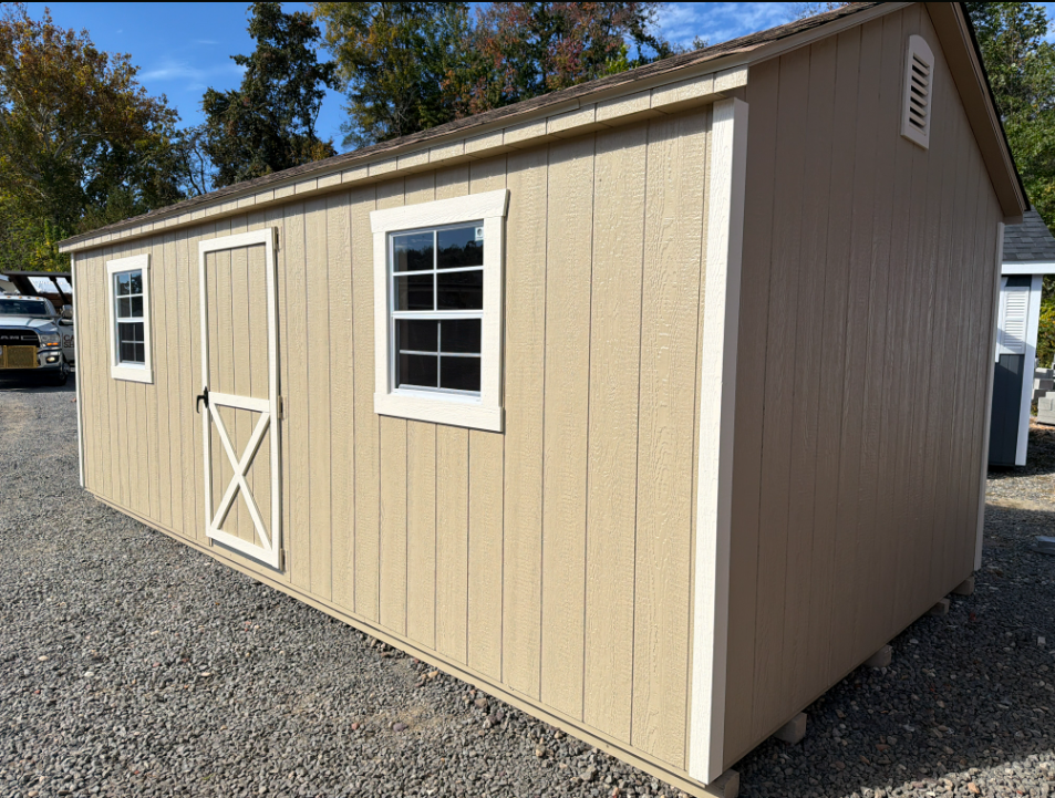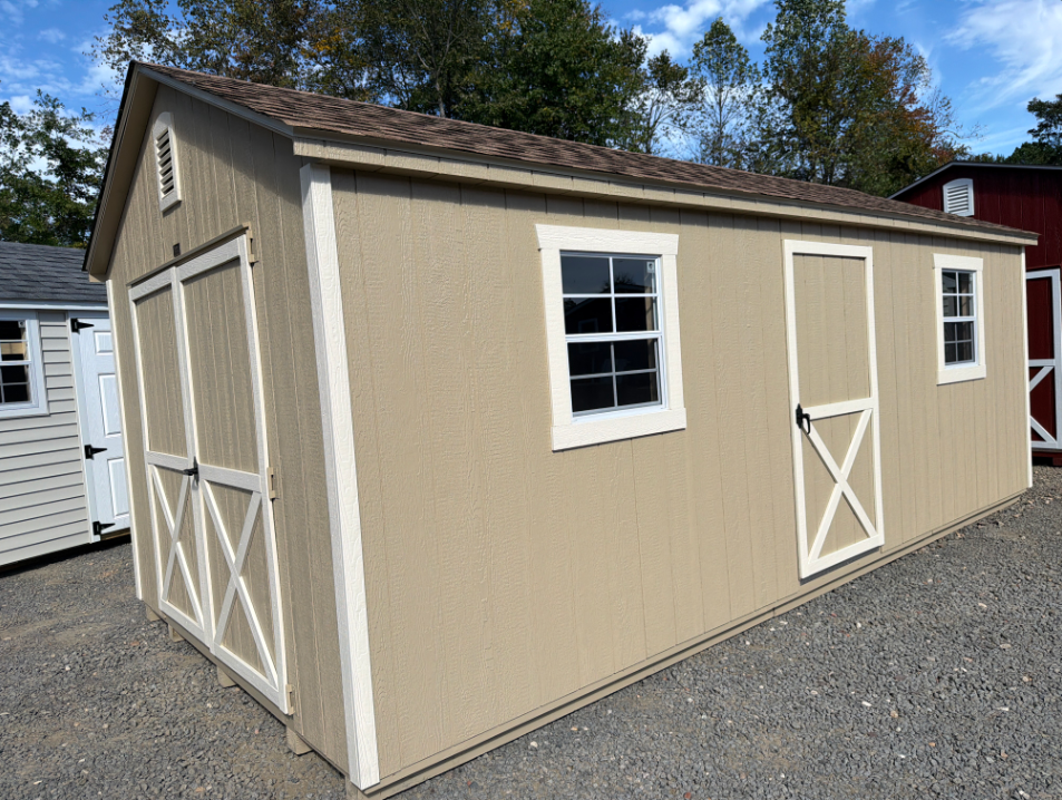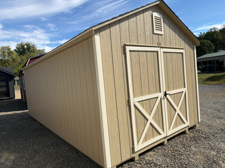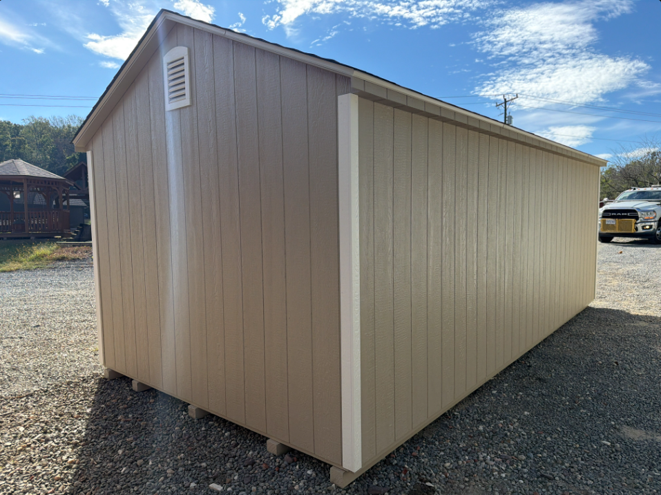 This spacious 10×20 A-frame shed, finished in Tan with Navajo trim, combines utility and style. With two upgraded 6′ double doors and and additional 3′ single door, it’s crafted from durable LP Smart Panel siding and topped with a Shakewood roof in architectural shingles. The interior features robust 2×4 wall and roof framing, LP Tech Shield roof sheeting, and LP T&G Prostruct flooring for enduring support. Garden vents ensure air circulation, while 16” shelves provide additional storage options. This A-frame shed is designed for functionality, offering a streamlined, attractive solution for organized storage.