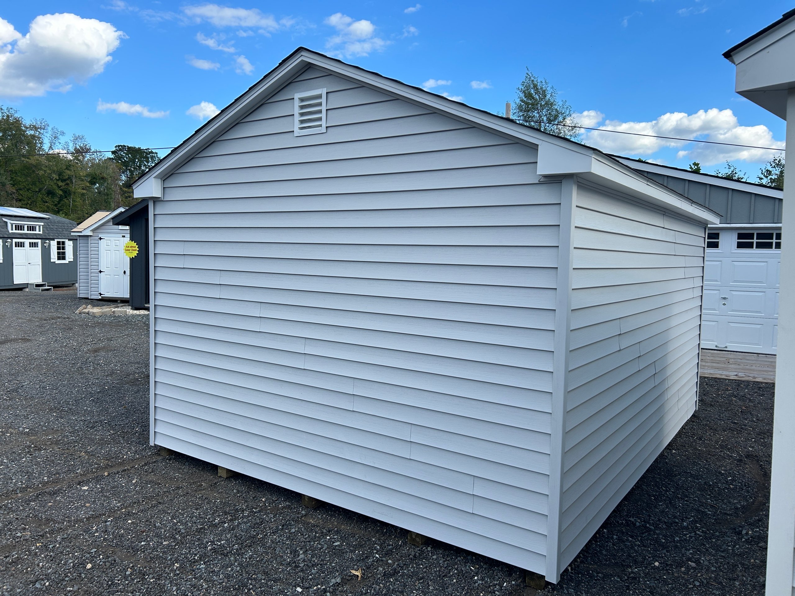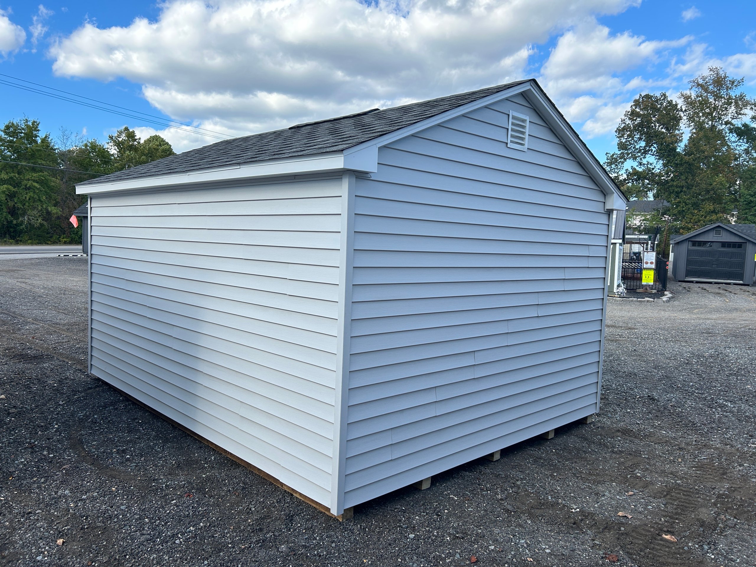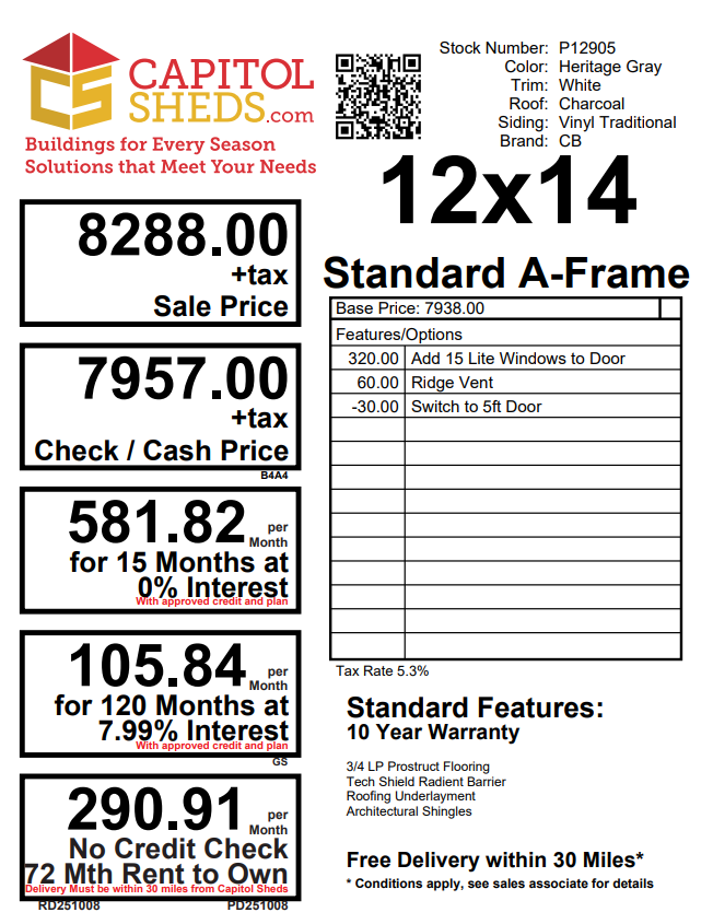 The 12×14 A-Frame blends classic appeal with enduring craftsmanship for a versatile, high-quality storage solution. Its Traditional Vinyl siding in Heritage Gray with White trim pairs beautifully with a Charcoal architectural shingle roof over durable roof felt underlayment. Constructed with 2×4 wall studs and rafters spaced 16 inches on center, LP Tech Shield roof sheeting, and LP ProStruct flooring on pressure-treated joists, this structure ensures lasting performance. Enhanced with 15-lite windows in each door and a 4-foot ridge vent for ventilation, it offers style, function, and reliability—perfect for organized storage or a refined backyard workspace.