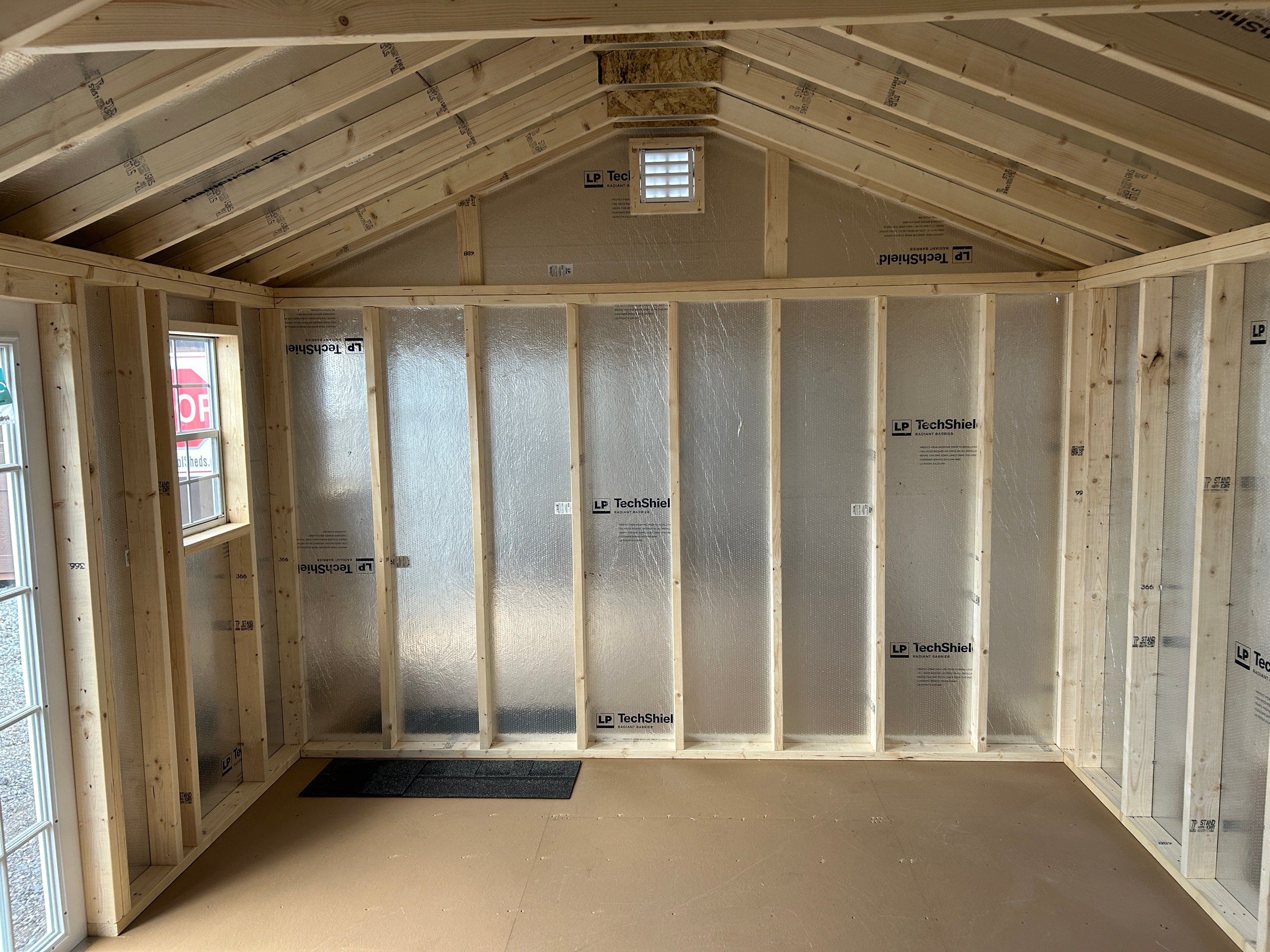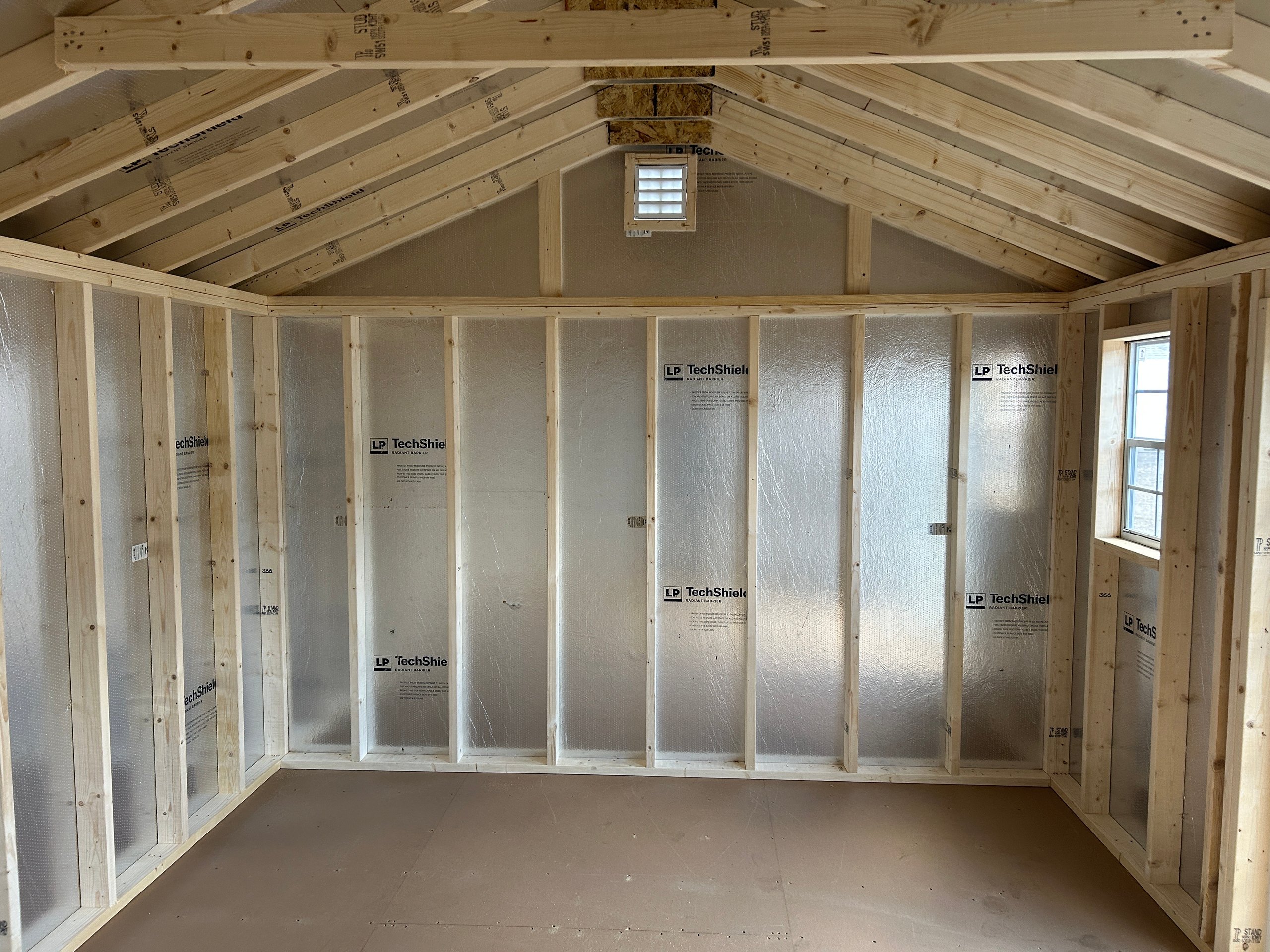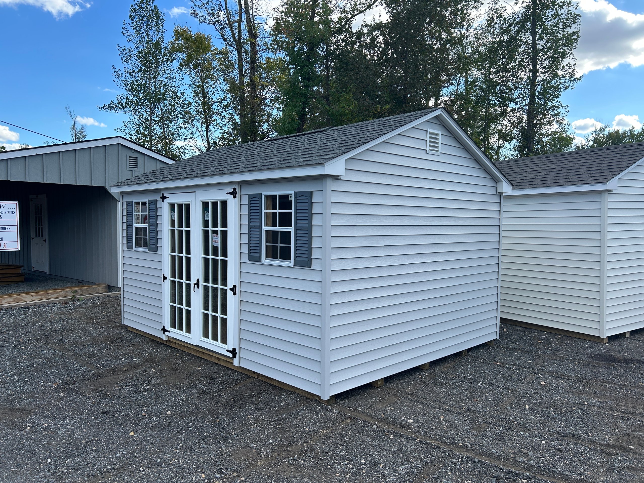 The 12×14 A-Frame blends classic appeal with enduring craftsmanship for a versatile, high-quality storage solution. Its Traditional Vinyl siding in Heritage Gray with White trim pairs beautifully with a Charcoal architectural shingle roof over durable roof felt underlayment. Constructed with 2×4 wall studs and rafters spaced 16 inches on center, LP Tech Shield roof sheeting, and LP ProStruct flooring on pressure-treated joists, this structure ensures lasting performance. Enhanced with 15-lite windows in each door and a 4-foot ridge vent for ventilation, it offers style, function, and reliability—perfect for organized storage or a refined backyard workspace.