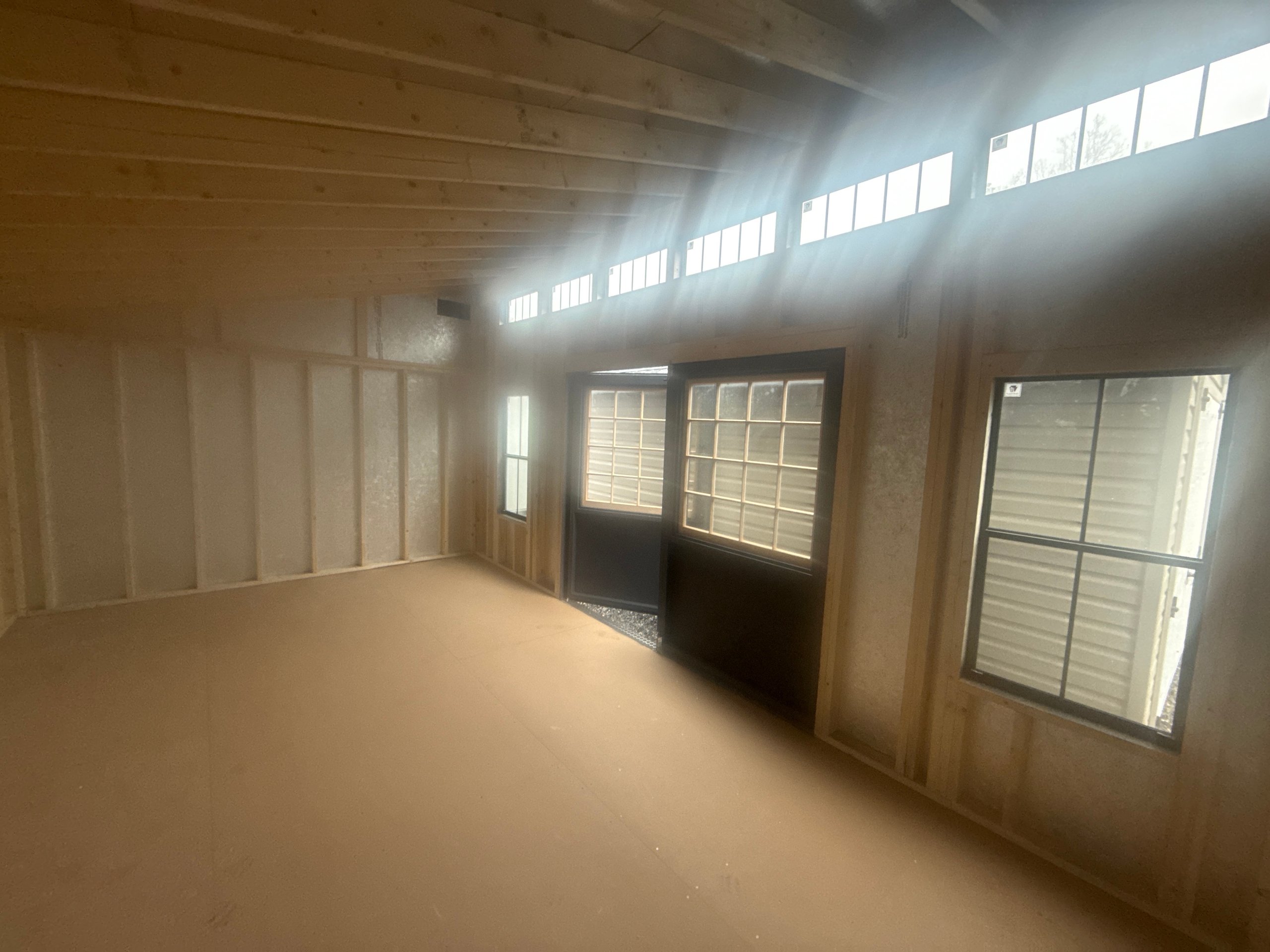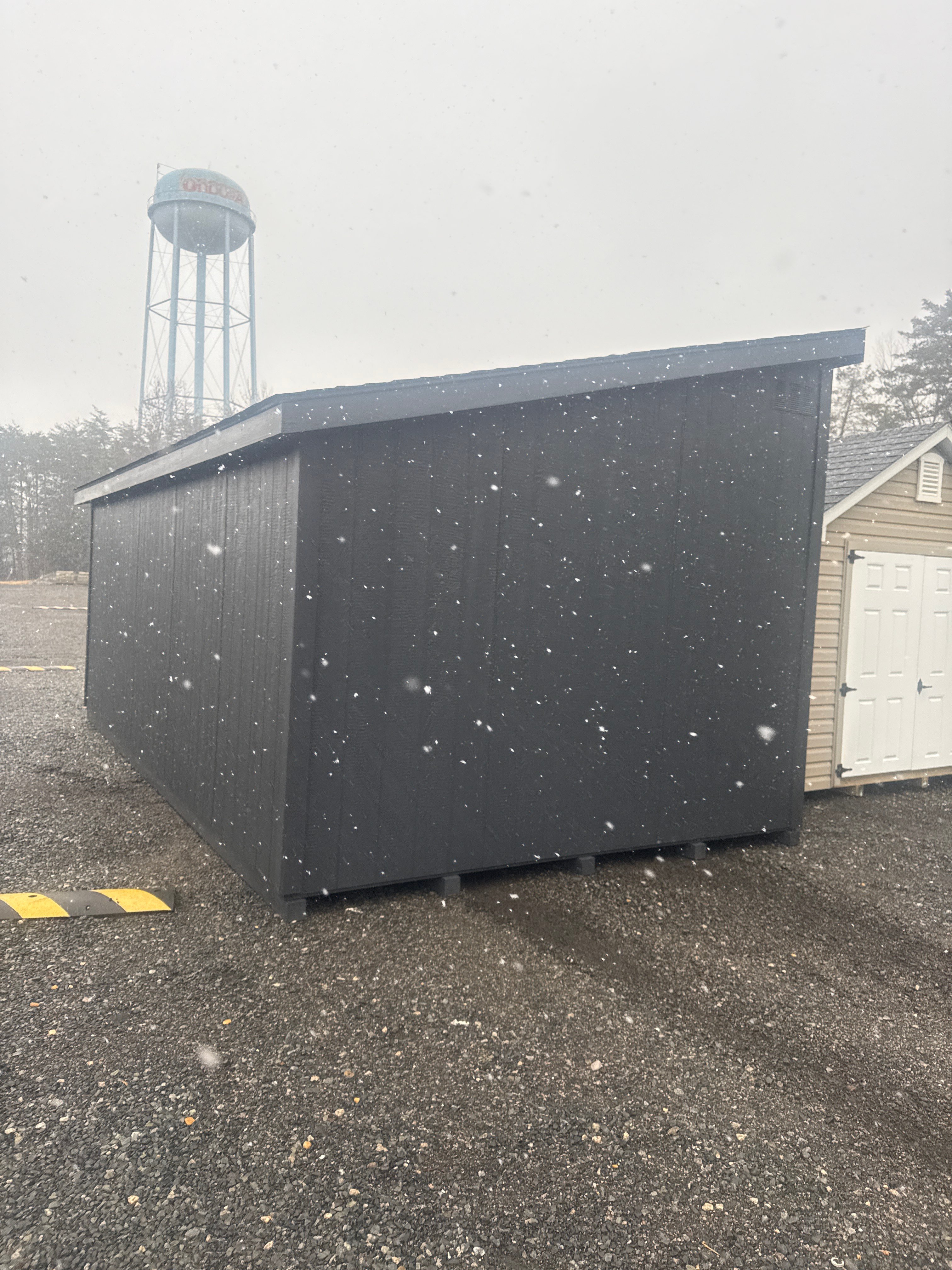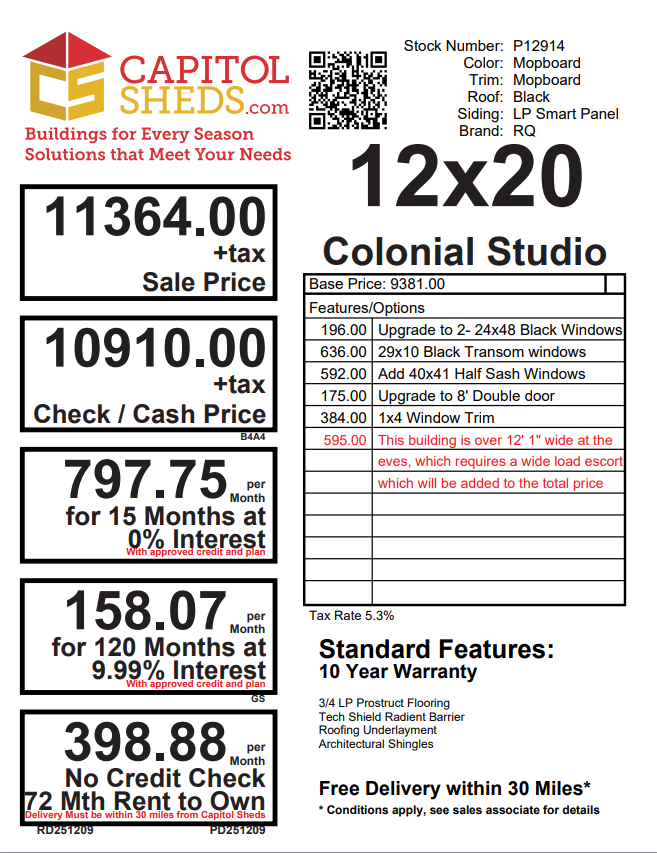 The 12×20 Colonial Studio delivers a bold, modern presence with its Mopboard Black LP SmartPanel with Silverbacker siding, matching trim, and sleek Black architectural shingle roof. Engineered for long-term performance, it features 2×4 wall and roof framing 12″ on center, LP Tech Shield roof sheeting, LP ProStruct flooring, and pressure-treated joists for exceptional strength. Beautiful upgrades include 24×48 black windows, 29×10 black transom windows, and refined black window trim. The impressive 8′ wood doors with 40×41 wood sash inserts elevate both style and functionality, creating a premium studio, workspace, or high-end backyard retreat.