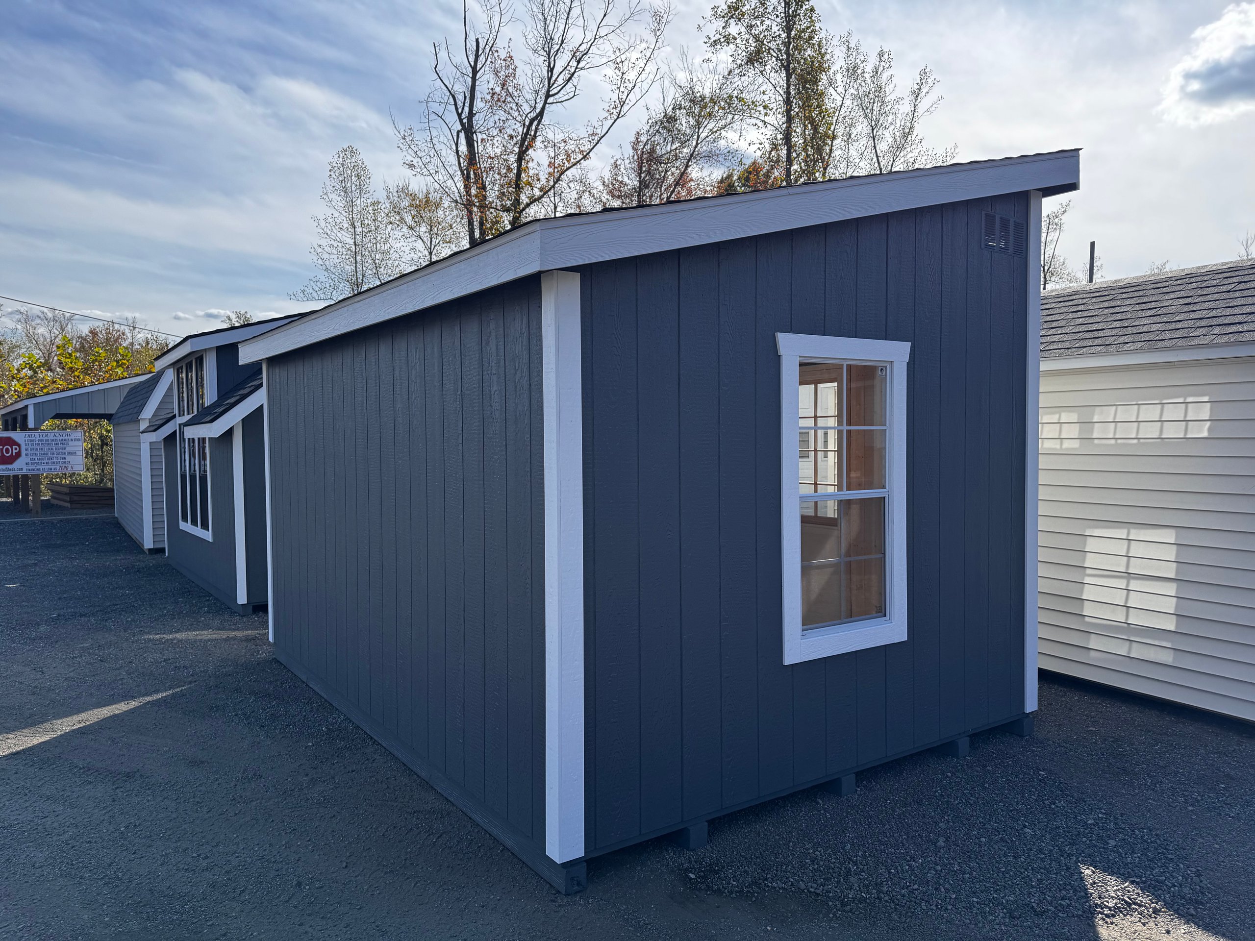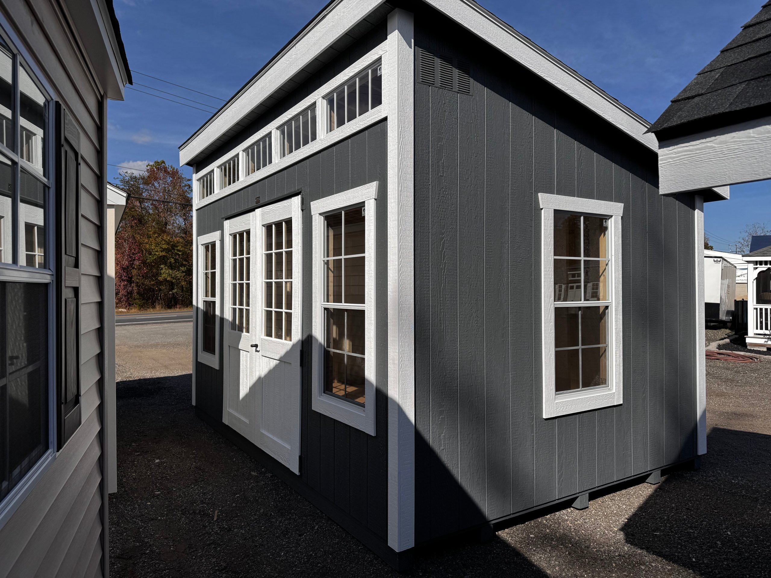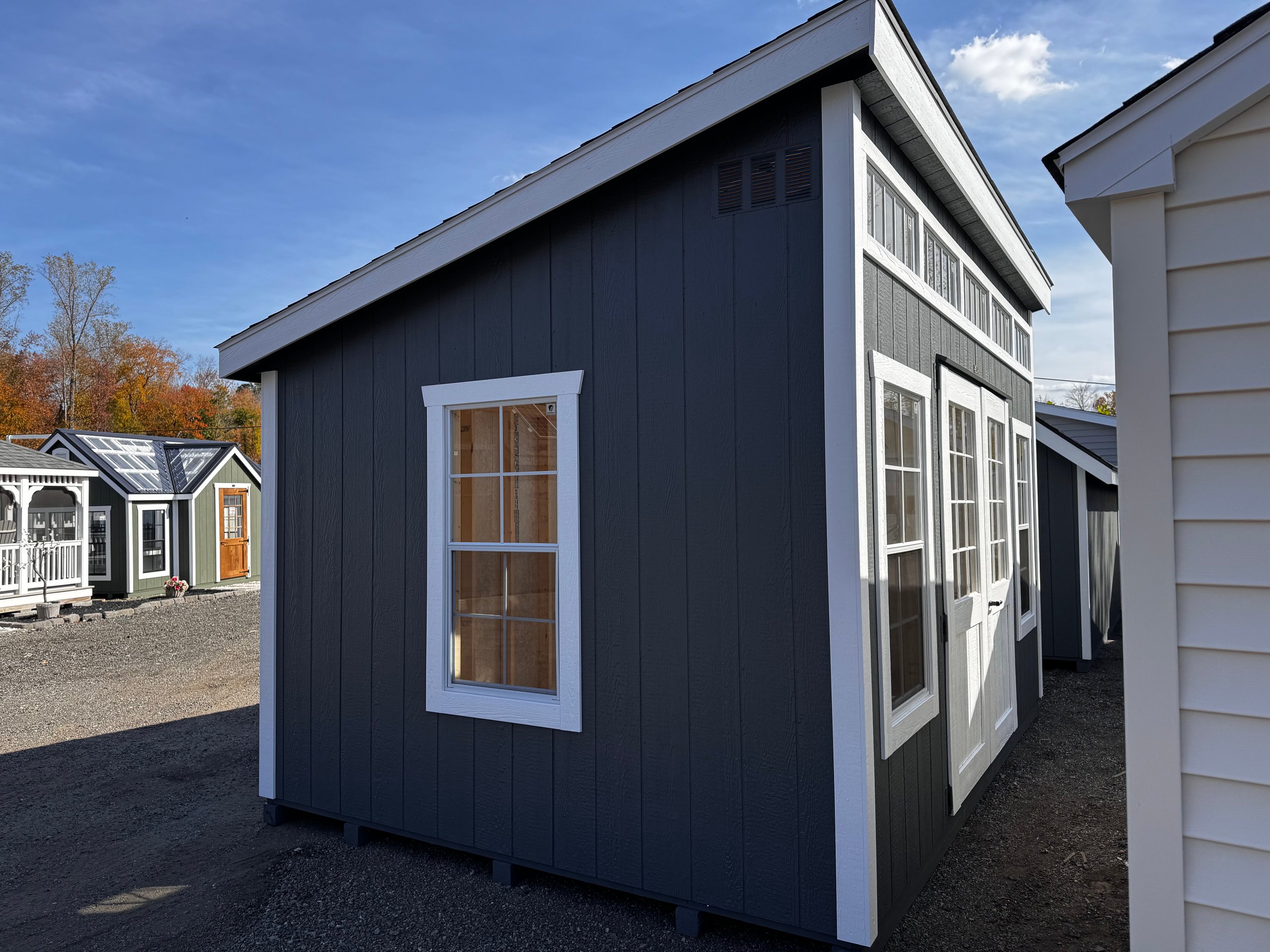 This 10×14 Colonial Studio offers abundant natural light and elegant detailing. Featuring Dark Gray LP Smart Panel Siding with White trim and a Black roof, the structure includes multiple window enhancements—upgraded and additional 24×48 windows, five transoms, and 28×41 wood sash upgrades. Window trim and a 6′ door upgrade complete the professional aesthetic. Built with LP Prostruct Flooring, TechShield Radiant Barrier, and Architectural Shingles, this studio combines enduring strength with refined design. With nine total windows and versatile interior proportions, it’s ideal for a bright creative workspace or polished backyard addition.