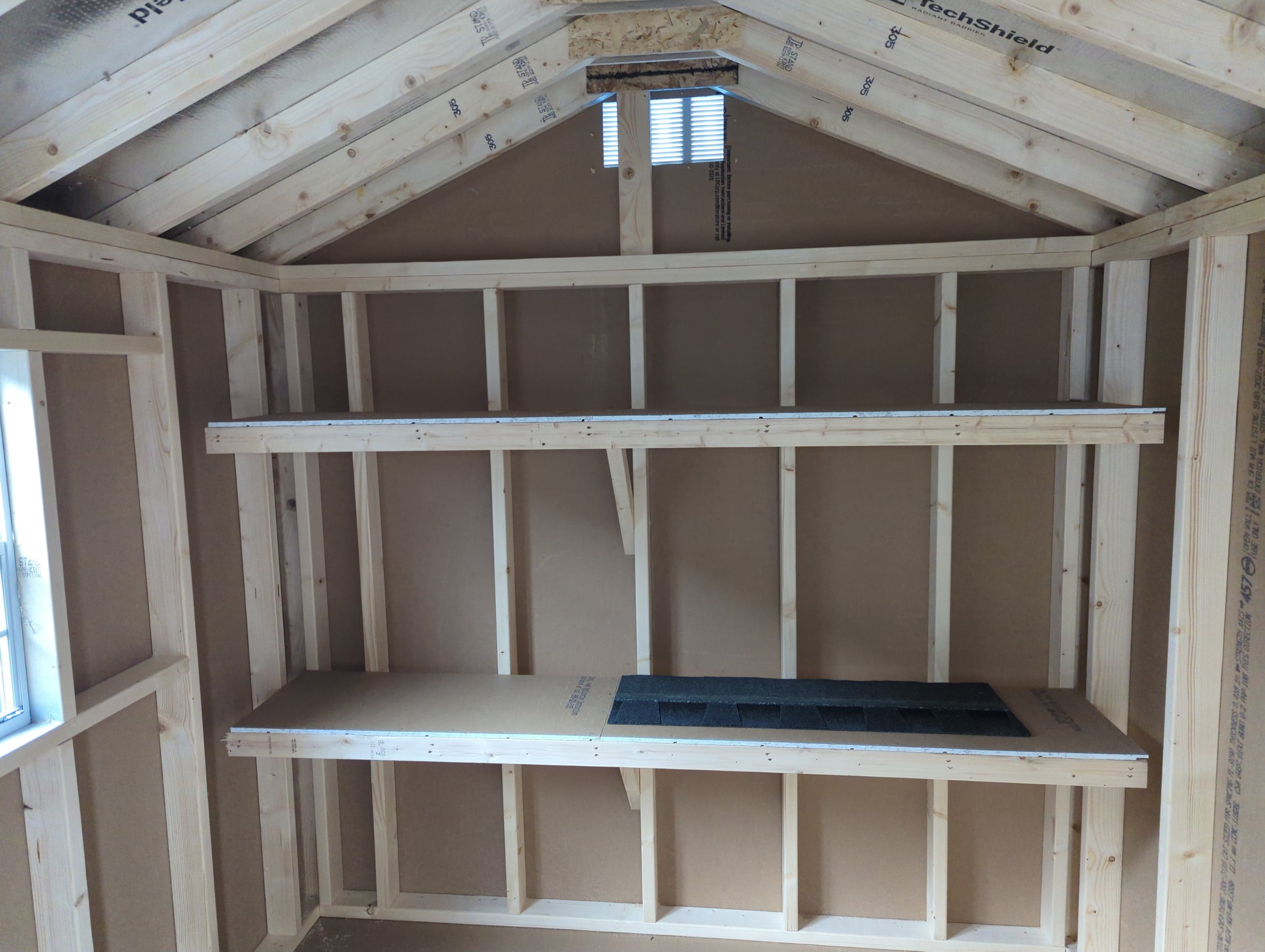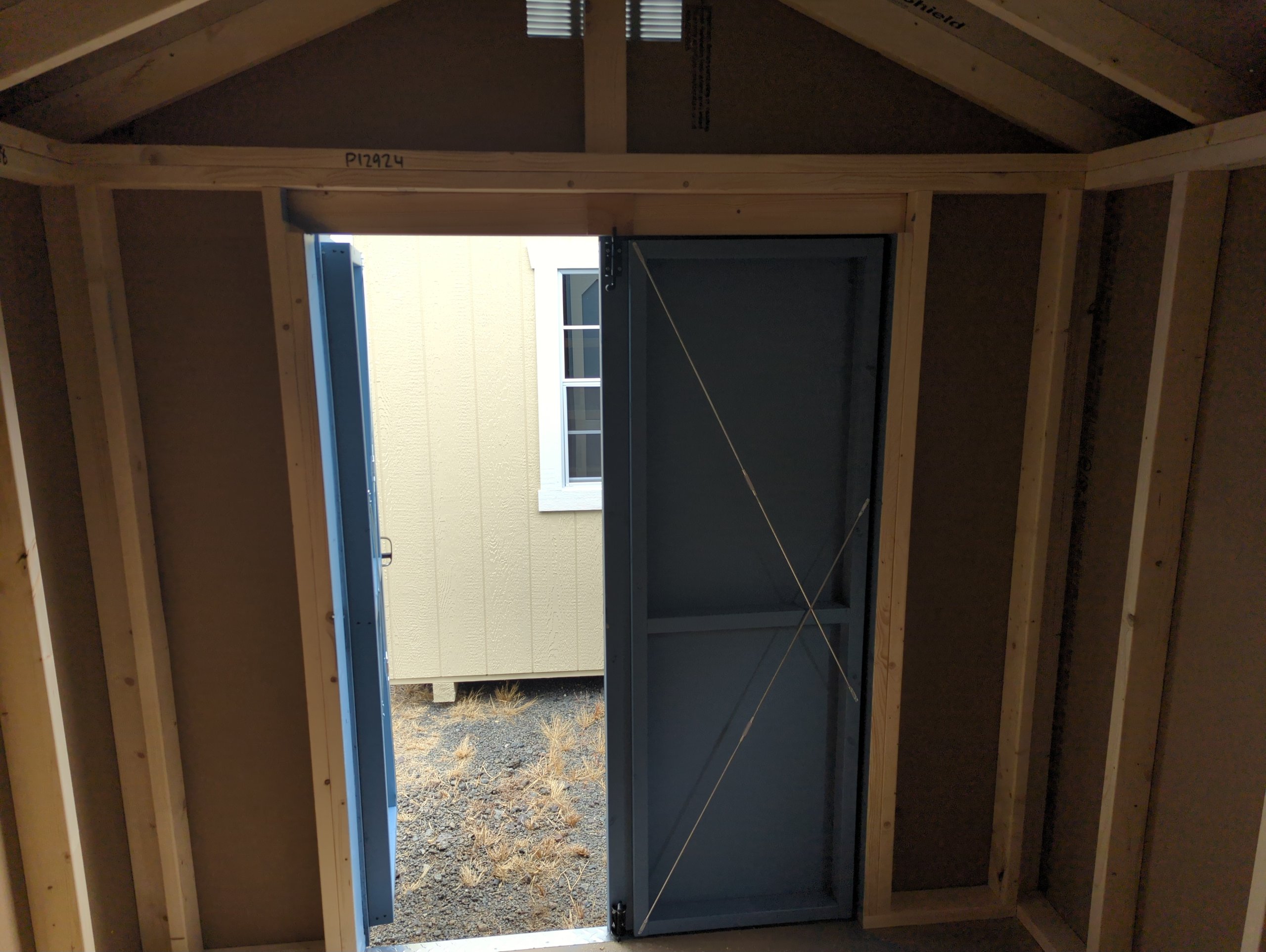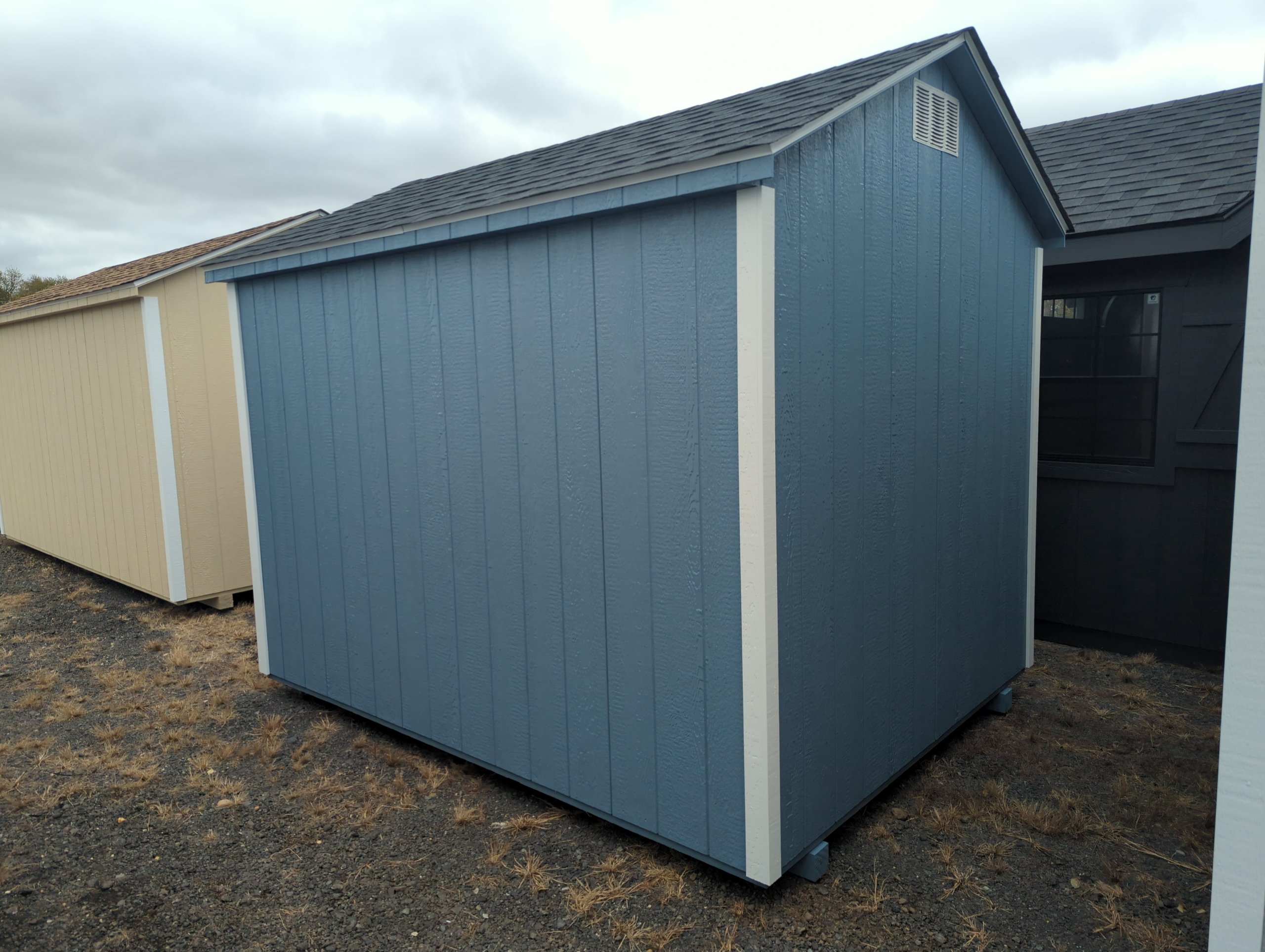 Style Name: A-Frame Size: 8×10 Siding: LP smart panel Main Color: Blue Trim Color: White Roof Color: Black Roofing: Dimensional Shingles Roofing Underlayment: Roof Felt Number of Windows: 2 Number of Doors: 1 Wall Framing: 2×4 studs 16 inches on center Roof Framing: 2×4 rafters 16 inches on center Roof Sheeting: LP Tech Shield Flooring: LP Prostruct Flooring Floor Joists: Pressure Treated 2×4 joists 16 inches on center Included Upgrades: 2 16″ deep shelves