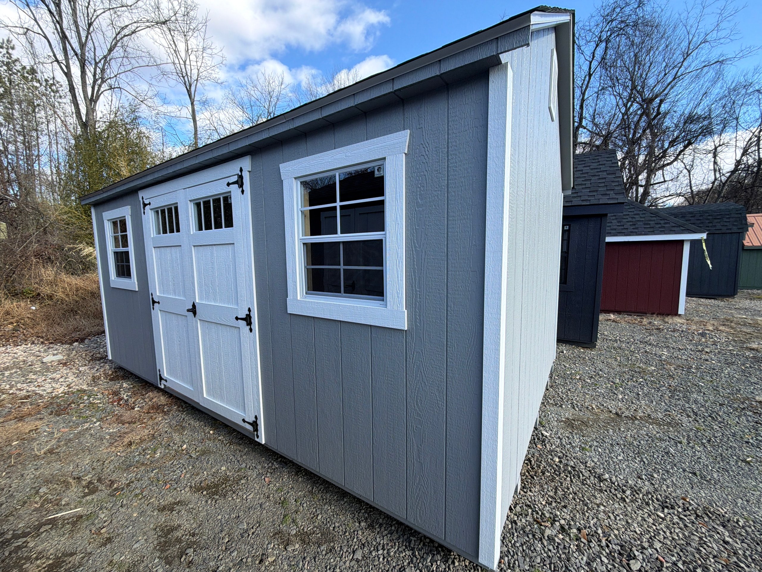 This 10×16 Cape-style shed blends timeless design with practical upgrades. Finished in Ronks Gray LP Smart Panel siding with crisp white trim and a charcoal roof, it offers a clean, classic exterior. A 5′ garden-style double door with transom windows provides easy access while allowing natural light inside. Two windows and deluxe garden vents enhance airflow and brightness. Inside, durable 3/4″ LP ProStruct flooring supports everyday use, while a 4′ deep loft and two 16″ shelves maximize storage, making this Cape shed both attractive and highly functional.