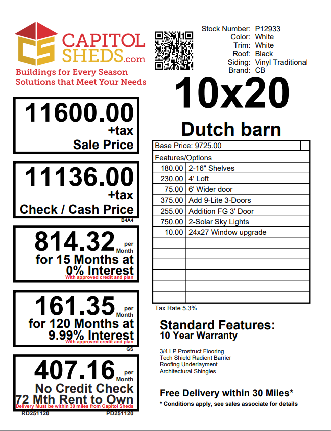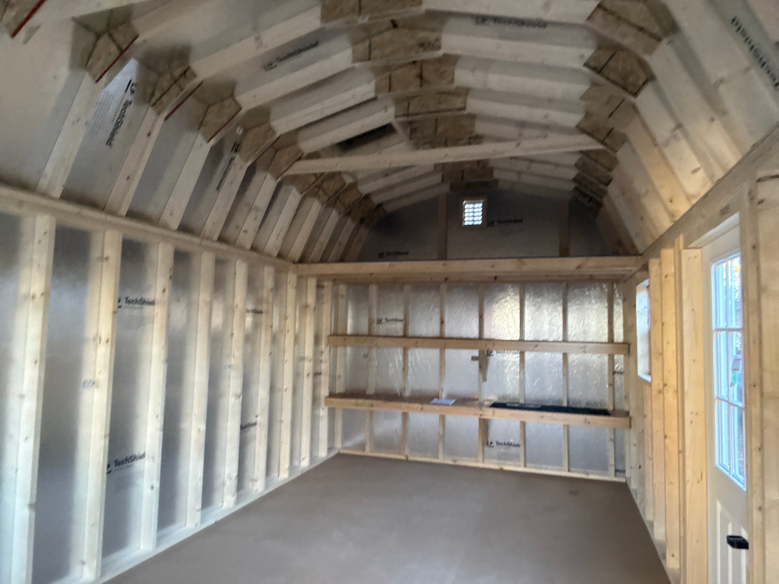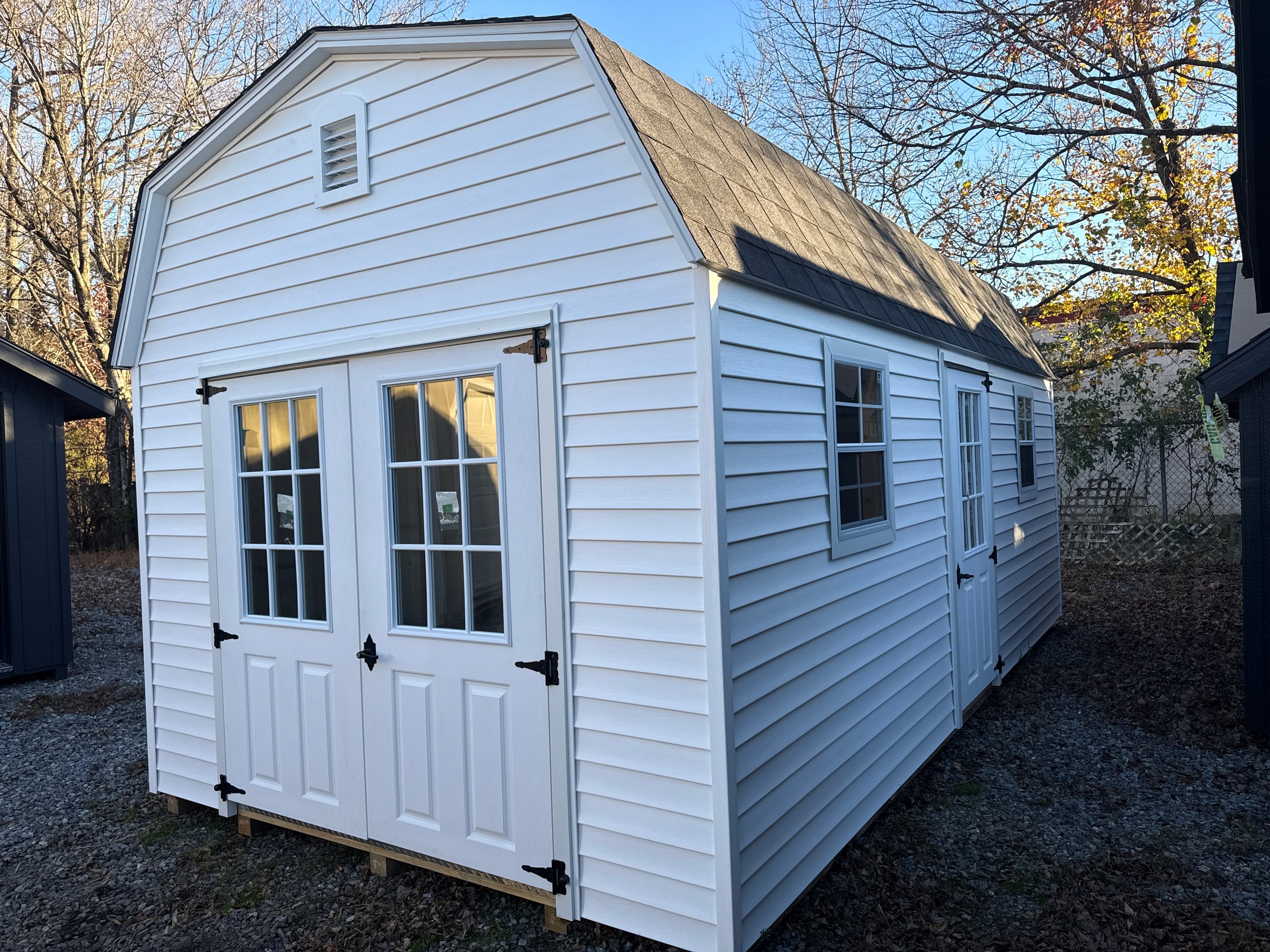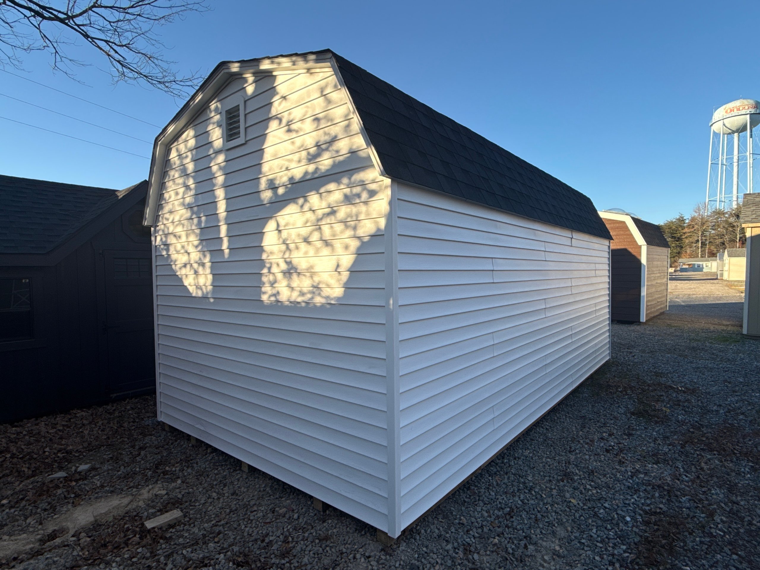 This 10×20 Dutch Barn in White with White trim combines classic charm with practical design. Constructed with durable Vinyl siding, 2×4 wall and roof framing spaced 16″ on center, LP Tech Shield roof sheeting, and LP T&G Prostruct flooring on pressure-treated 2×4 joists 12″ on center, it’s built to last. Two windows bring in natural light, while the 6ft double doors 9-lite and 3′ Single door 9-Lite provide easy access and a stylish touch. Perfect for a storage shed, workshop, or small hobby space, this Dutch Barn offers a timeless design, high-quality construction, and functional features to fit any backyard or property.