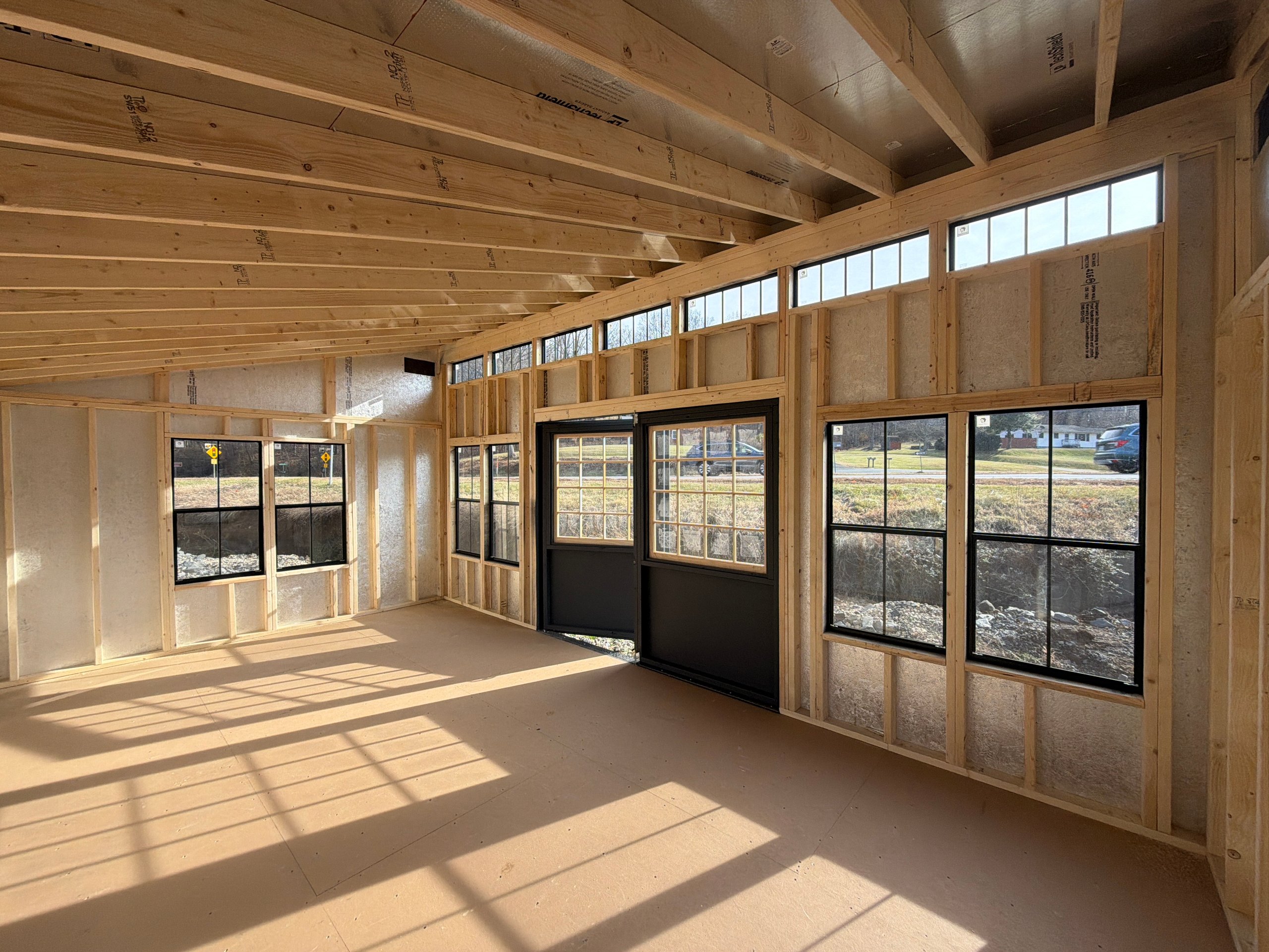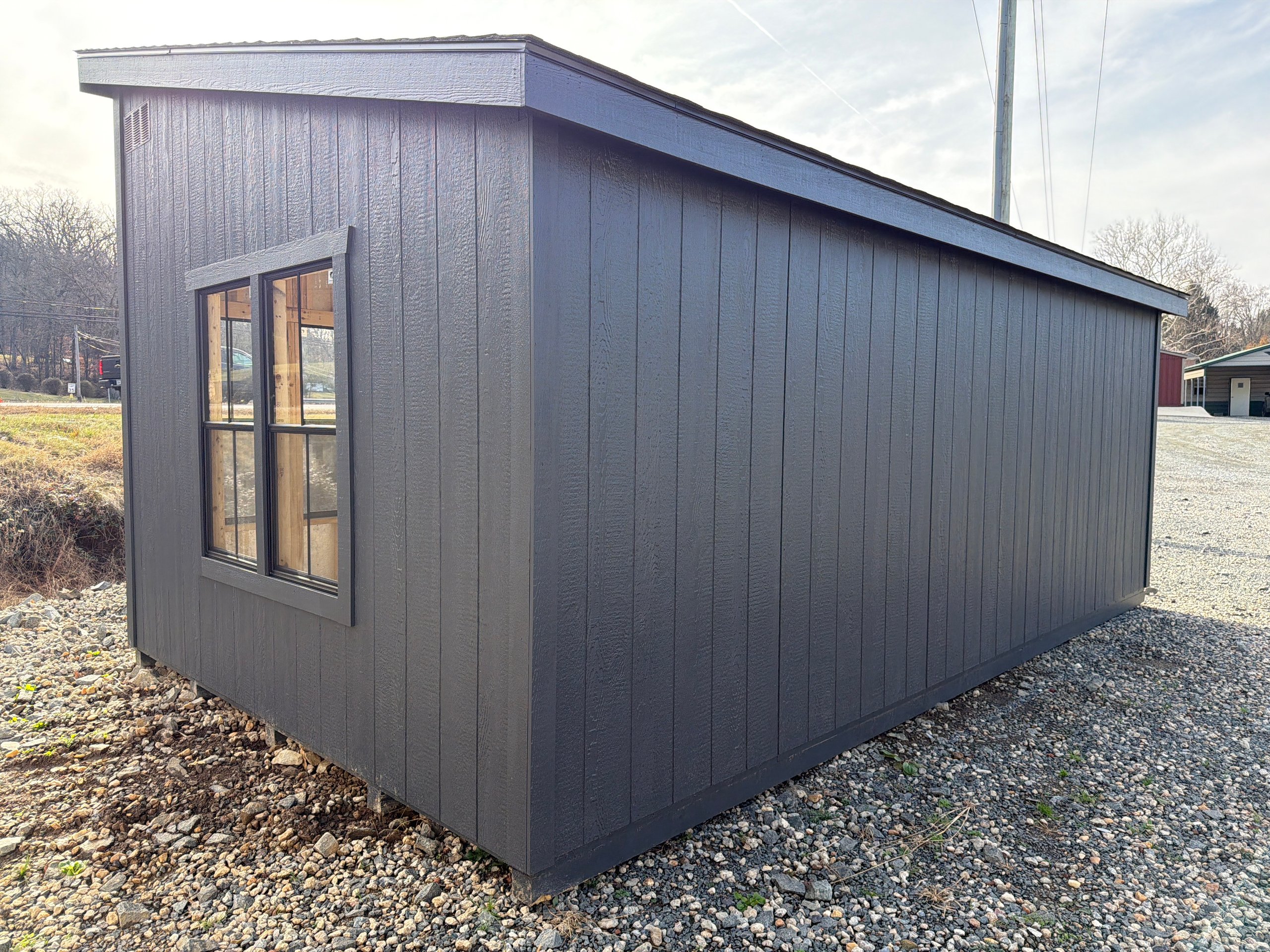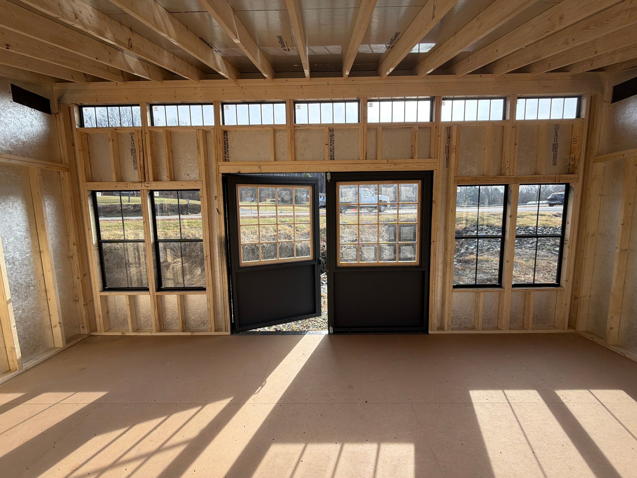 This 12×20 Colonial Studio delivers striking modern style with exceptional light and durability. Finished in Mopboard LP Smart Panel siding with matching trim and a bold black roof, it offers a sleek, cohesive exterior. Eight oversized black windows and seven transom windows flood the interior with natural light, creating an open studio feel. Upgraded 3/4″ LP ProStruct flooring with 8″ on-center pressure-treated floor joists ensures long-term strength. Wide 8′ wood double doors with wood sash inserts provide an inviting entry, while extensive window trim adds refined architectural detail throughout.