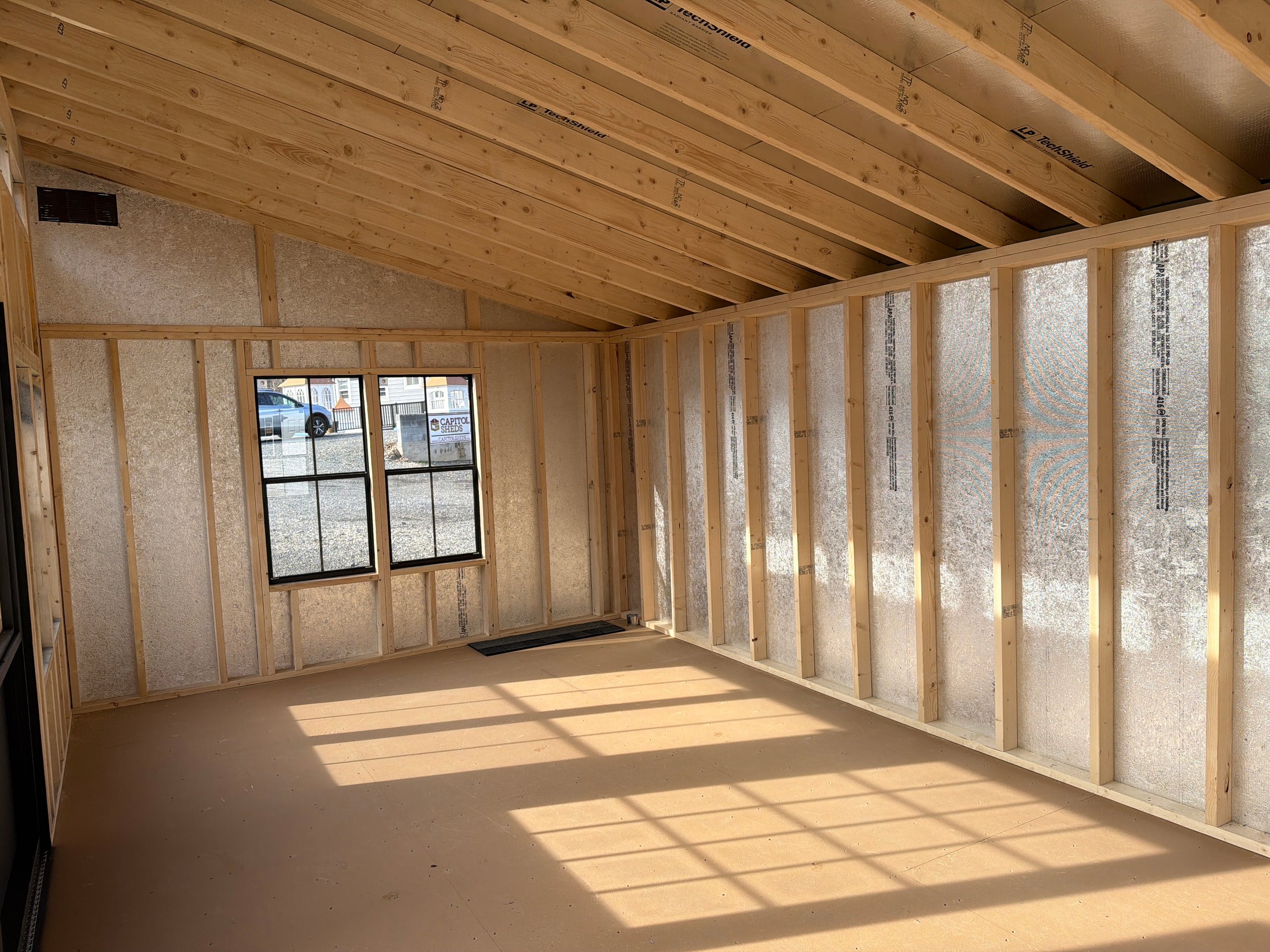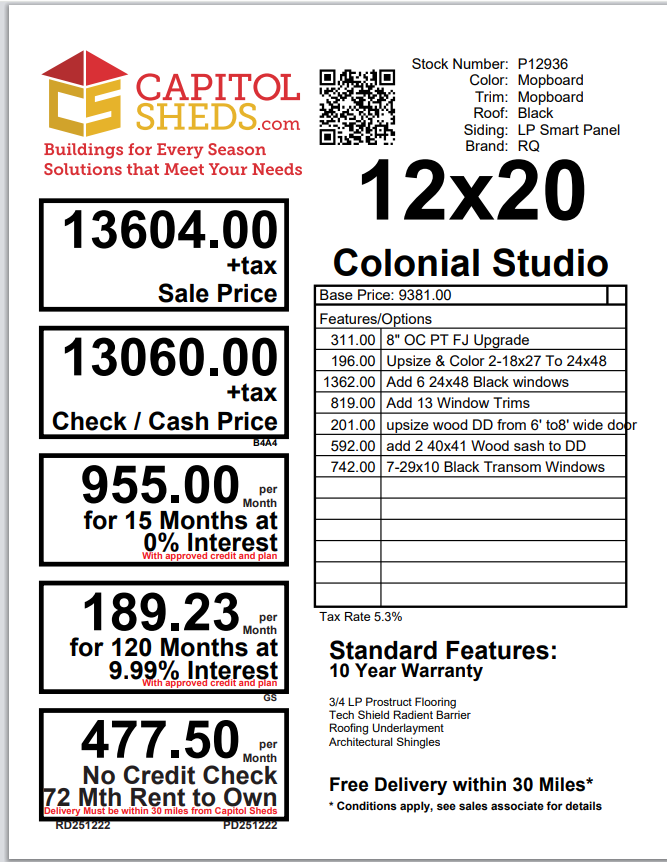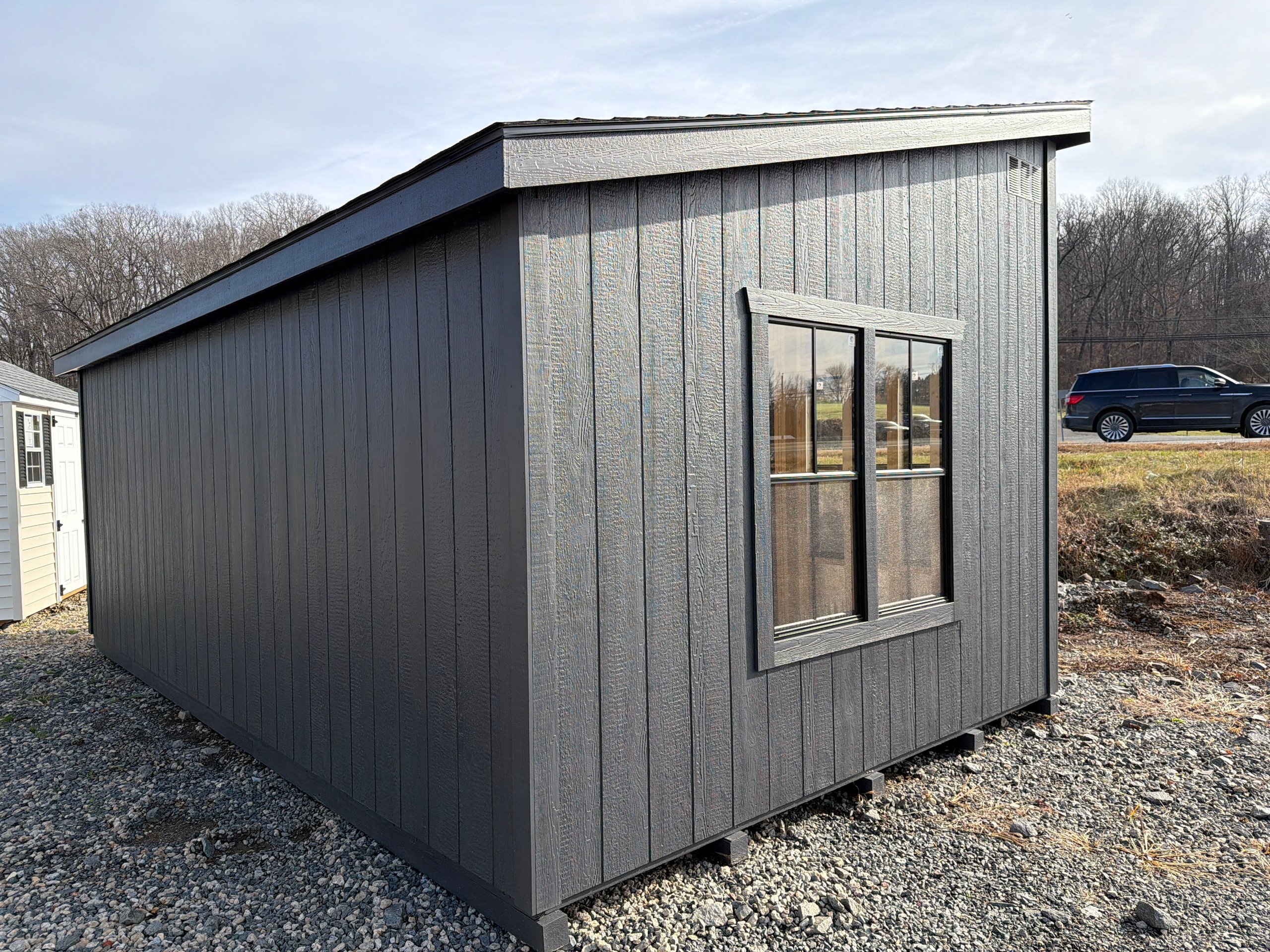 This 12×20 Colonial Studio delivers striking modern style with exceptional light and durability. Finished in Mopboard LP Smart Panel siding with matching trim and a bold black roof, it offers a sleek, cohesive exterior. Eight oversized black windows and seven transom windows flood the interior with natural light, creating an open studio feel. Upgraded 3/4″ LP ProStruct flooring with 8″ on-center pressure-treated floor joists ensures long-term strength. Wide 8′ wood double doors with wood sash inserts provide an inviting entry, while extensive window trim adds refined architectural detail throughout.