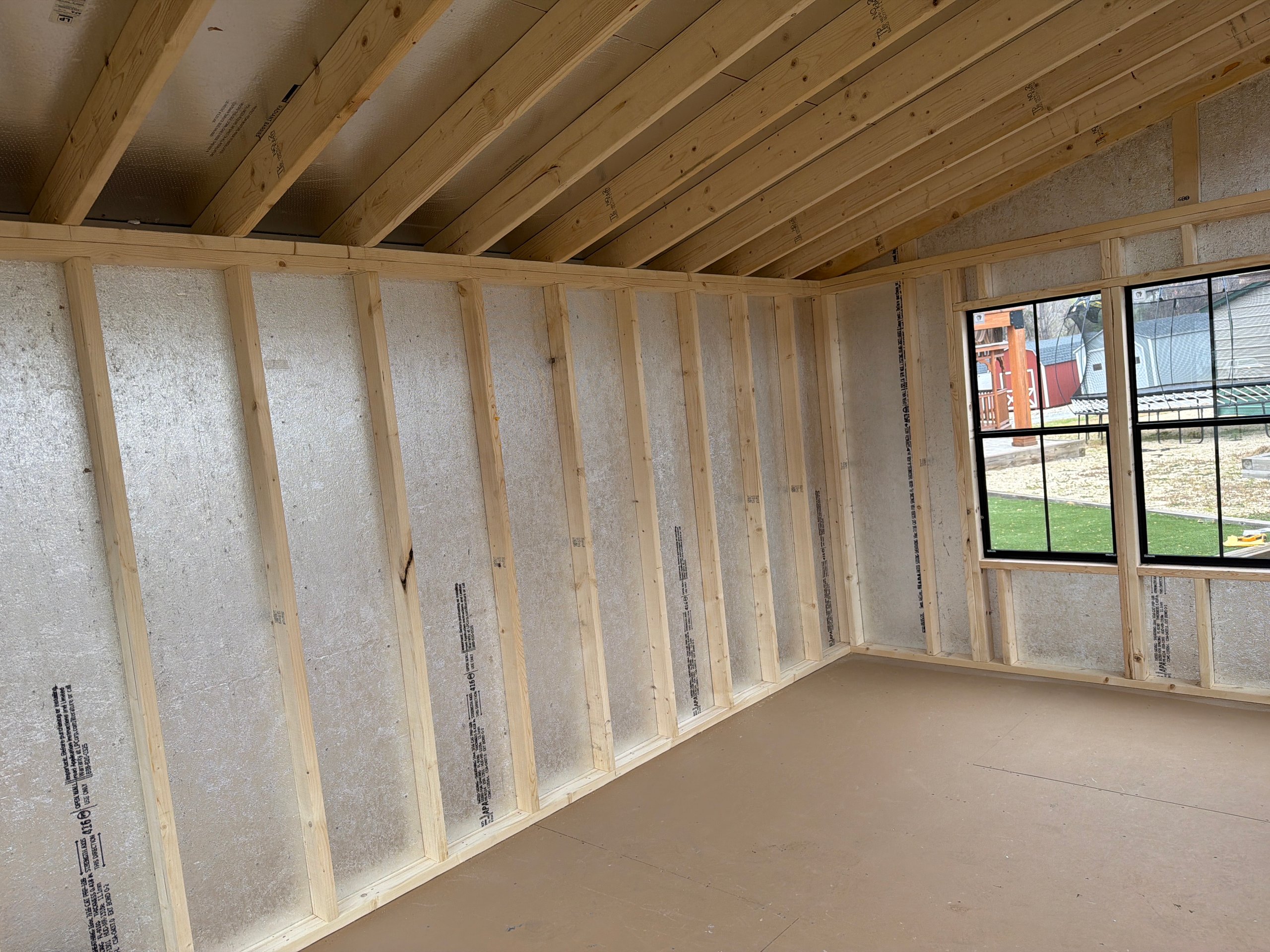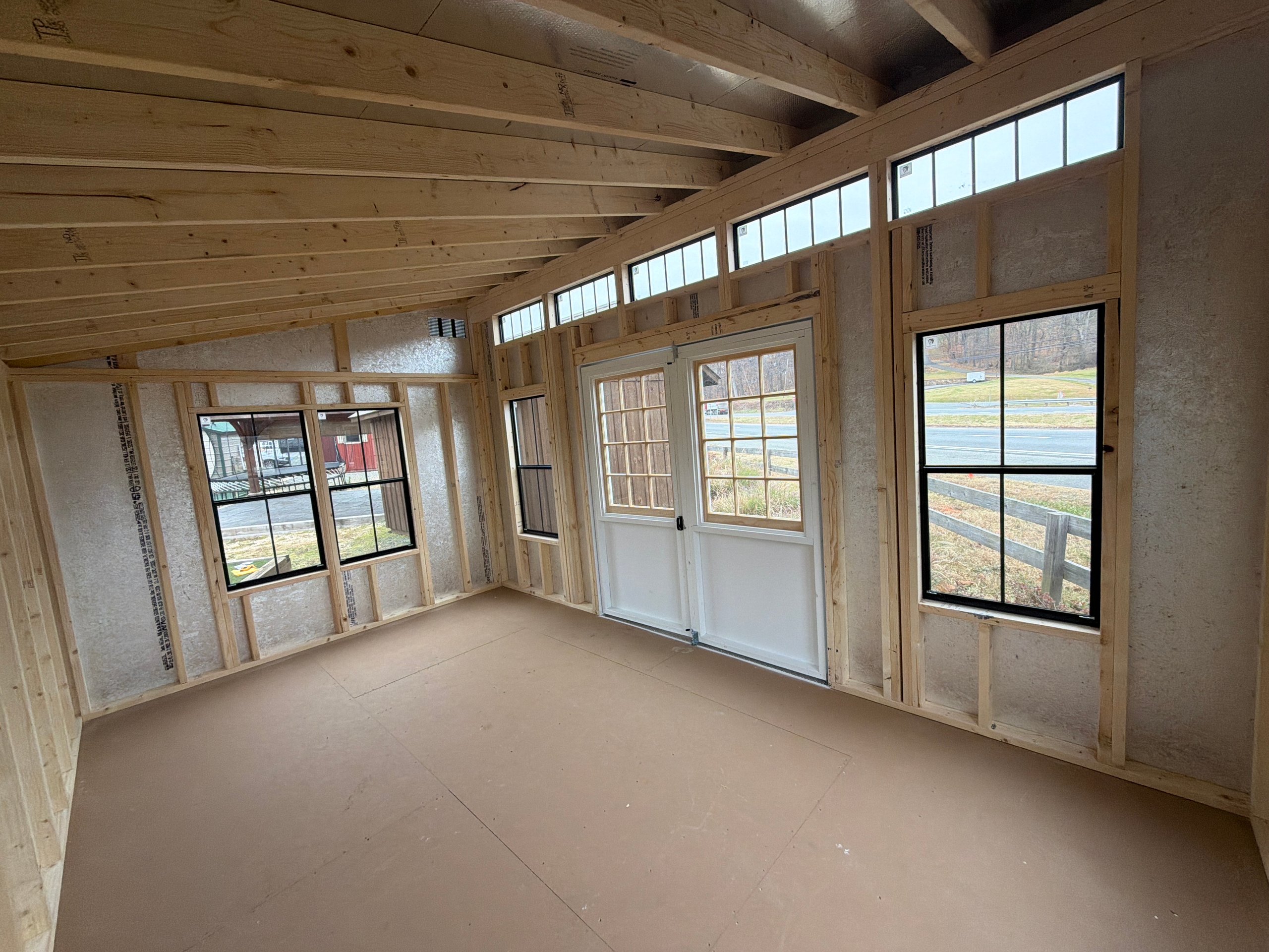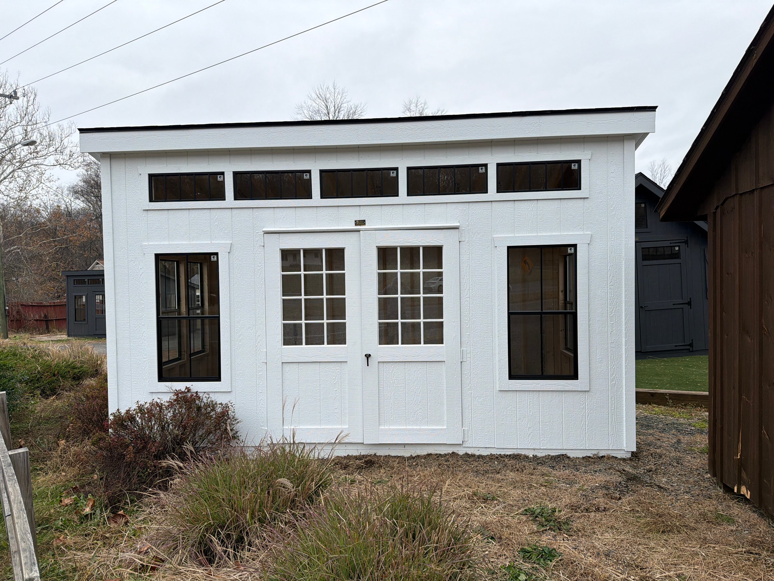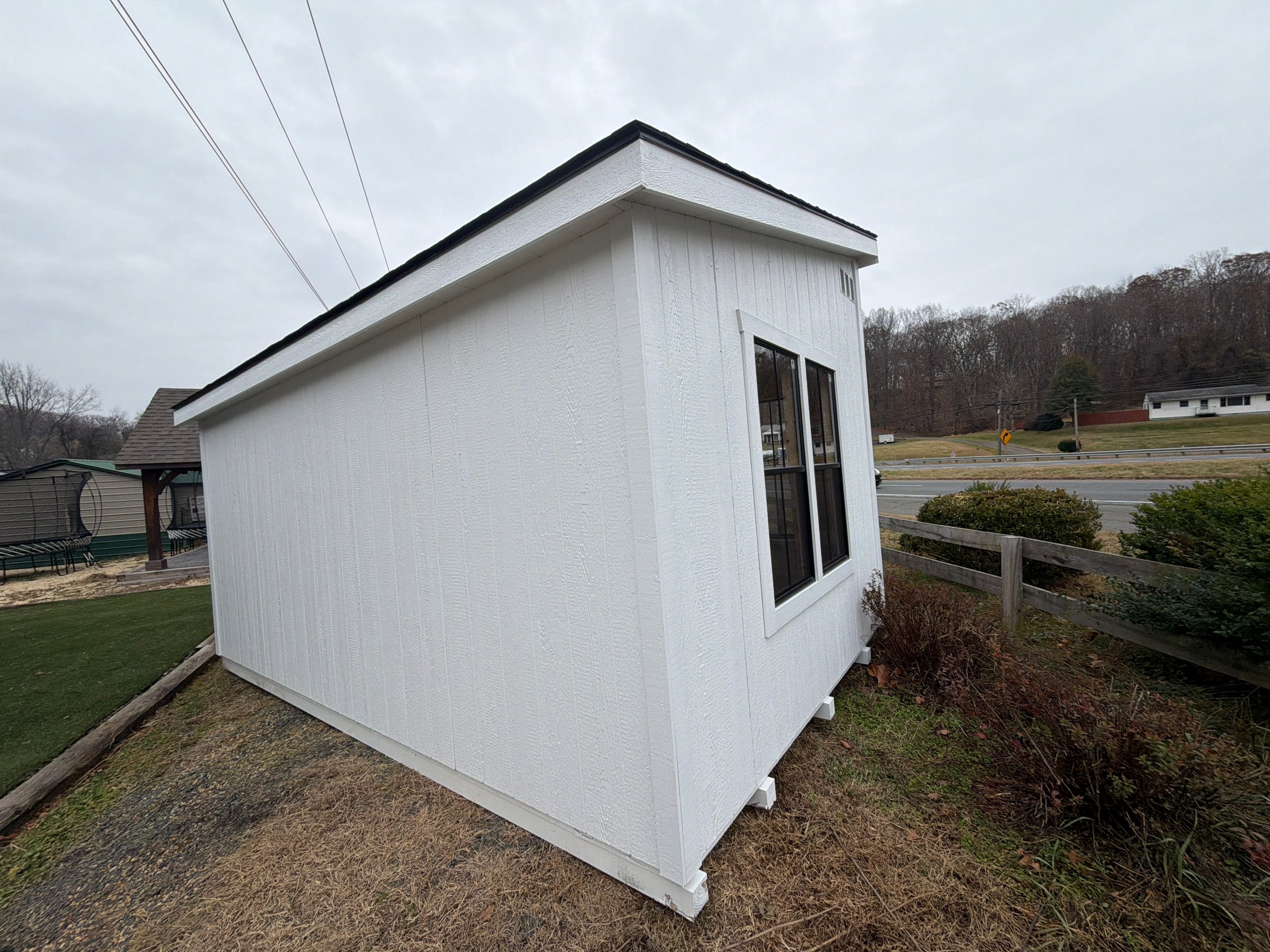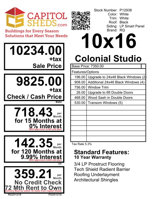 This 10×16 Colonial Studio delivers a clean, timeless look with bright functionality. Finished in white LP Smart Panel siding with matching white trim, it features a bold black architectural shingle roof and LP Tech Shield roof sheeting for added protection and efficiency. Built with 2×4 wall and roof framing on 16-inch centers and pressure-treated 2×4 floor joists spaced 12 inches on center, it’s designed for strength and durability. Eight 24×48 black windows with window trim flood the interior with natural light, while double doors with a wood sash window and transom windows create an inviting, studio-style feel—perfect for a workspace, office, or creative retreat.