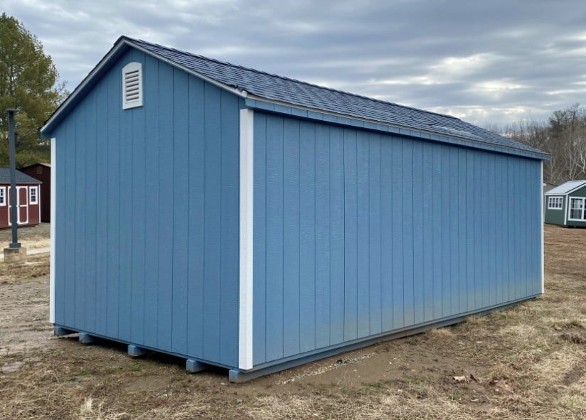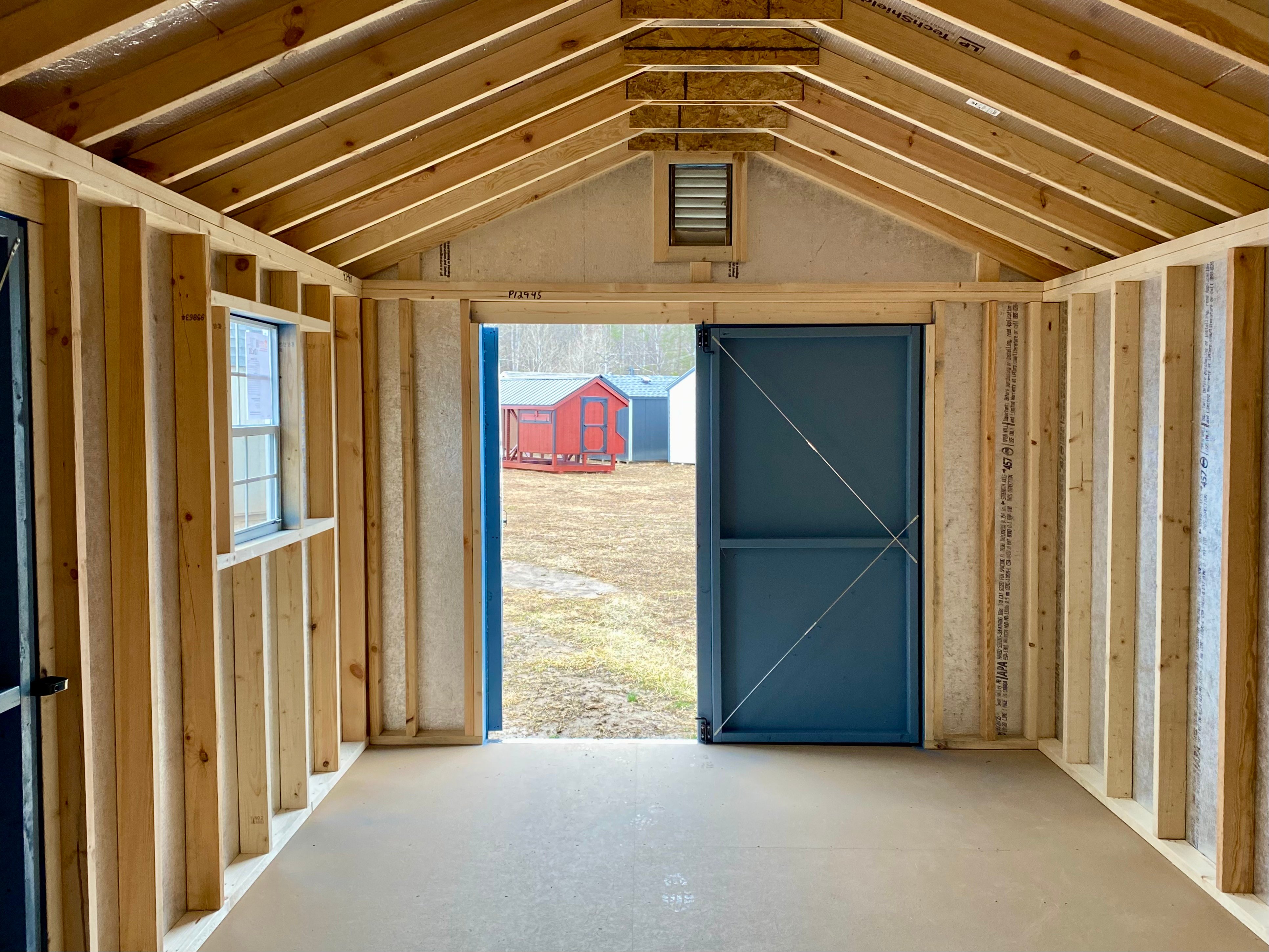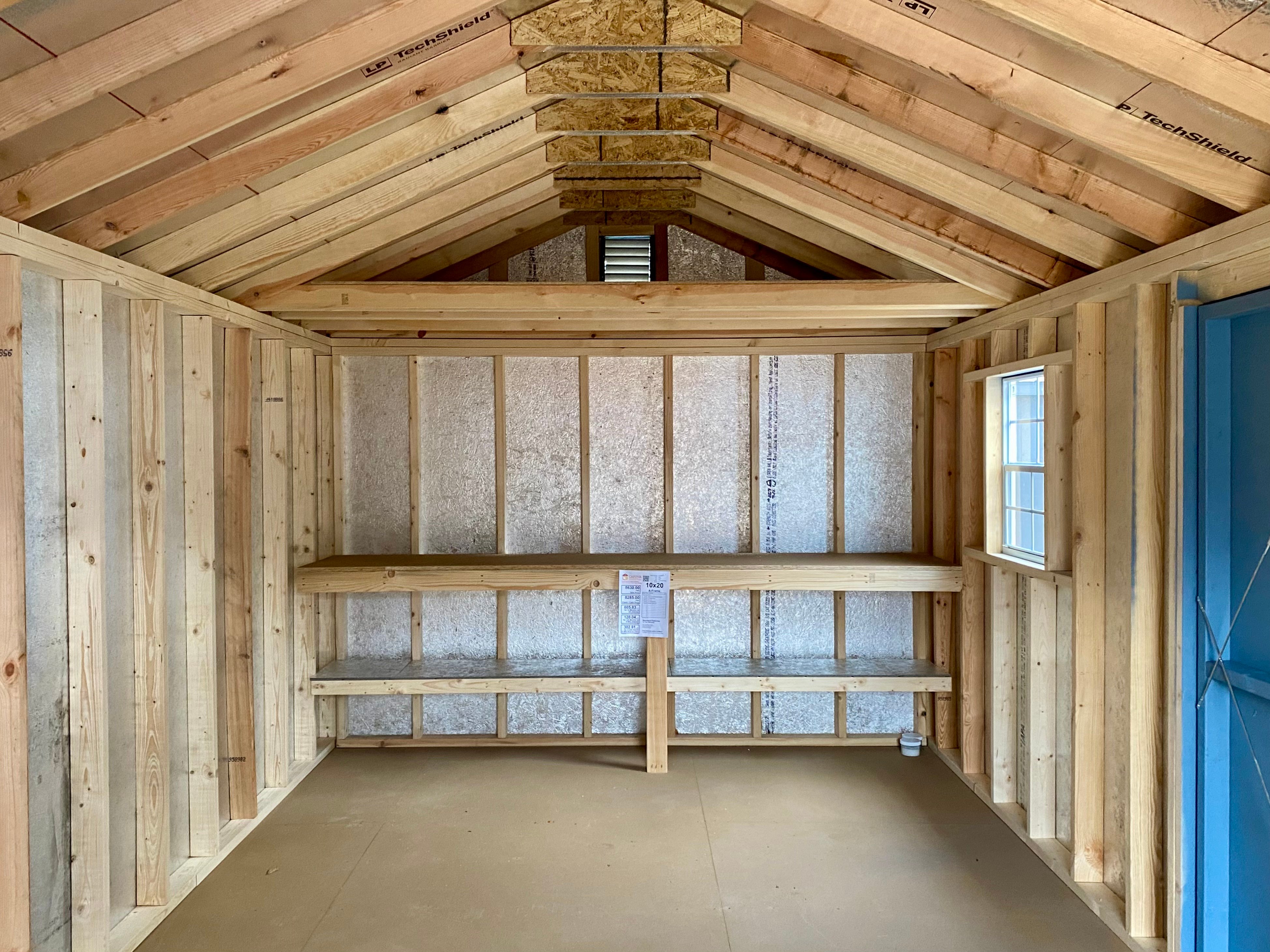 Style Name: A-Frame Size: 10×20 Siding: LP Smart Panel Main Color: Blue Trim Color: White Roof Color: Blue Roofing: Architectural Shingles Roofing Underlayment: Roof Felt Paper Number of Windows: 2 Number of Doors: 3 Wall Framing: 2×4 studs 16 inches on center Roof Framing: 2×4 rafters 16 inches on center Roof Sheeting: LP Tech Shield Flooring: LP T&G Prostruct Flooring Floor Joists: Pressure Treated 2×4 joists 12 inches on center   Included Upgrades: