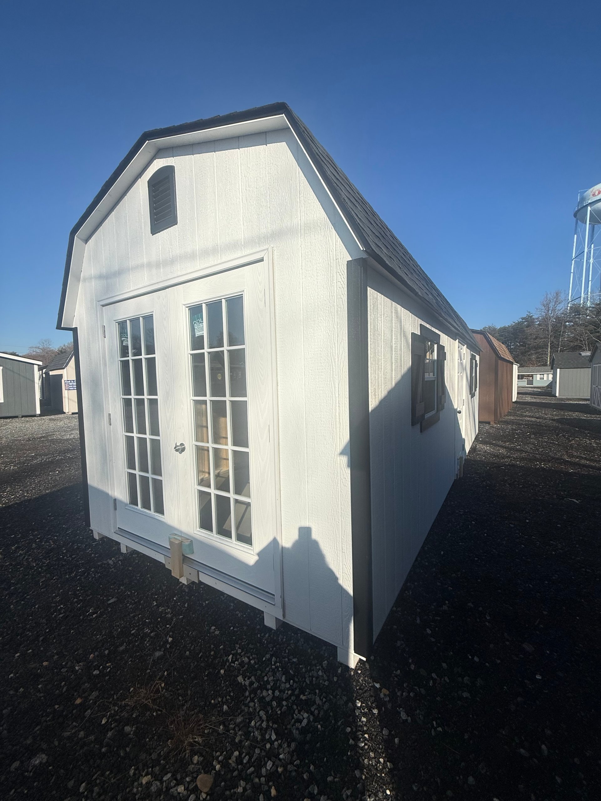 This 10×25 Dutch Barn in White with Black trim combines classic charm with practical design. Constructed with durable Smart Panel siding, 2×4 wall and roof framing spaced 16″ on center, LP Tech Shield roof sheeting, and LP T&G Prostruct flooring on pressure-treated 2×4 joists 12″ on center, it’s built to last. Two windows bring in natural light, while the 6ft double doors 15-lite and 8×7 Garage door with Glass provide easy access and a stylish touch. Perfect for a storage shed, workshop, or small hobby space, this Dutch Barn offers a timeless design, high-quality construction, and functional features to fit any backyard or property.