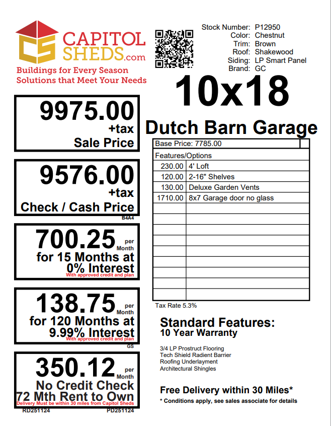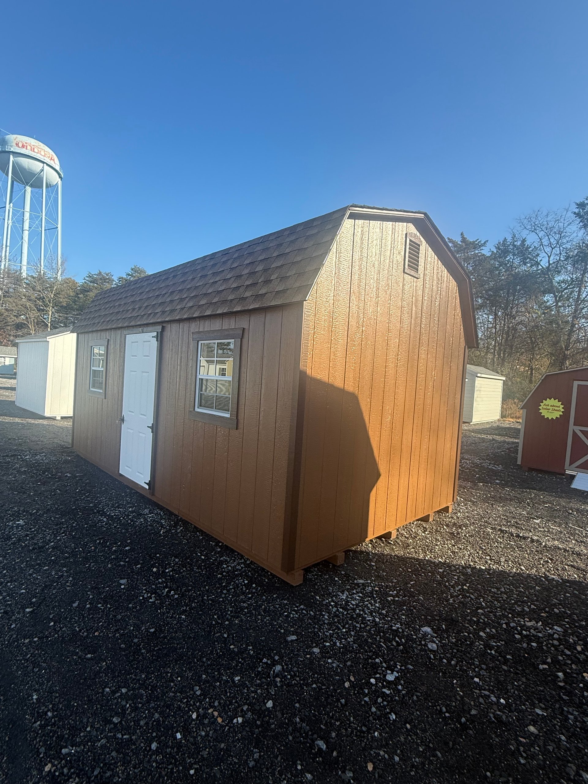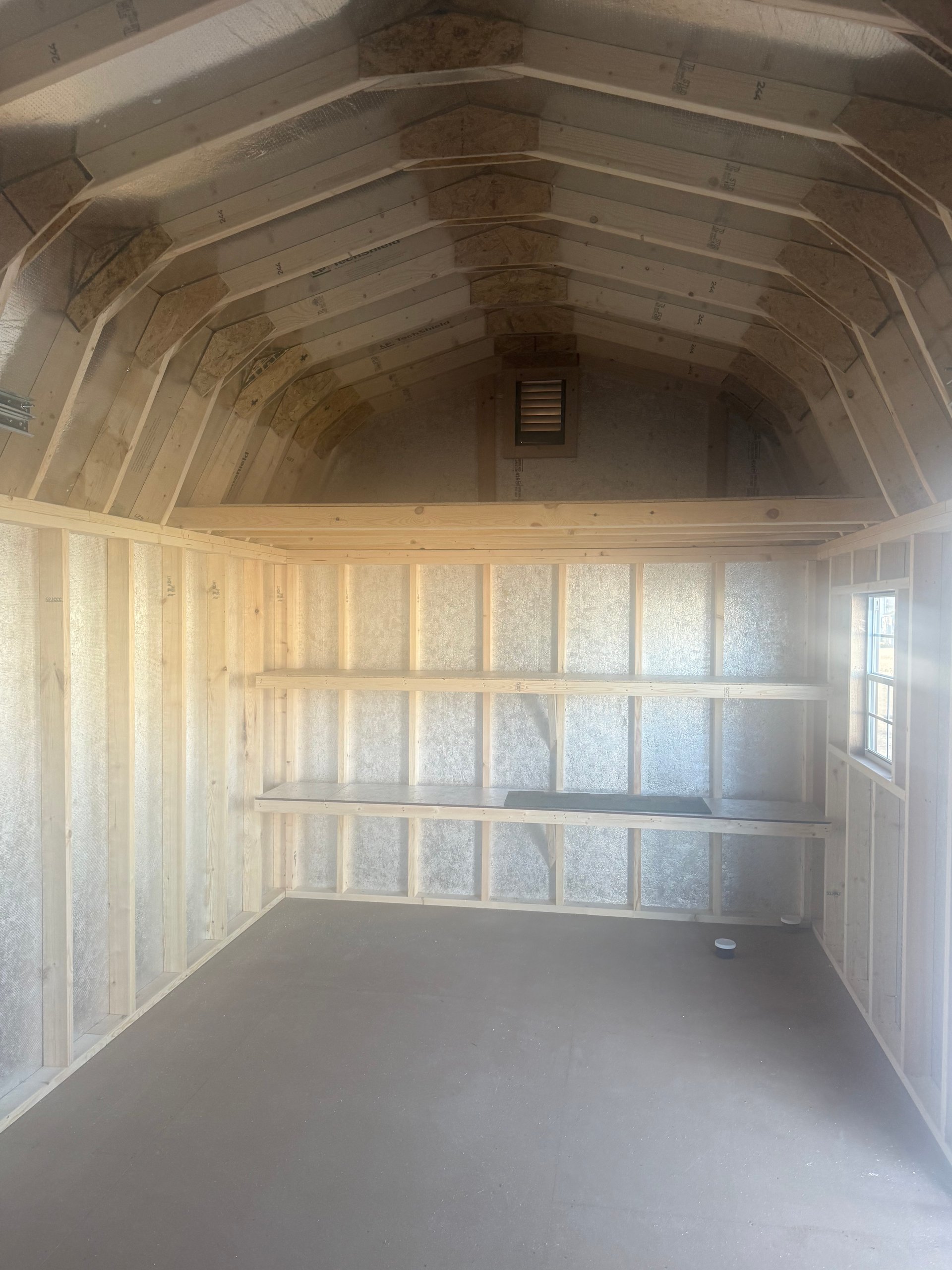 This 10×18 Dutch Barn in White with White trim combines classic charm with practical design. Constructed with durable Smartt Panel siding, 2×4 wall and roof framing spaced 16″ on center, LP Tech Shield roof sheeting, and LP T&G Prostruct flooring on pressure-treated 2×4 joists 12″ on center, it’s built to last. Two windows bring in natural light, while the 8×7 Garage door and 3′ FG SD provide easy access and a stylish touch. Perfect for a storage shed, workshop, or small hobby space, this Dutch Barn offers a timeless design, high-quality construction, and functional features to fit any backyard or property.