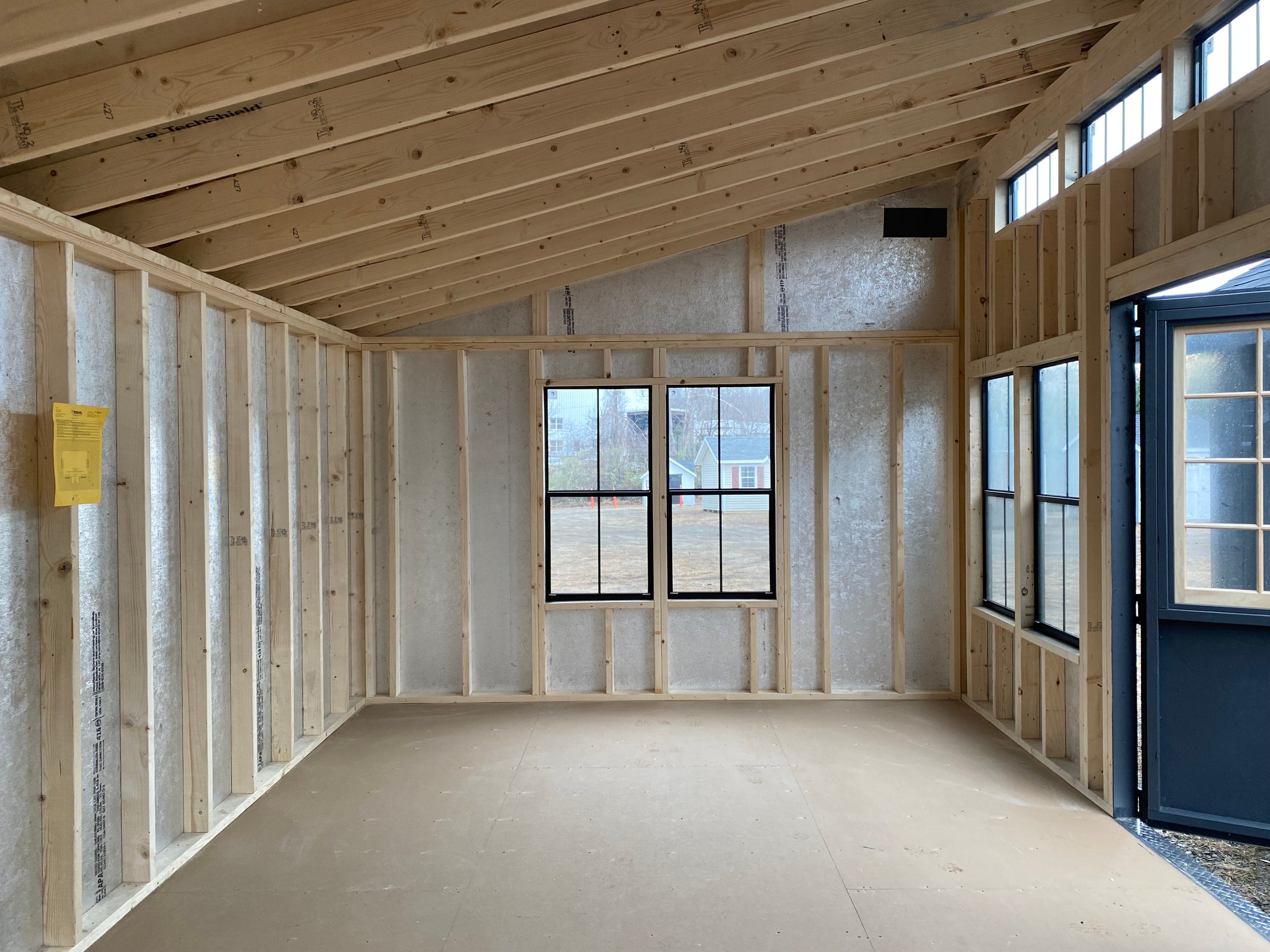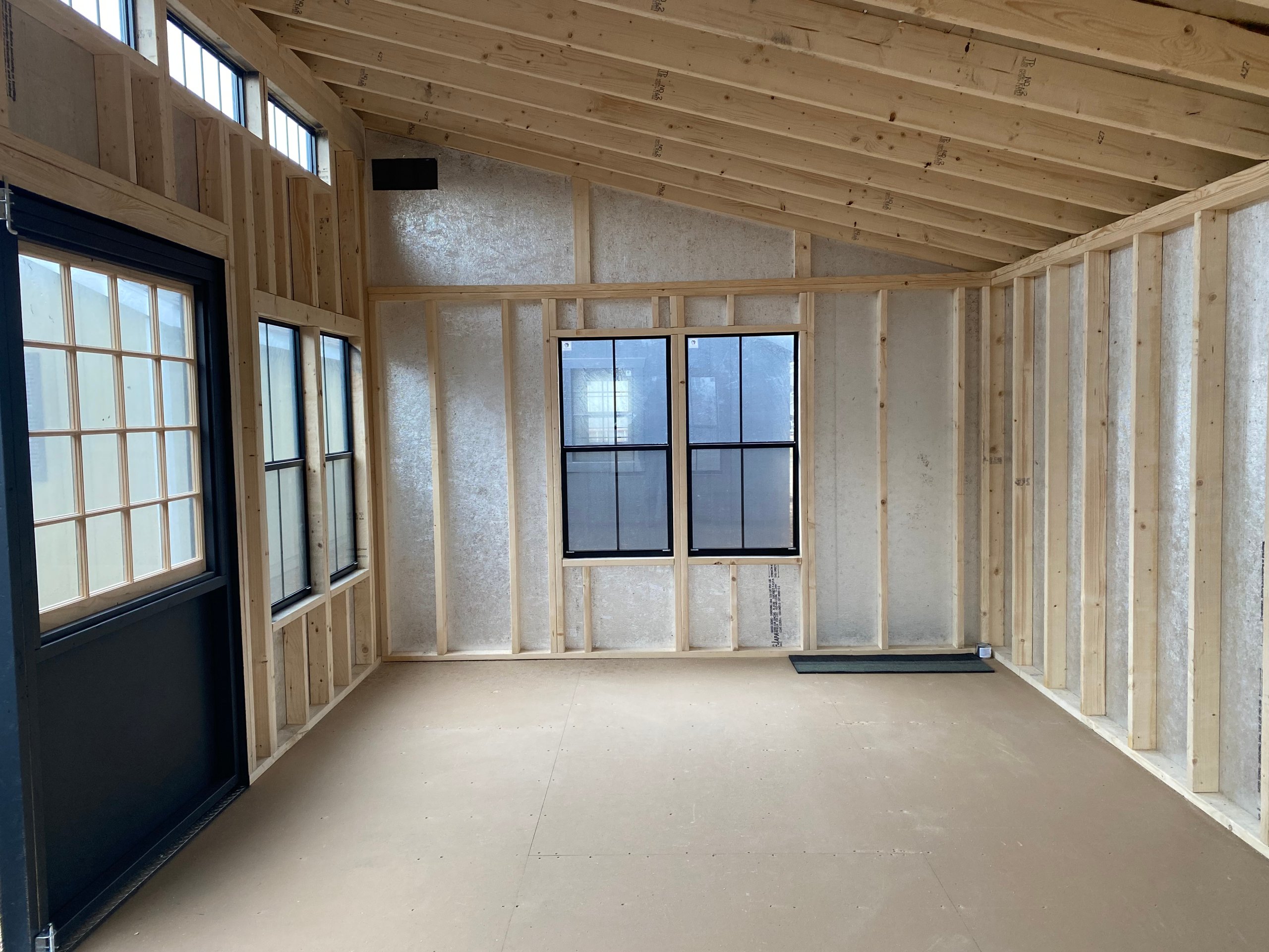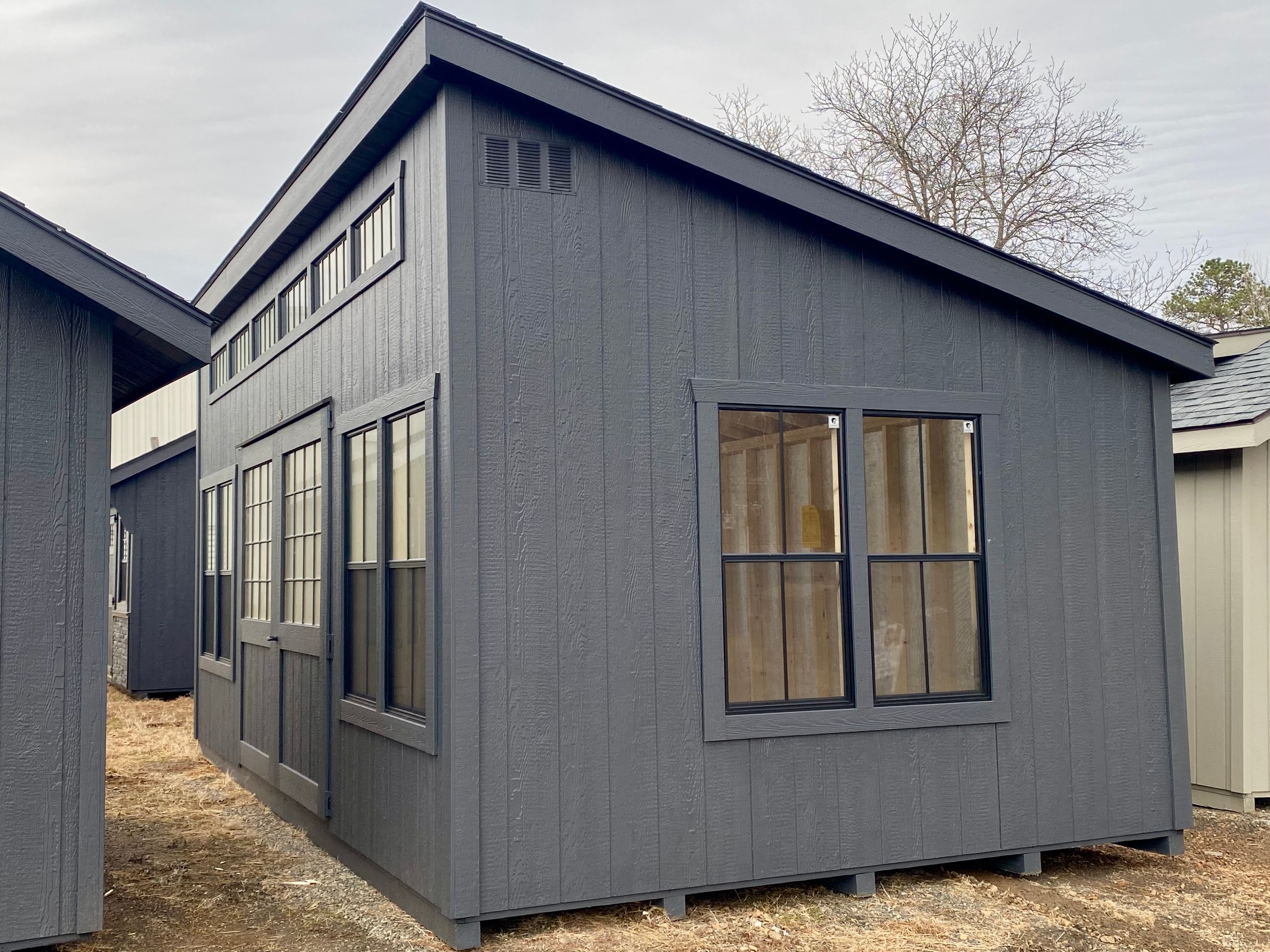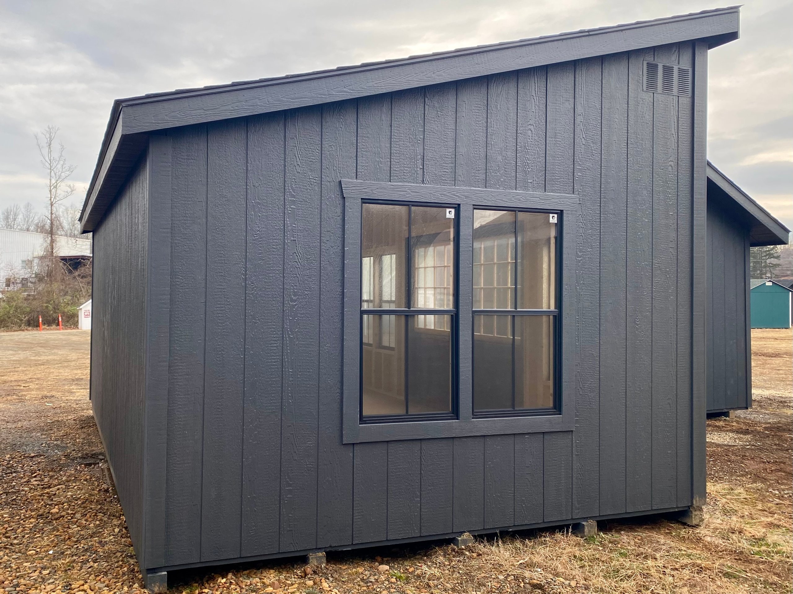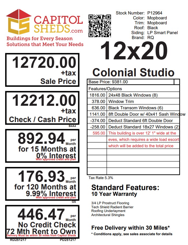 This 12×20 Colonial Studio offers a bright, open design with classic curb appeal and durable construction. Finished in a Mopboard exterior with matching trim, this shed features eight 24×48 black windows and black transom windows that flood the interior with natural light—perfect for a studio, office, or creative workspace. LP Smart Panel siding, LP Tech Shield roof sheathing, and architectural shingles provide long-lasting protection from the elements. Inside, LP ProStruct tongue-and-groove flooring rests on pressure-treated 2×4 floor joists spaced 12 inches on center for dependable strength. An 8-ft double door with wood sash windows adds both style and easy access.