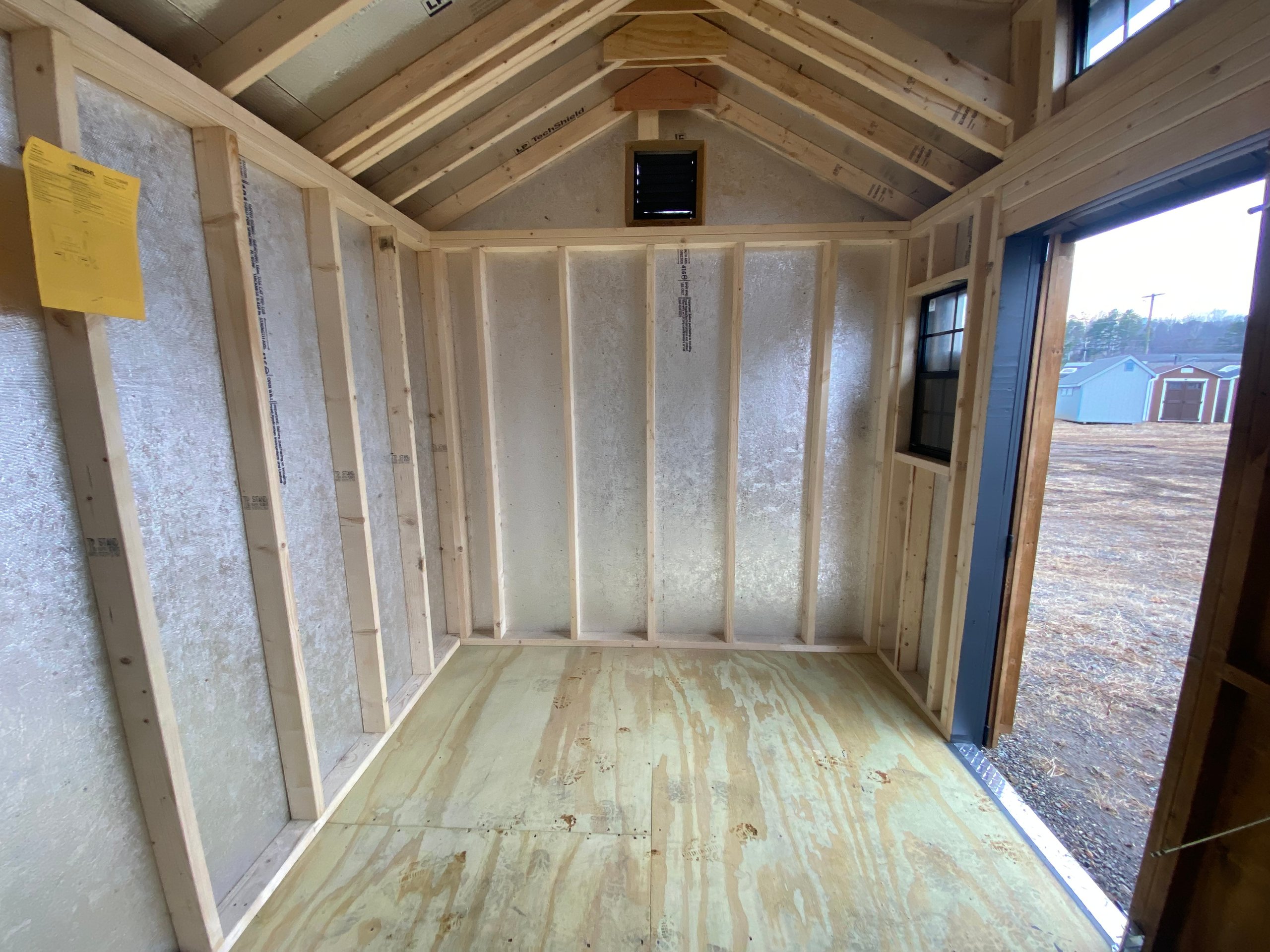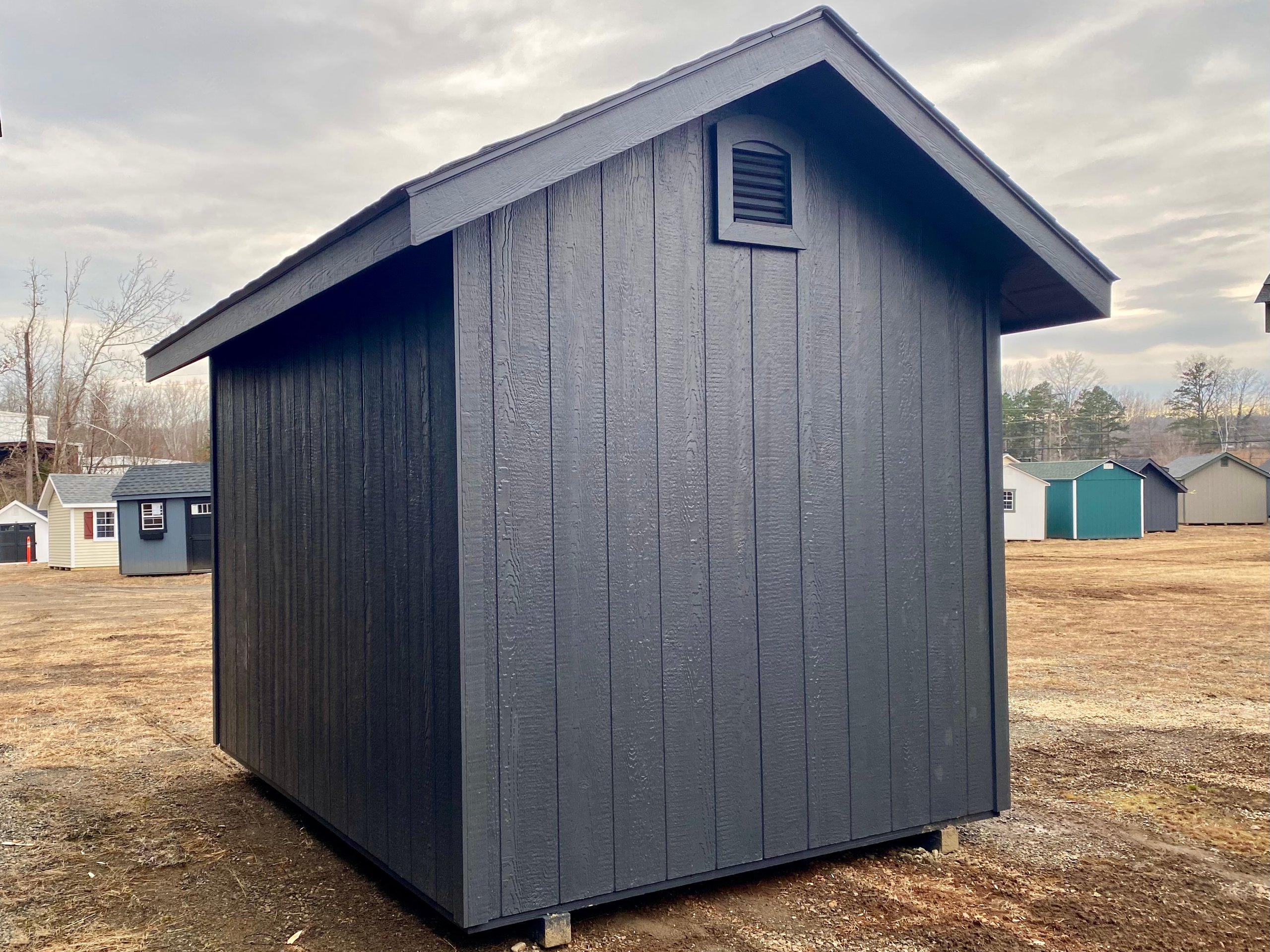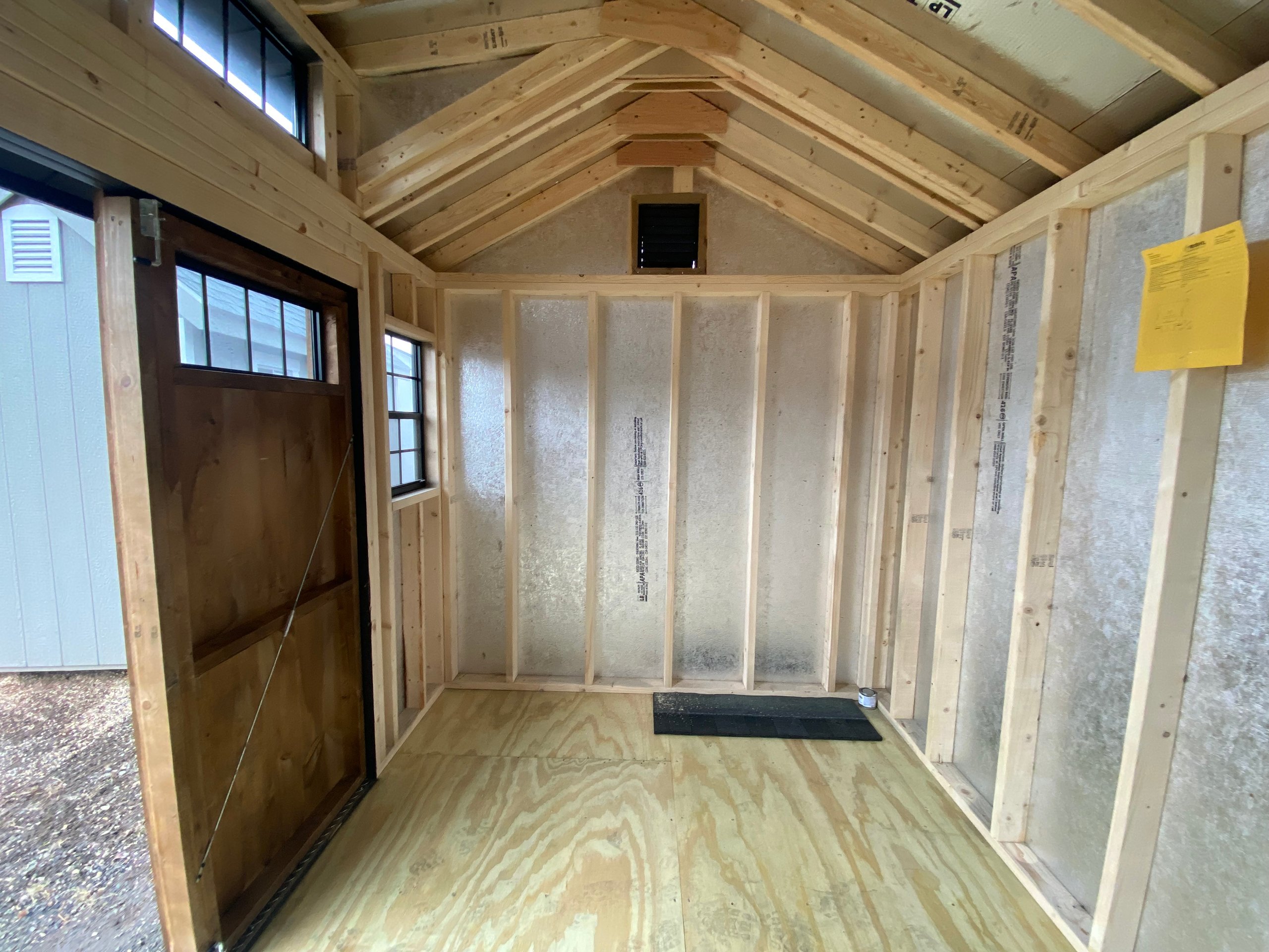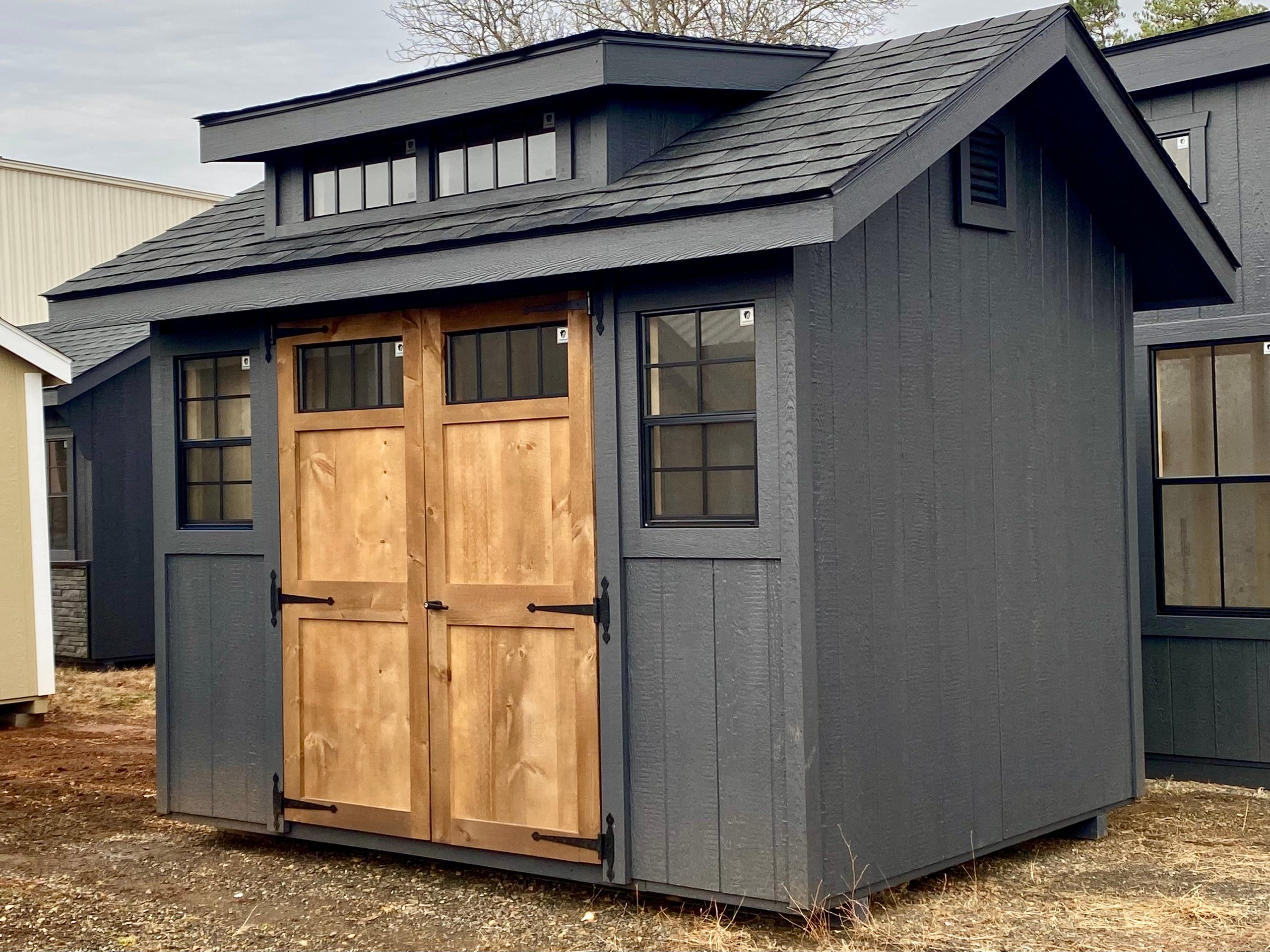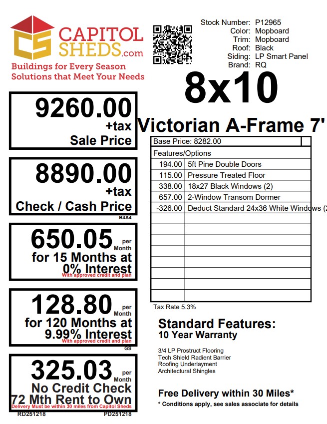 This 8×10 Victorian A-Frame 7′ shed combines charming architectural detail with solid, long-lasting construction. Finished in a Mopboard exterior with matching trim, this shed features a striking black architectural shingle roof and a 2-window transom dormer that enhances both curb appeal and natural light. Two 18×27 black windows brighten the interior, while 5-ft pine double doors provide easy access and classic style. Built with LP Smart Panel siding, LP Tech Shield roof sheathing, and 2×4 framing spaced 16 inches on center, this shed also includes a durable ¾” pressure-treated wood floor supported by pressure-treated 2×4 floor joists for reliable strength and longevity.