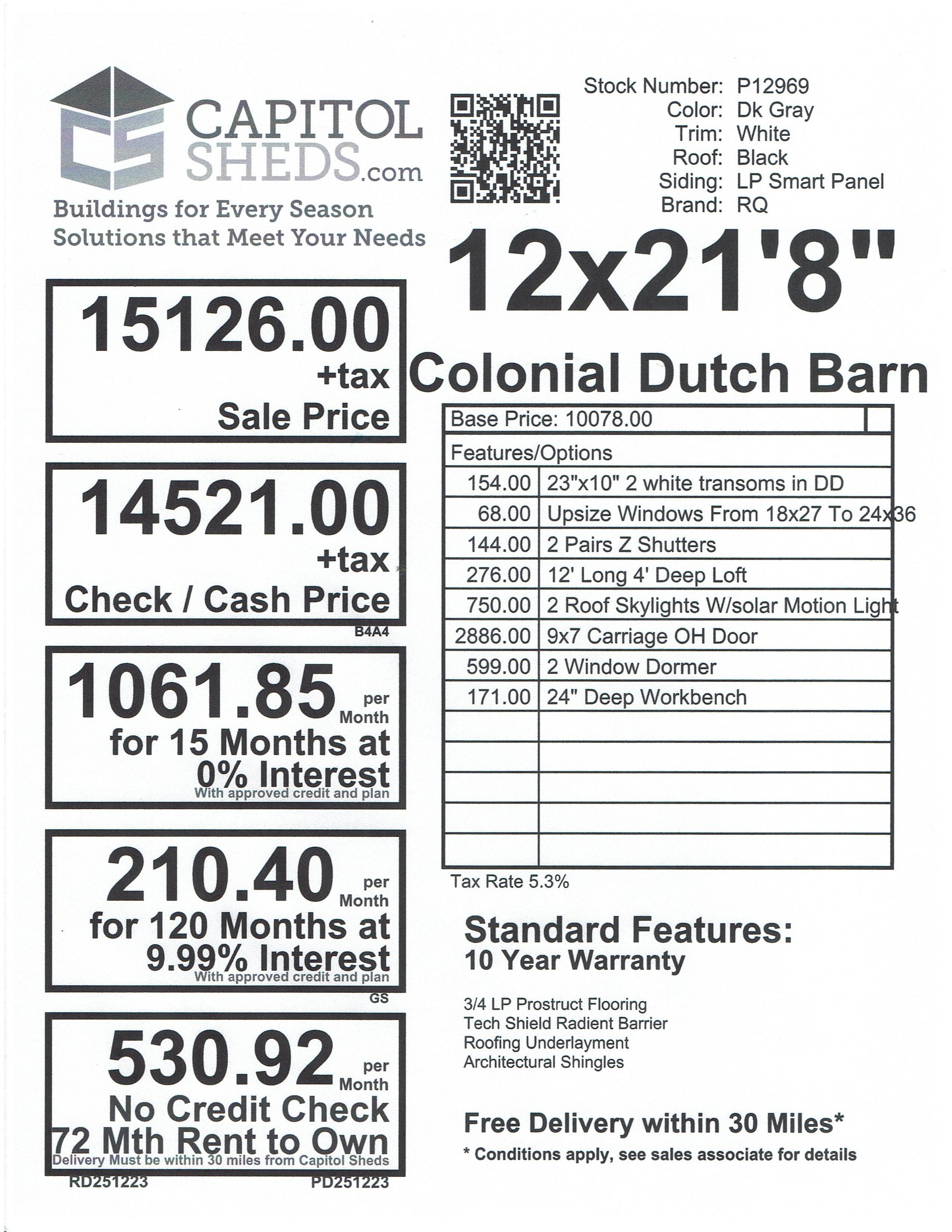 Reserve this building for a $500 deposit. Within 1 business day a rep will contact you to discuss delivery details and discounts you may qualify for such as cash/check, military/1st responder, etc. Don’t lose out on this beautiful building – Place your deposit today to hold it!