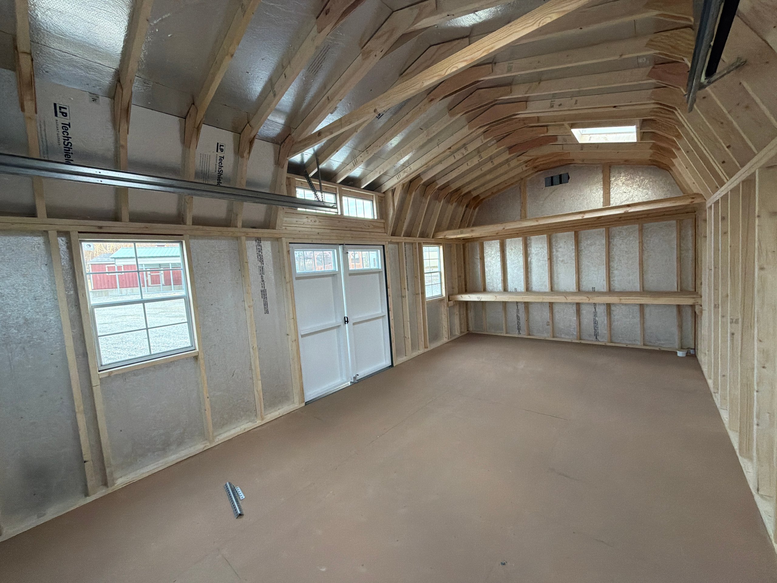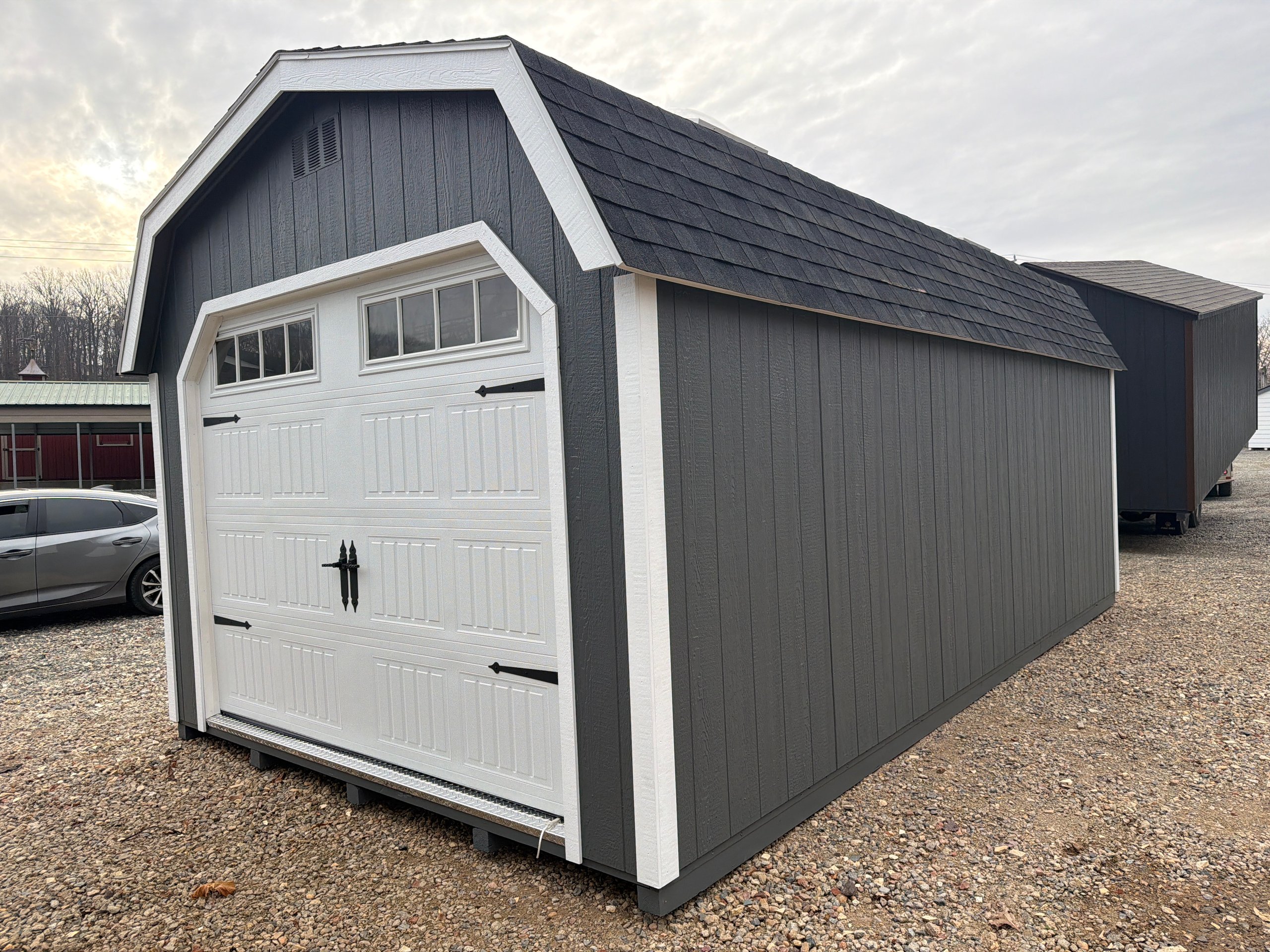 This 12×21 8″ Colonial Dutch Barn shed delivers classic curb appeal paired with high-end functionality. Built with LP Smart Panel siding in Ronks Gray, accented by white trim and a charcoal roof, it features a striking 9×7 carriage-style overhead door and elegant window dormer. Upsized 24×36 windows, transom windows in the double doors, skylights with solar motion lighting providing the interior with light. Inside, durable 3/4″ LP ProStruct flooring supports a spacious 12′ long, 4′ deep loft and a 24″ deep workbench—ideal for storage, projects, or hobbies.