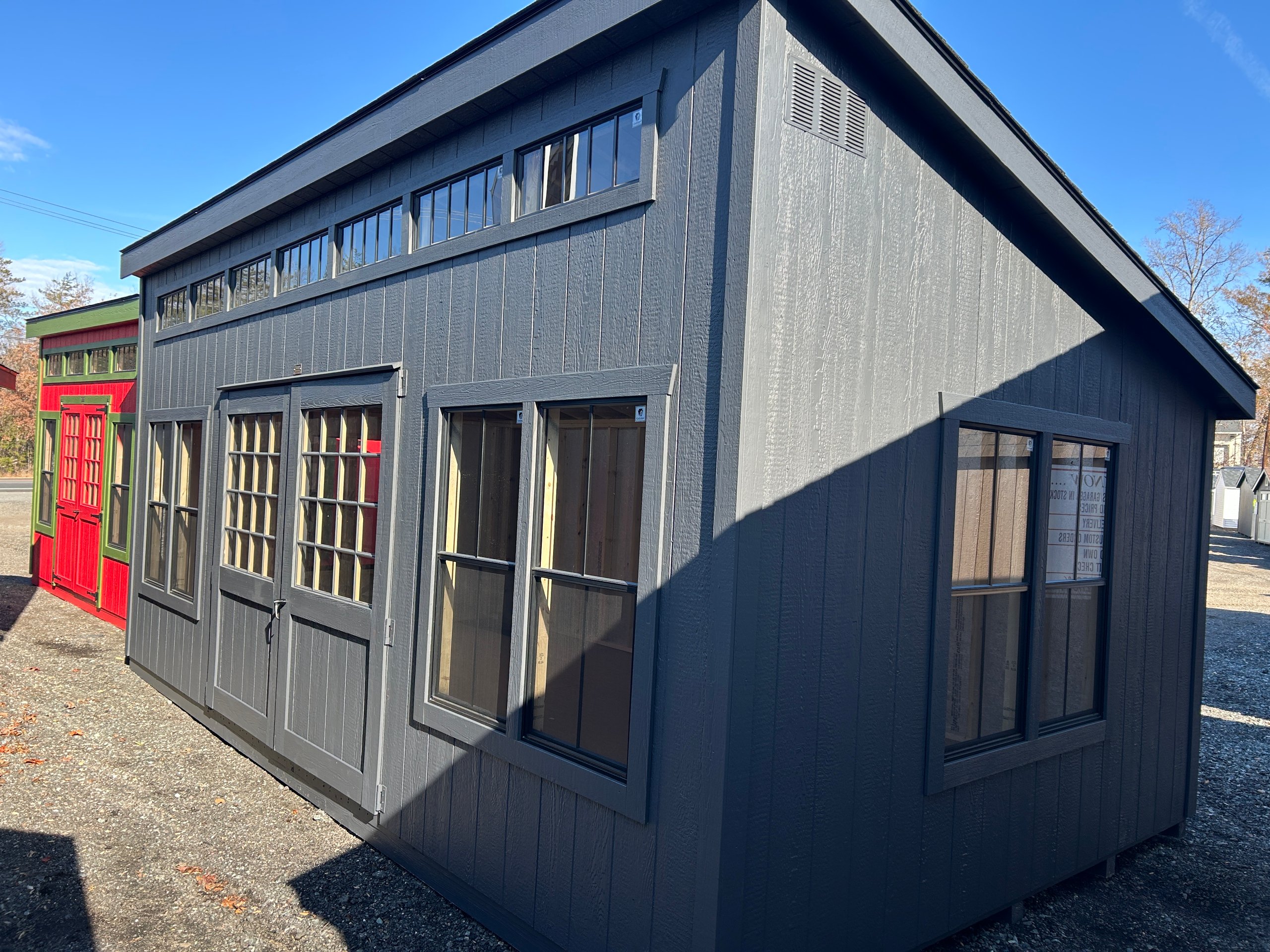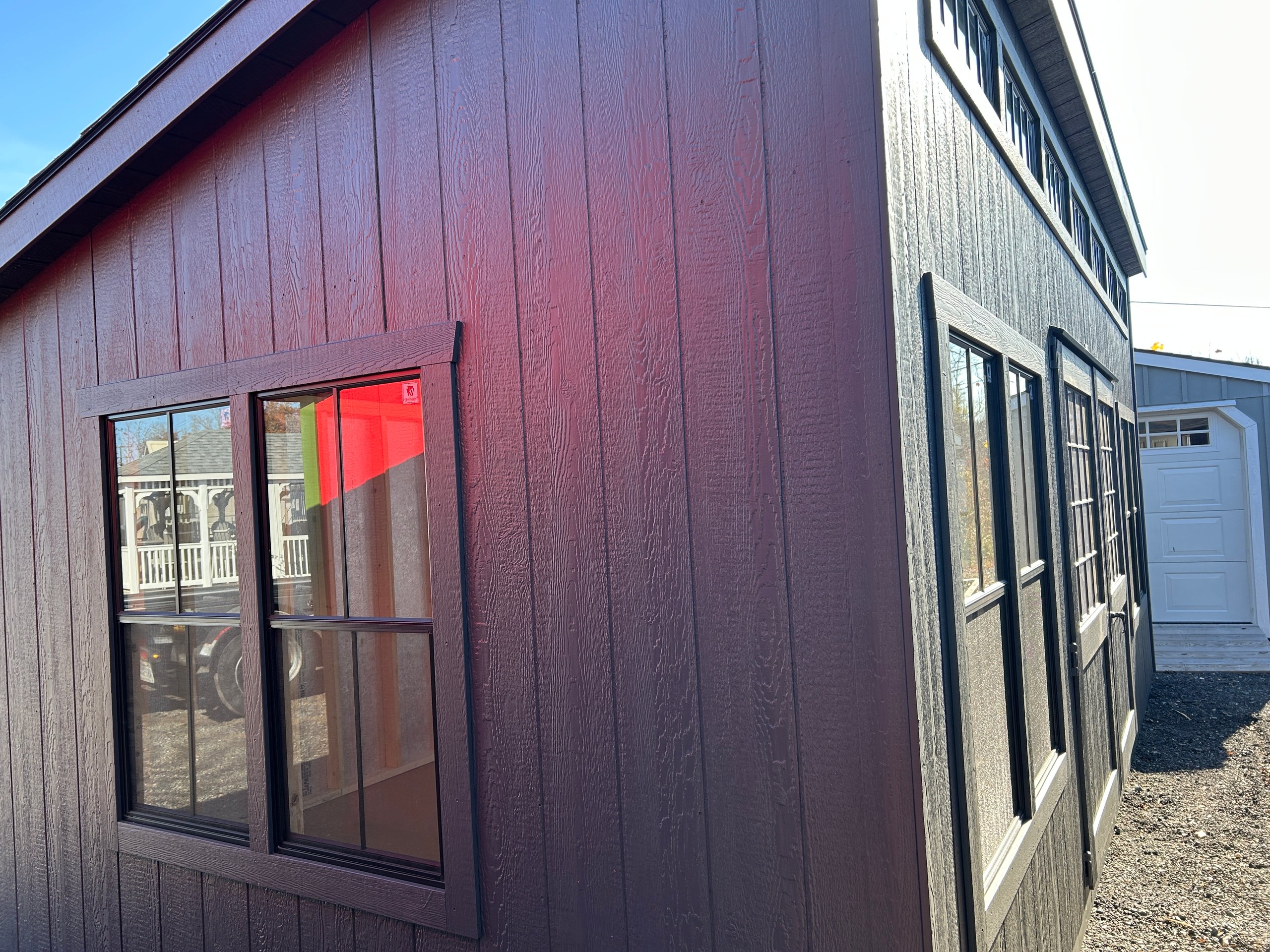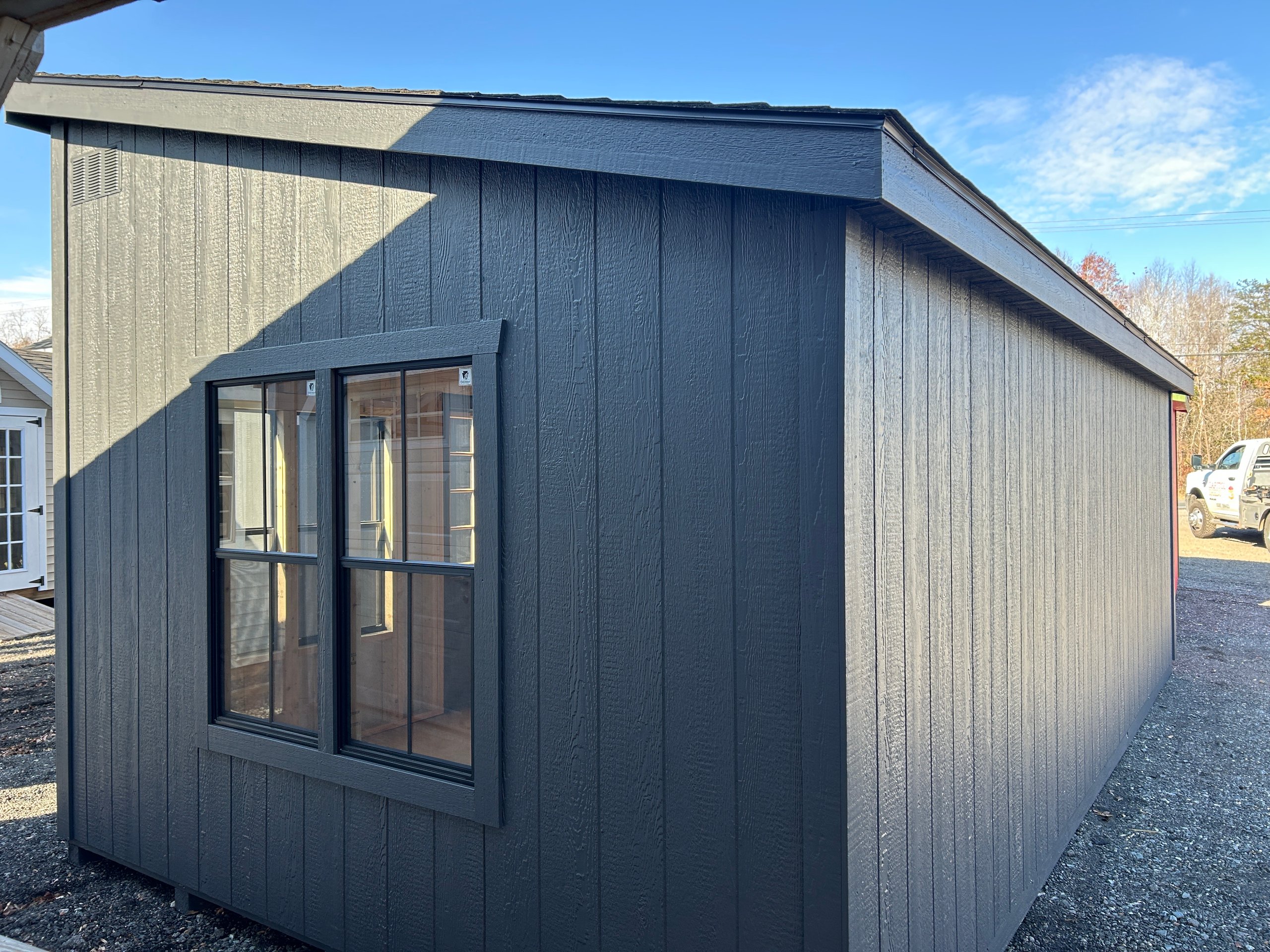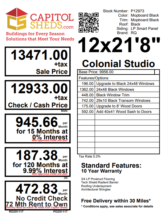 The 12×21’8″ Colonial Studio presents a commanding, contemporary look with its Mopboard Black LP SmartPanel with Silverbacker siding, matching trim, and Black architectural shingles. Engineered for superior longevity, it features 2×4 wall and roof framing 12″ on center, LP Tech Shield, LP ProStruct flooring, and pressure-treated joists designed for dependable structural performance. With 17 black 24×48 windows, black 29×10 transom windows, and refined black window trim, the space offers expansive natural light and elevated aesthetics. Dual 8′ wood doors with 40×41 wood sash inserts create a standout entrance, positioning this studio as a premium workspace or executive backyard retreat.