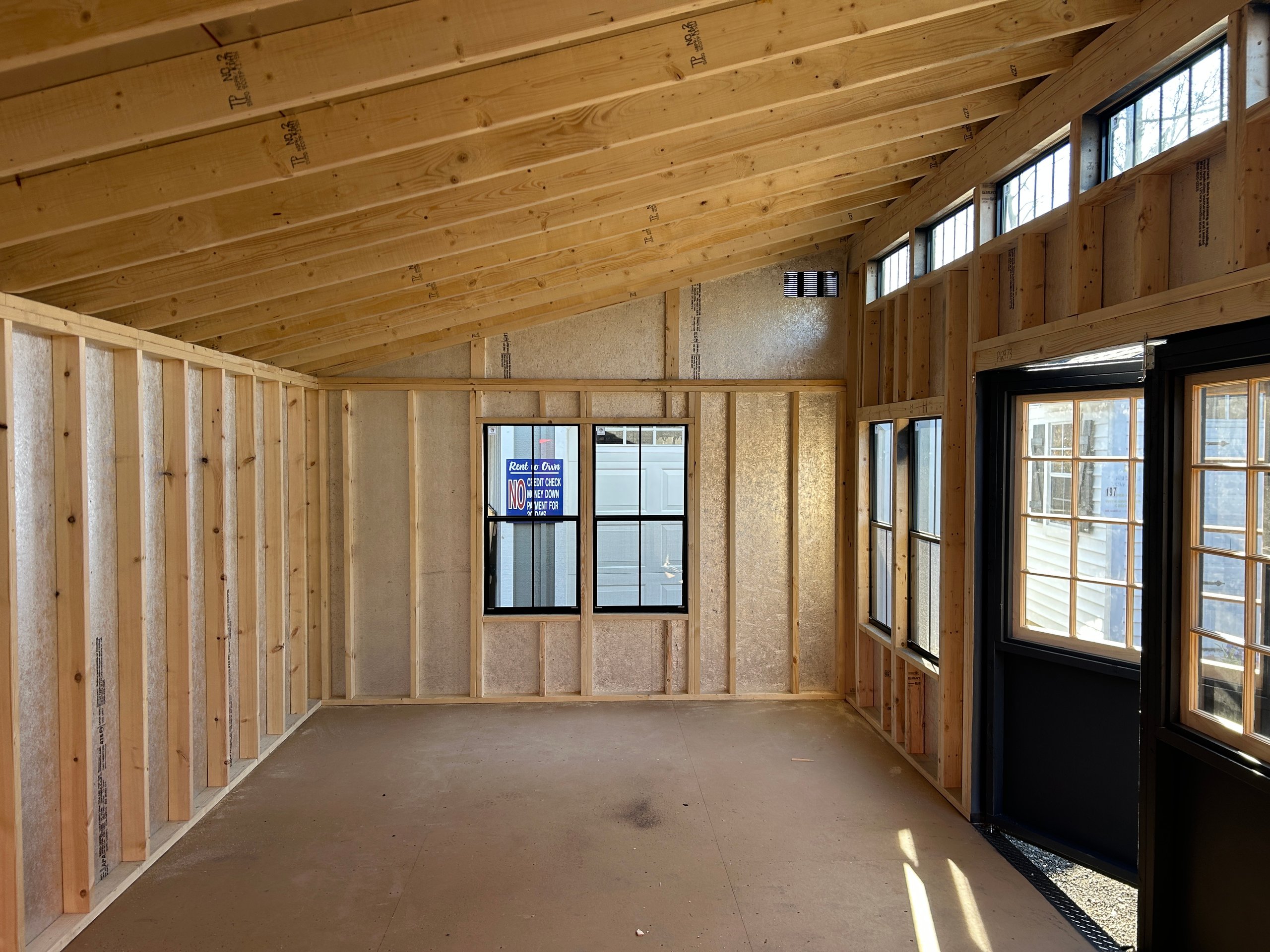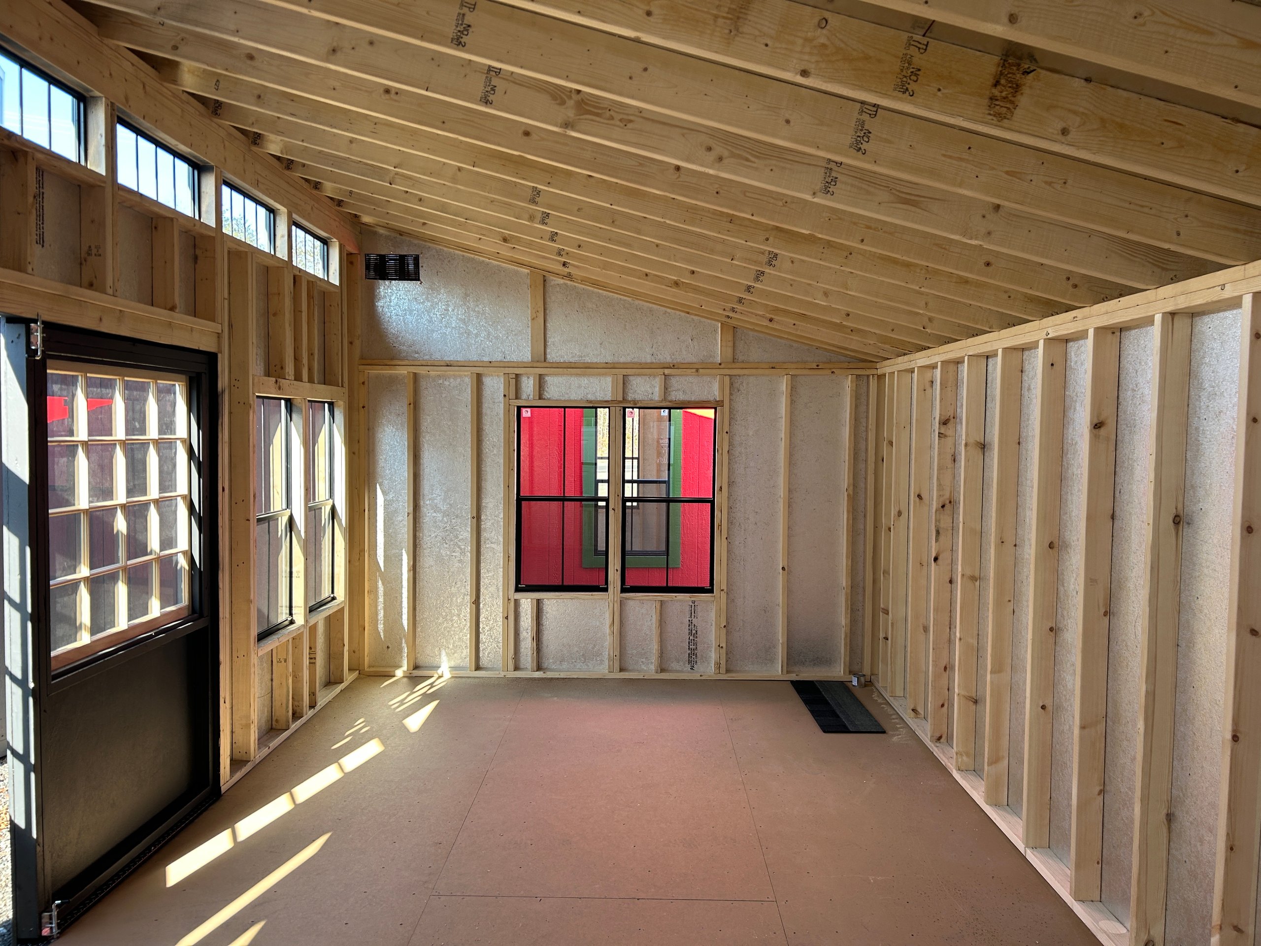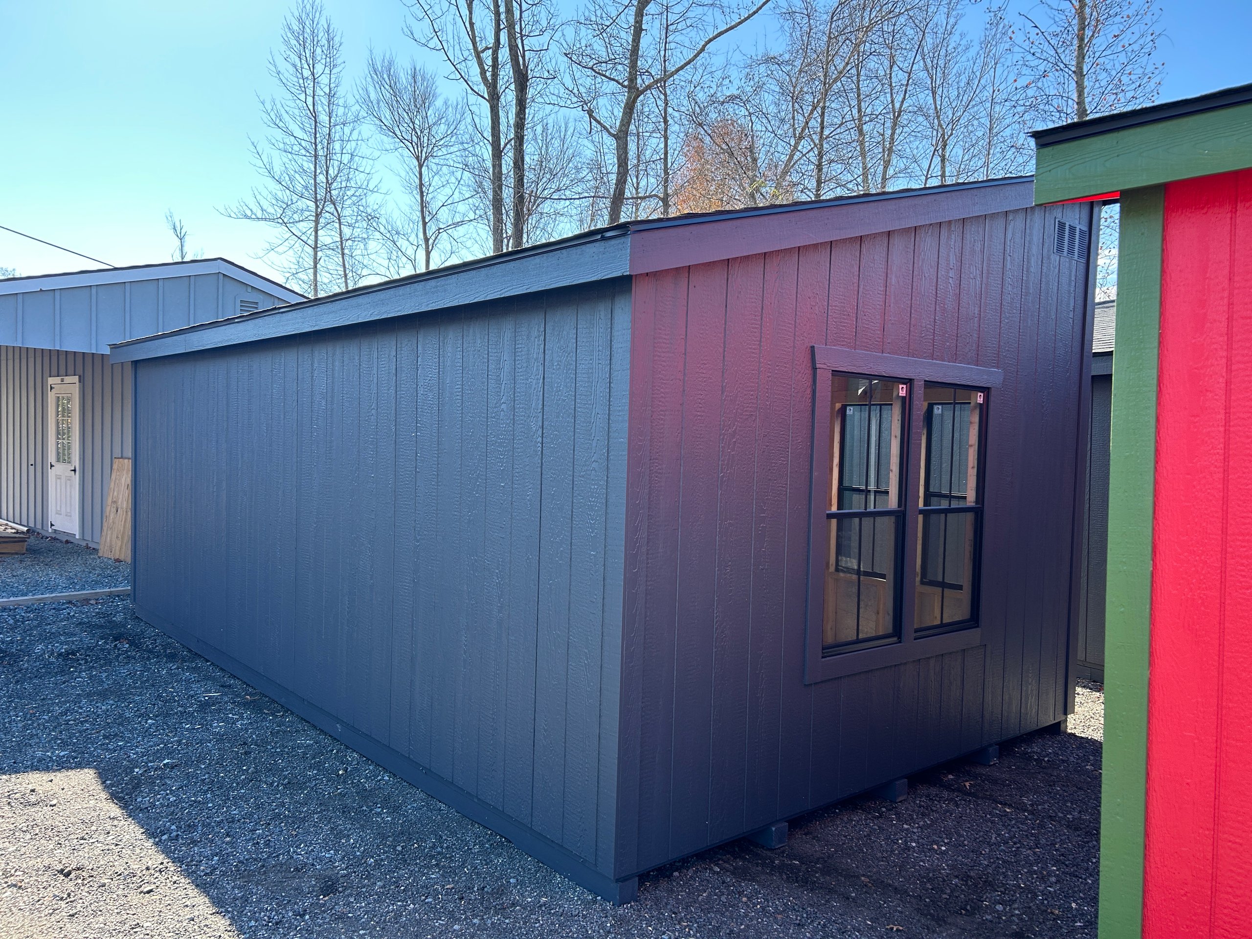 The 12×21’8″ Colonial Studio presents a commanding, contemporary look with its Mopboard Black LP SmartPanel with Silverbacker siding, matching trim, and Black architectural shingles. Engineered for superior longevity, it features 2×4 wall and roof framing 12″ on center, LP Tech Shield, LP ProStruct flooring, and pressure-treated joists designed for dependable structural performance. With 17 black 24×48 windows, black 29×10 transom windows, and refined black window trim, the space offers expansive natural light and elevated aesthetics. Dual 8′ wood doors with 40×41 wood sash inserts create a standout entrance, positioning this studio as a premium workspace or executive backyard retreat.