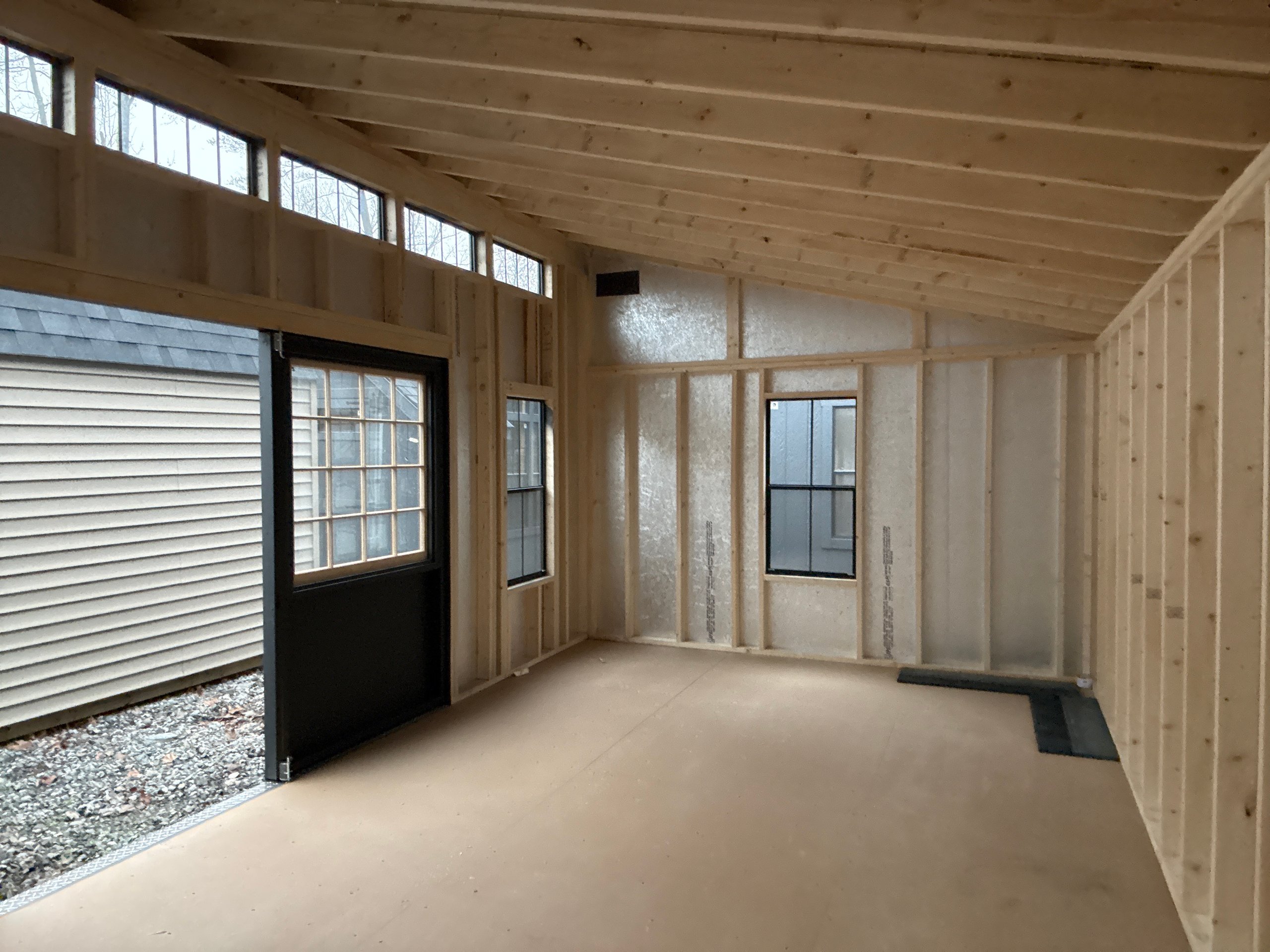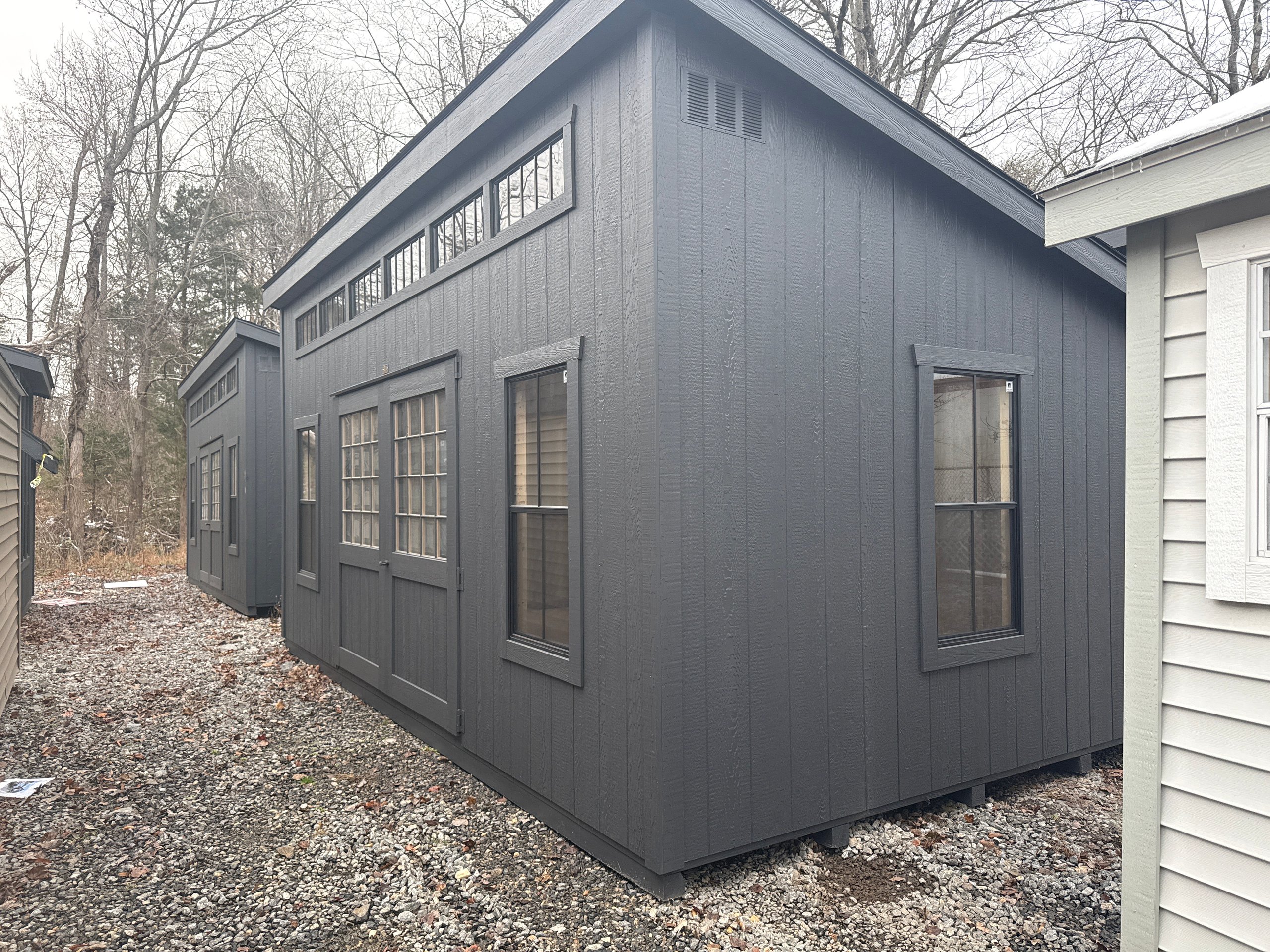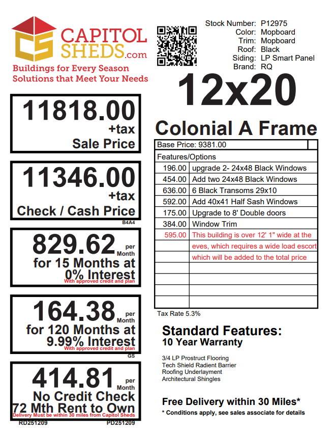 Style Name: Colonial Studio Size: 12×20 Siding: LP SmartPanel with Silverbacker Main Color: Mopboard Black Trim Color: Mopboard Black Roof Color: Black Roofing: Architectural Shingles Roofing Underlayment: Roof Felt Paper Number of Windows: 12 Number of Doors: 2 Wall Framing: 2×4 studs 16 inches on center Roof Framing: 2×4 rafters 16 inches on center Roof Sheeting: LP Tech Shield Flooring: LP Prostruct Flooring Floor Joists: Pressure Treated 2×4 joists 8 inches on center Included Upgrades: Mopboard Black Window Trim 8′ Wood Double Door 40×41 Wood Sash Transom Windows 24×48 Black Windows