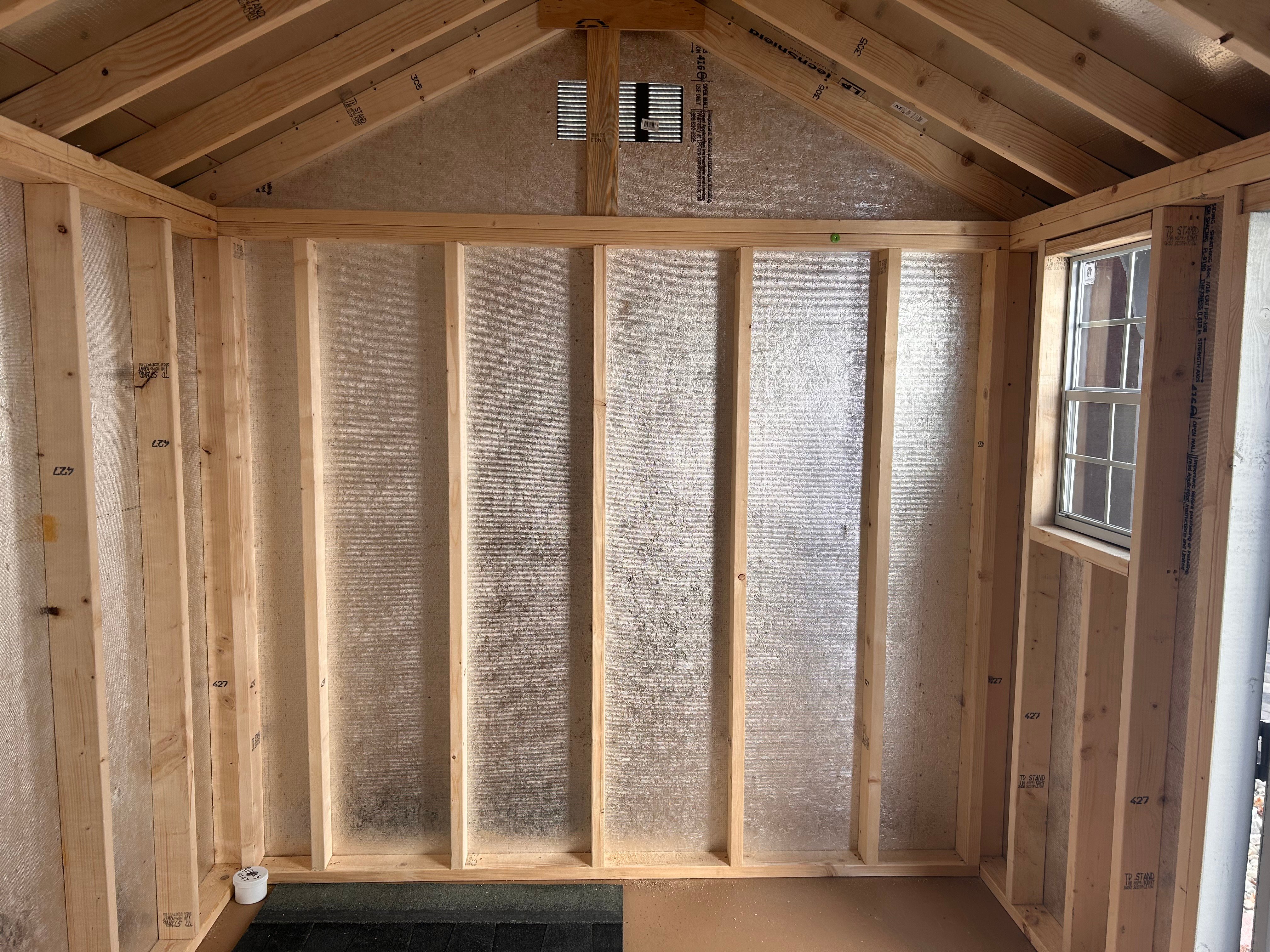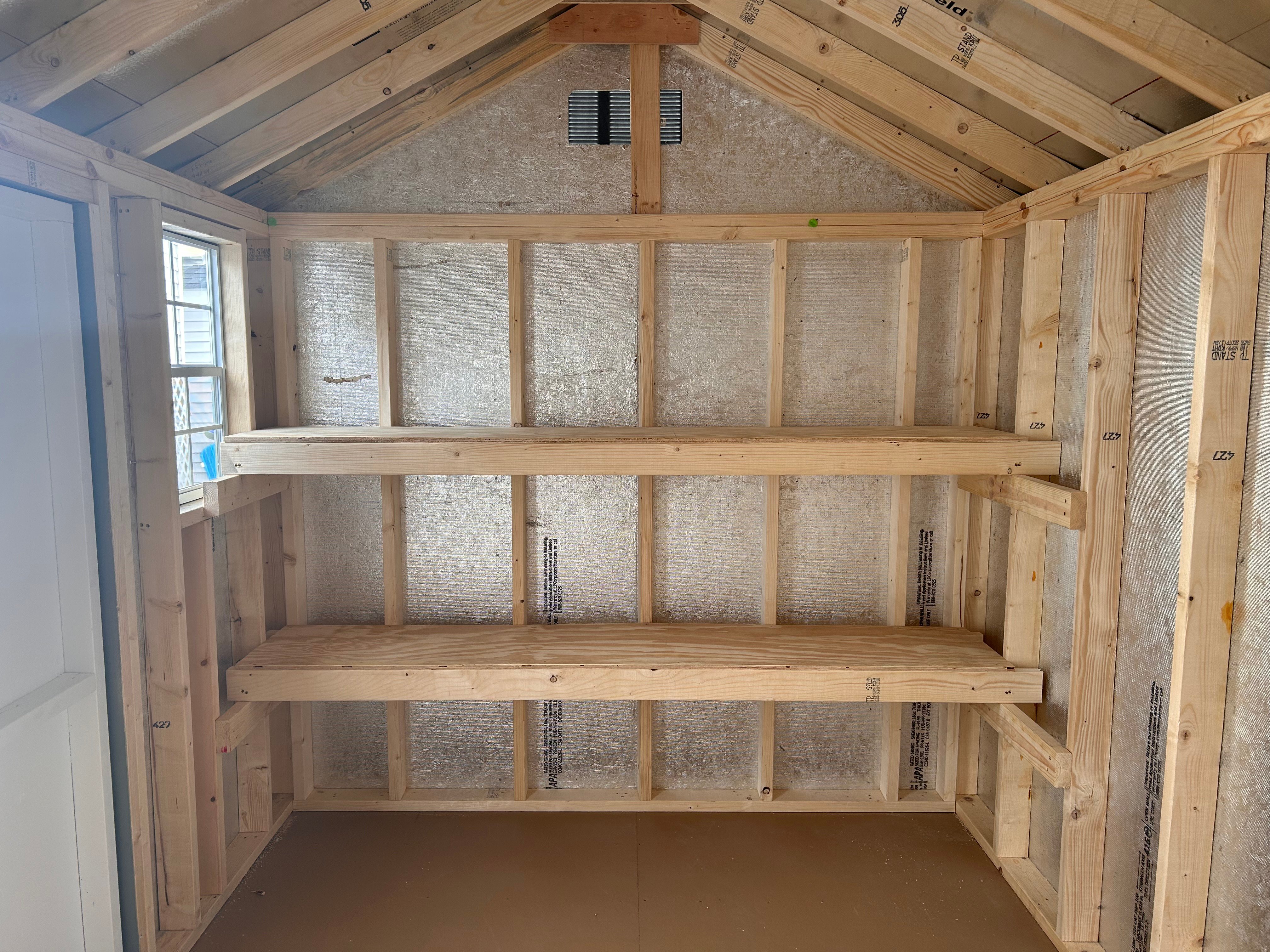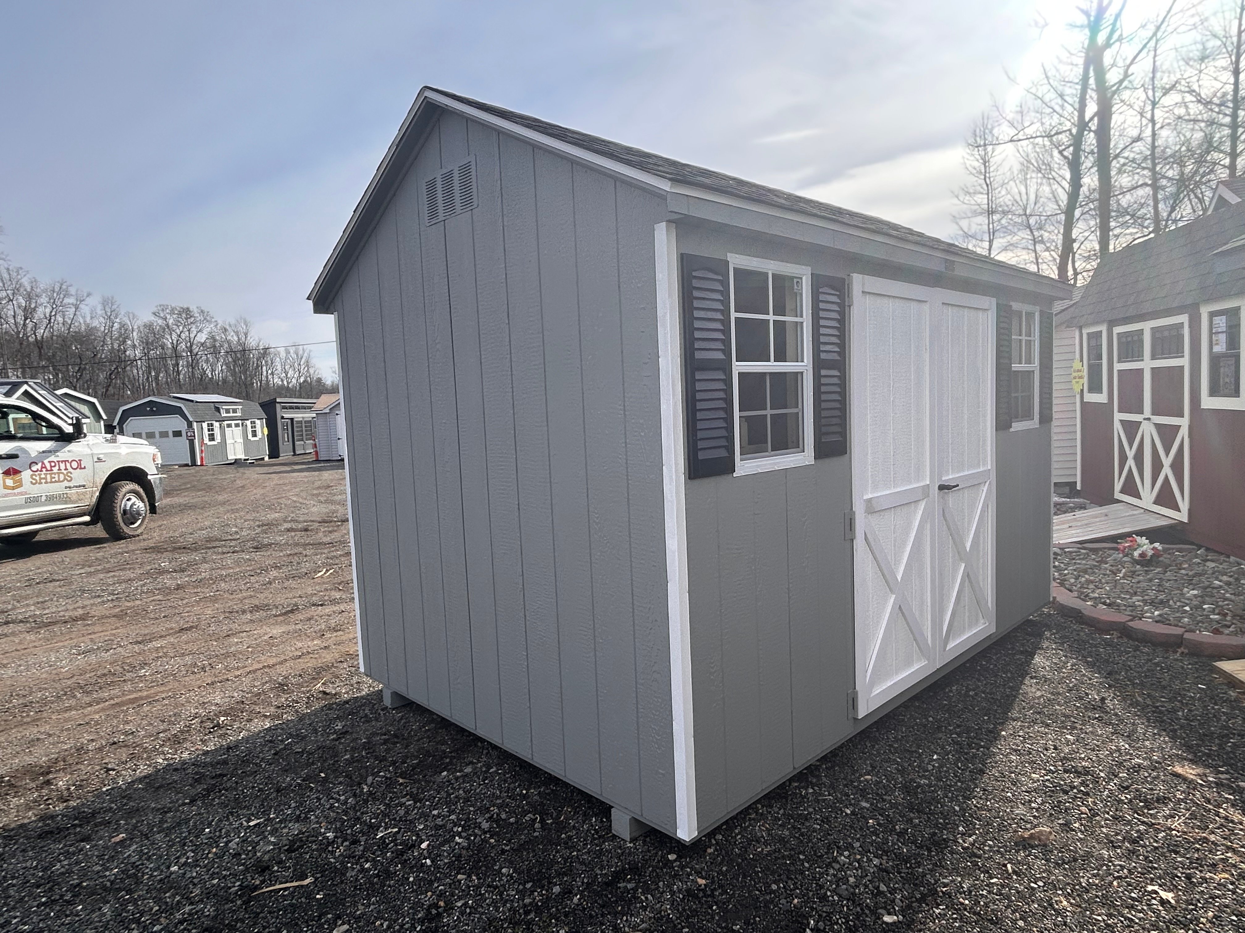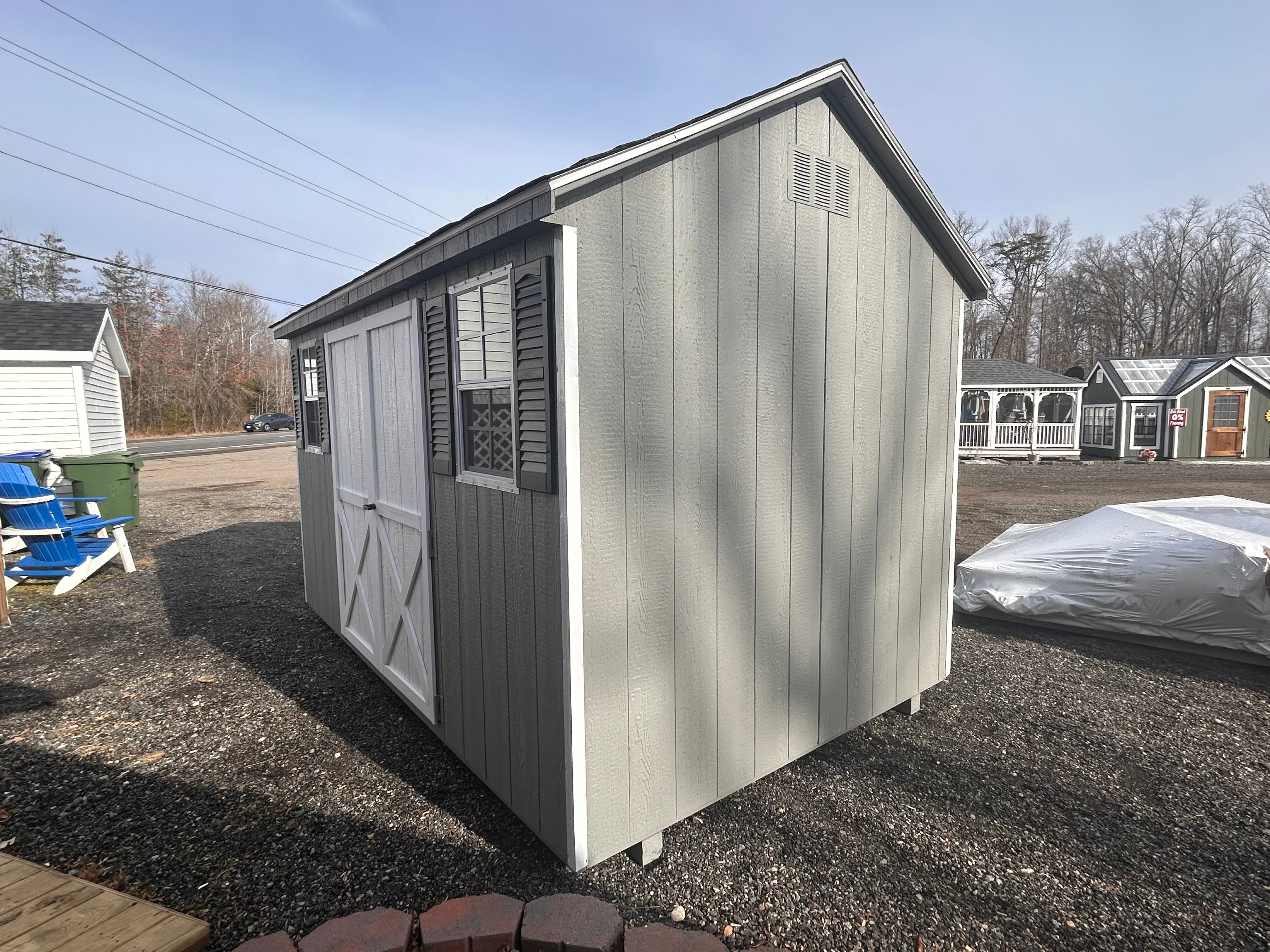 Elevate your backyard storage with this Amish-built A-frame shed, crafted for durability and style. Measuring 8×12, it features classic Ronks Gray LP Smart Panel siding with crisp white trim and a sleek black roof. Enjoy upgraded functionality with a 5′ double door for easy access and two sturdy interior shelves to keep your tools and gear organized. Built with expert craftsmanship, this shed combines timeless design with practical storage solutions, making it the perfect addition to any yard. Reliable, stylish, and built to last—your storage solution has never looked this good.