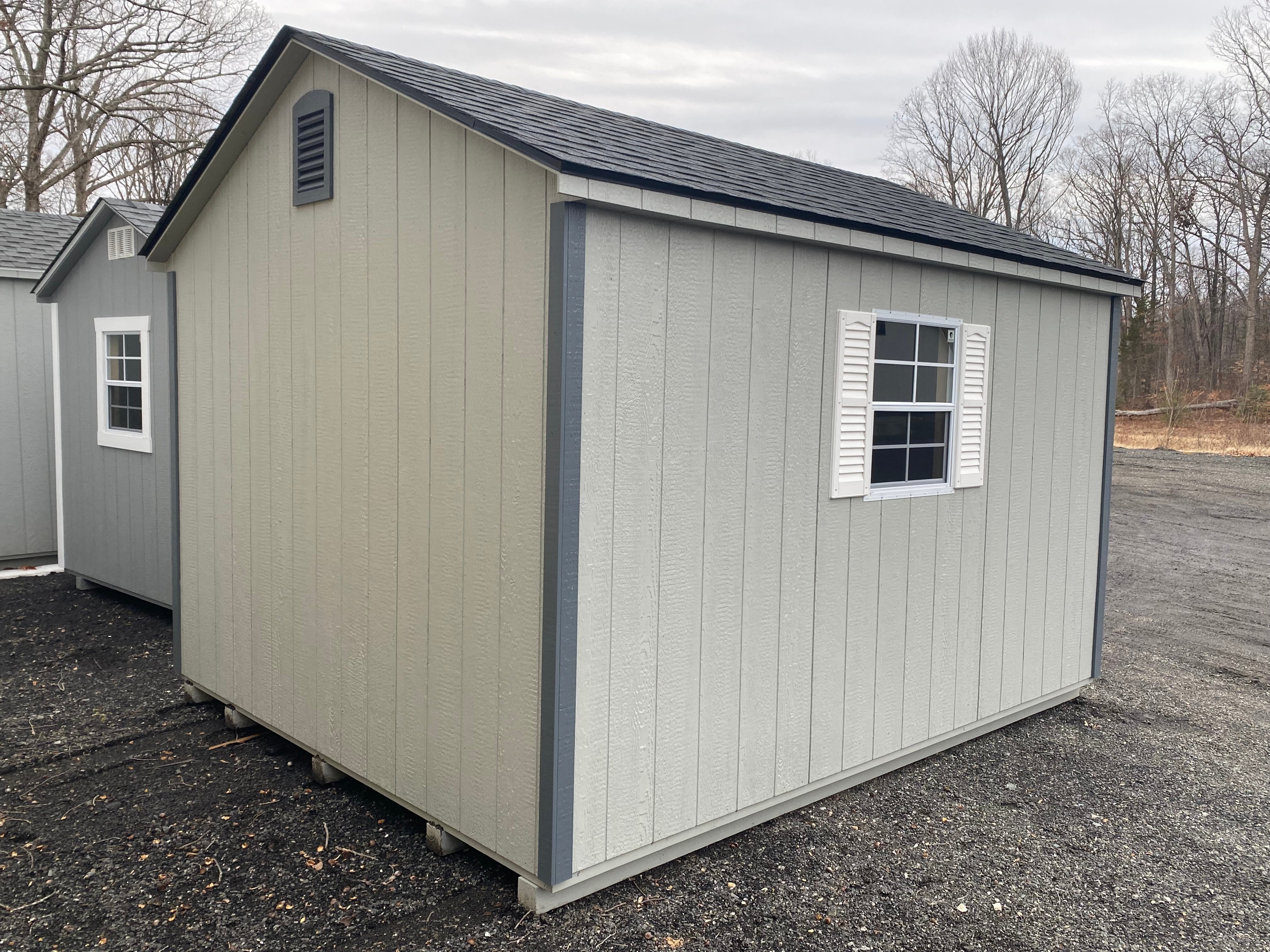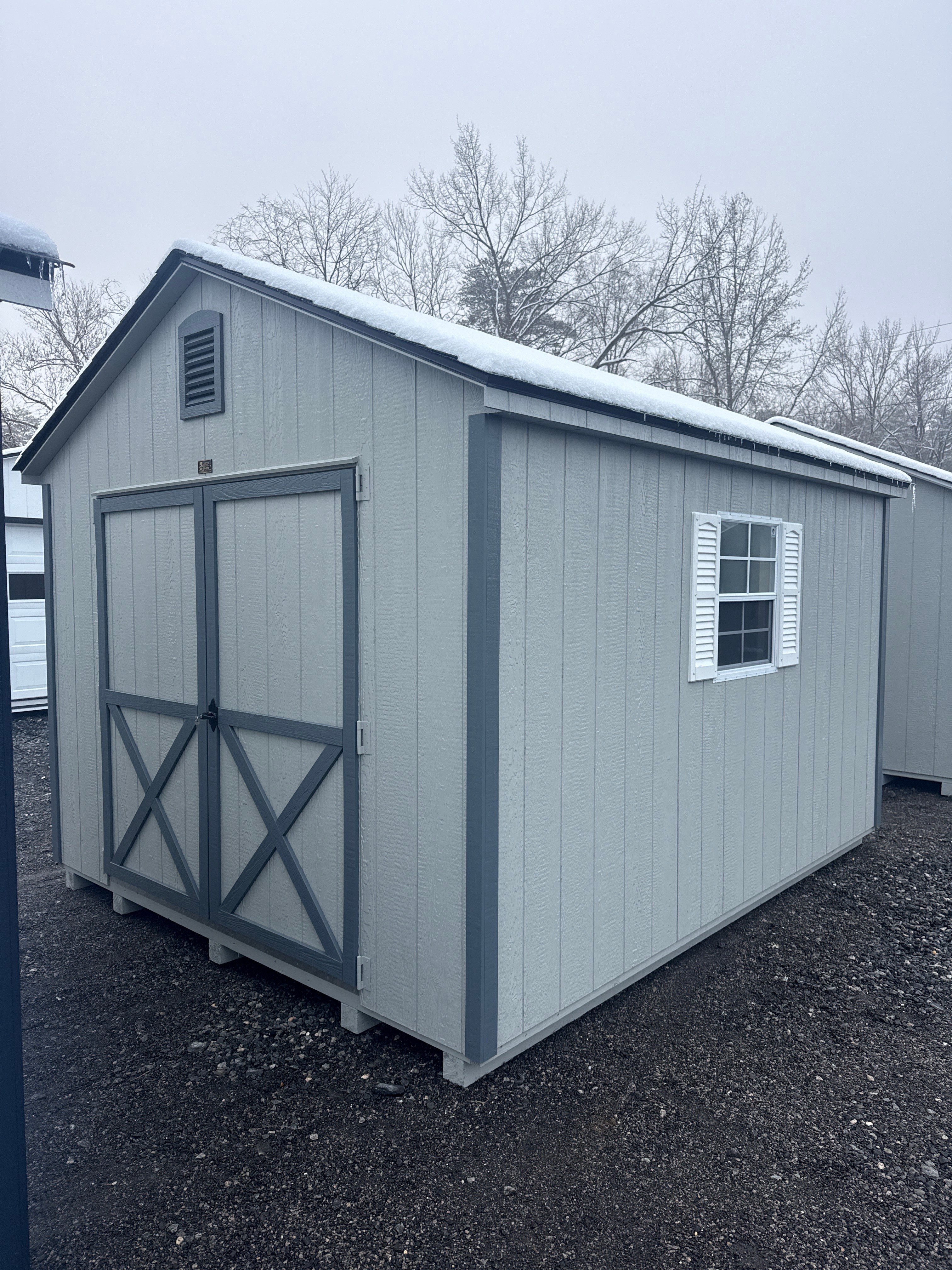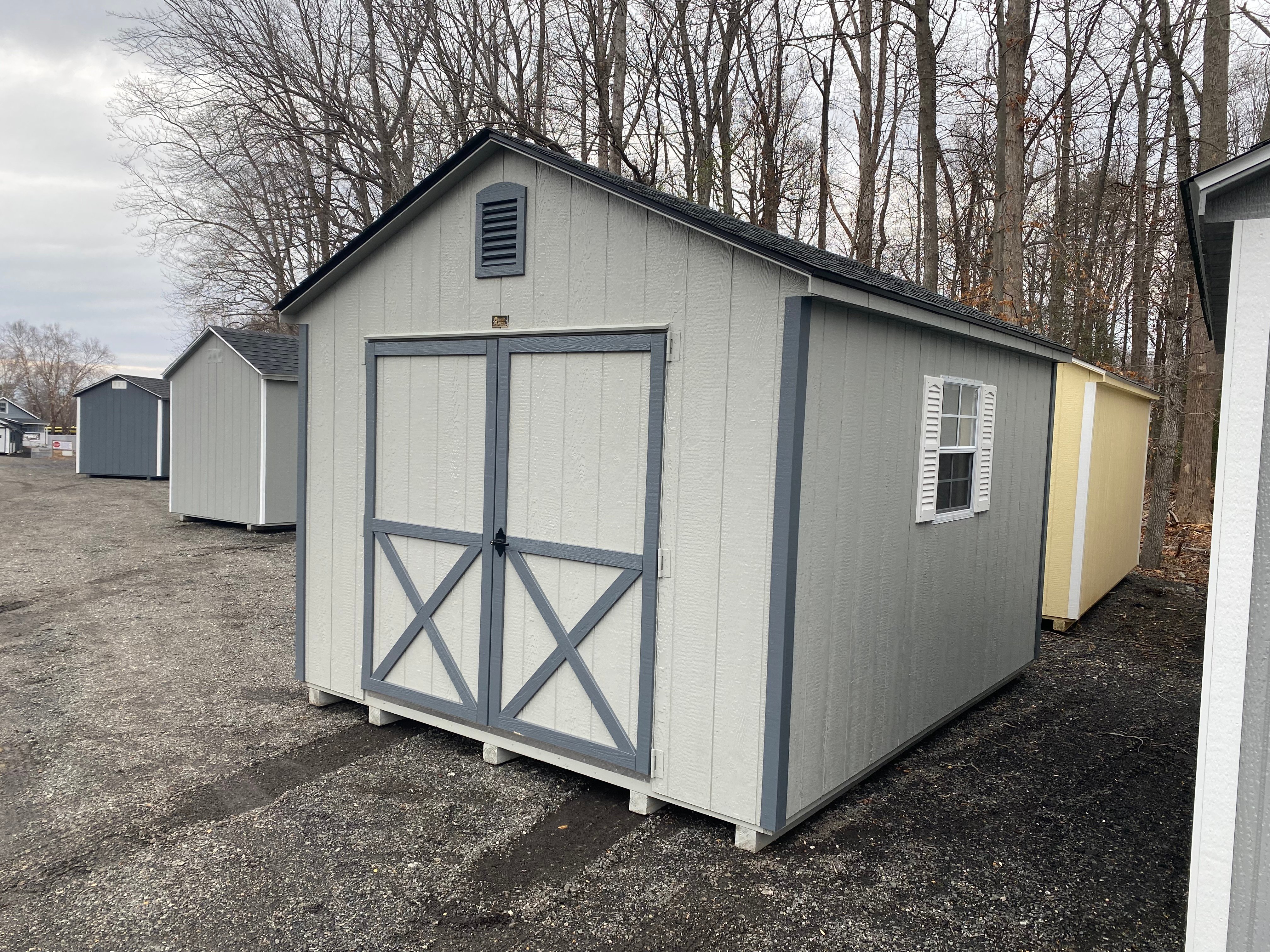 Add reliable storage and classic style to your backyard with this Amish-built 10×12 A-Frame storage shed. Crafted with durable LP Smart Panel siding and topped with architectural shingles in a charcoal roof color, this shed is built to withstand the elements while maintaining a clean, modern look. The light gray siding with dark gray trim creates a timeless appearance that complements any property. A 6′ double door provides easy access for equipment, tools, and lawn gear. Deluxe garden vents improve airflow, while the included workbench with lower shelf gives you a convenient workspace and organized storage inside.