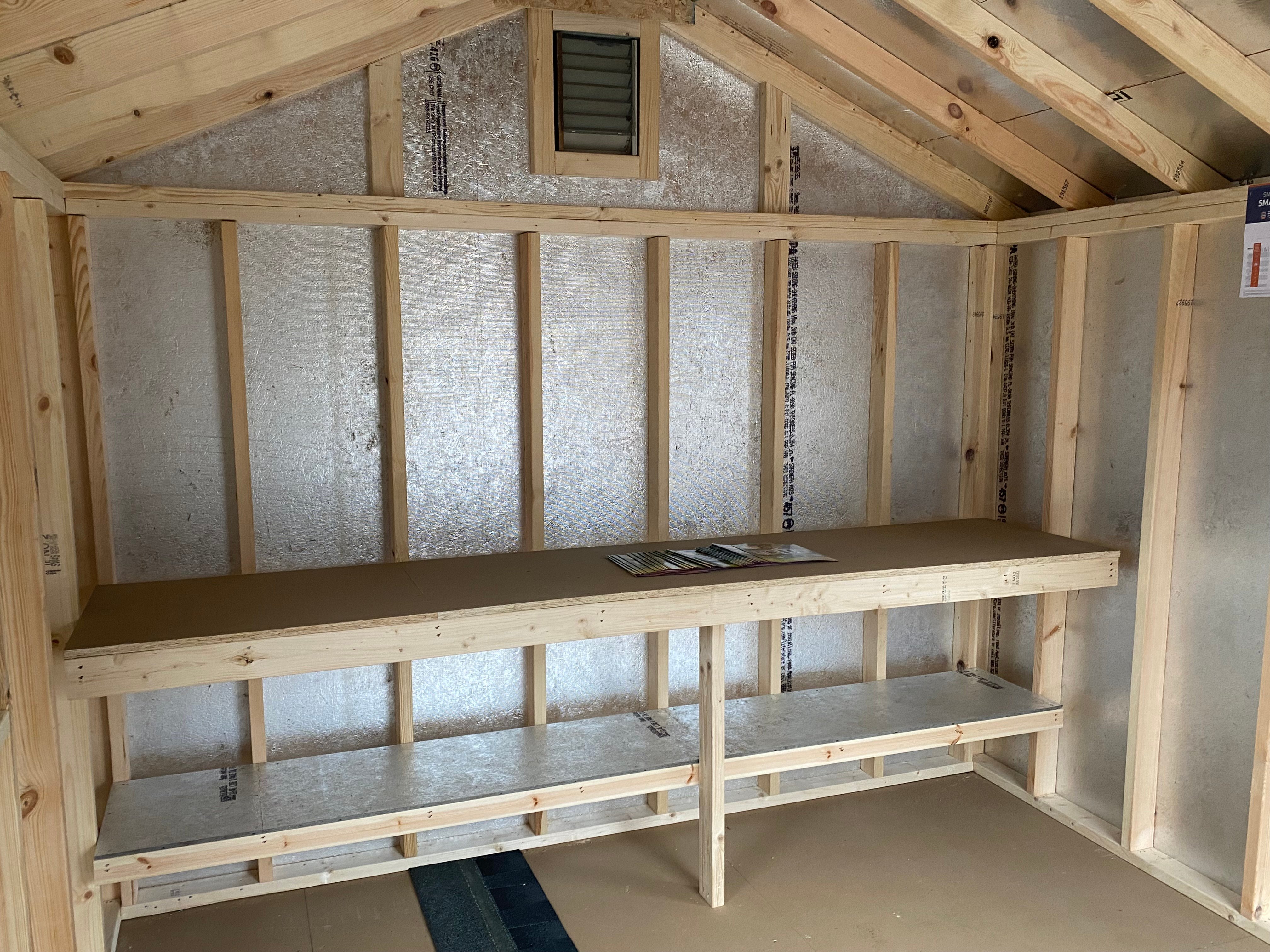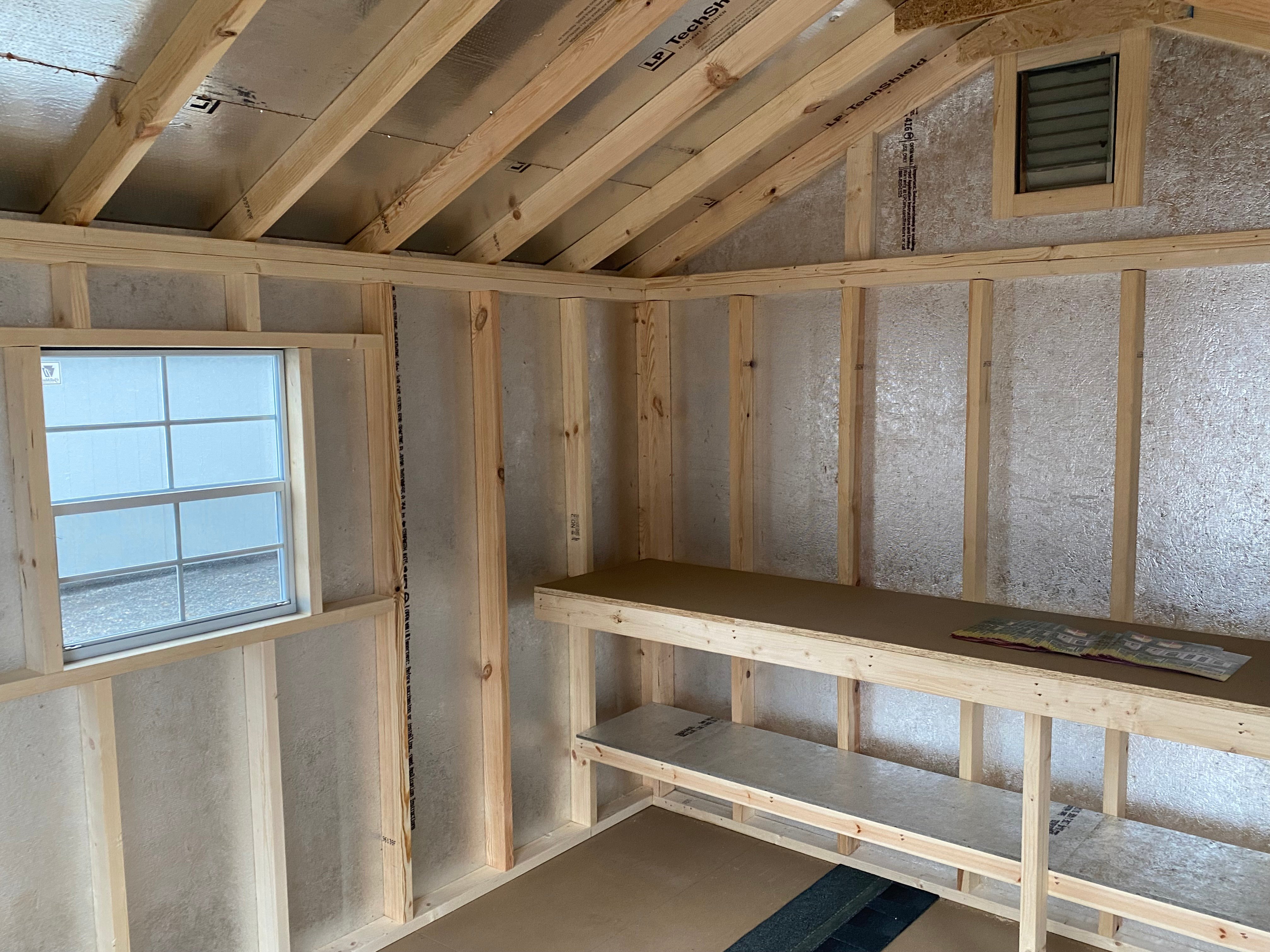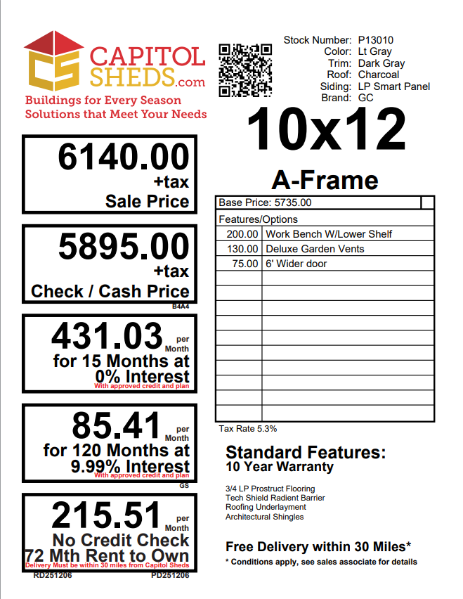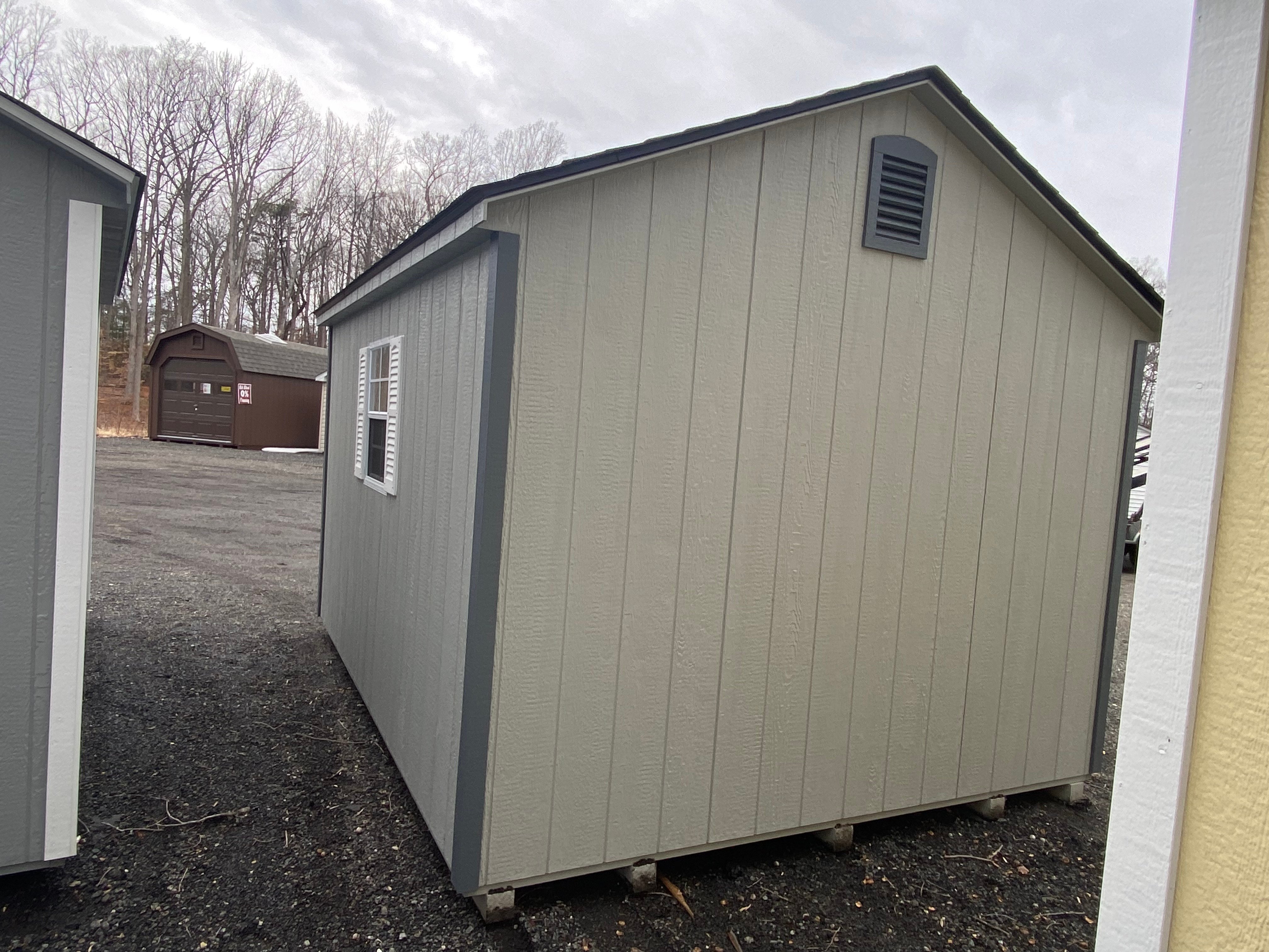 Add reliable storage and classic style to your backyard with this Amish-built 10×12 A-Frame storage shed. Crafted with durable LP Smart Panel siding and topped with architectural shingles in a charcoal roof color, this shed is built to withstand the elements while maintaining a clean, modern look. The light gray siding with dark gray trim creates a timeless appearance that complements any property. A 6′ double door provides easy access for equipment, tools, and lawn gear. Deluxe garden vents improve airflow, while the included workbench with lower shelf gives you a convenient workspace and organized storage inside.