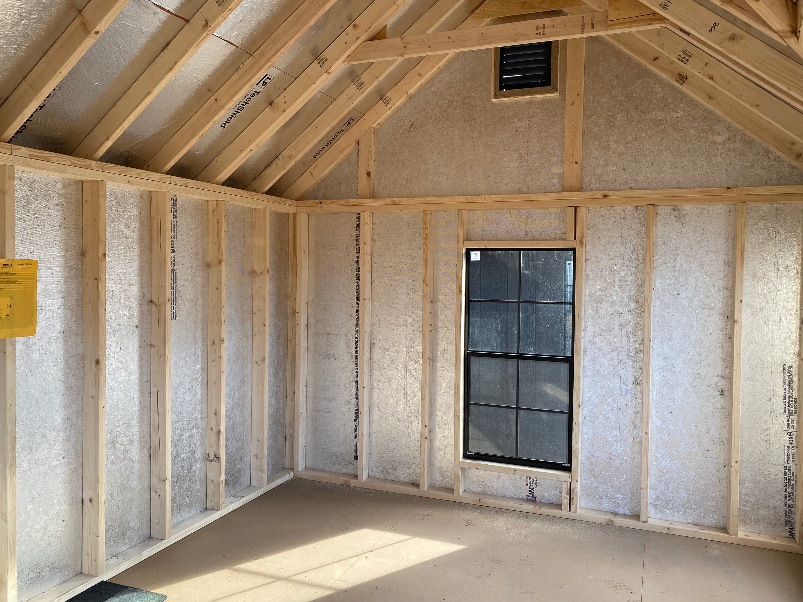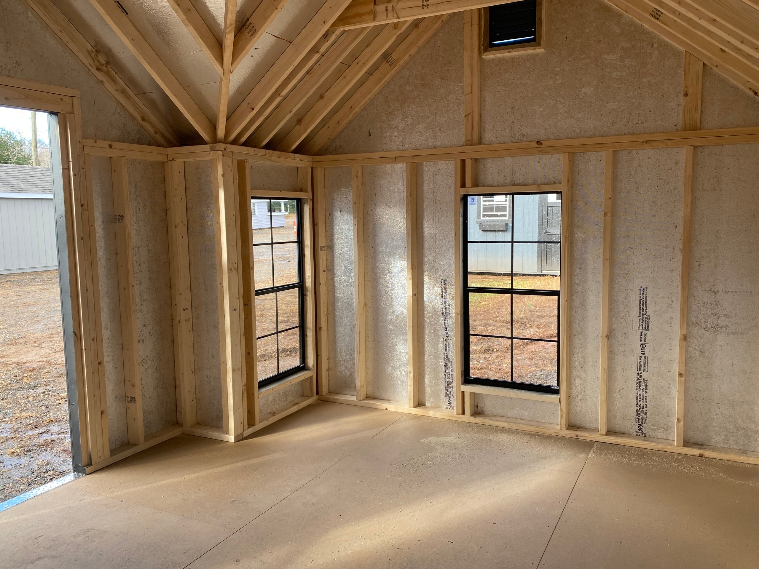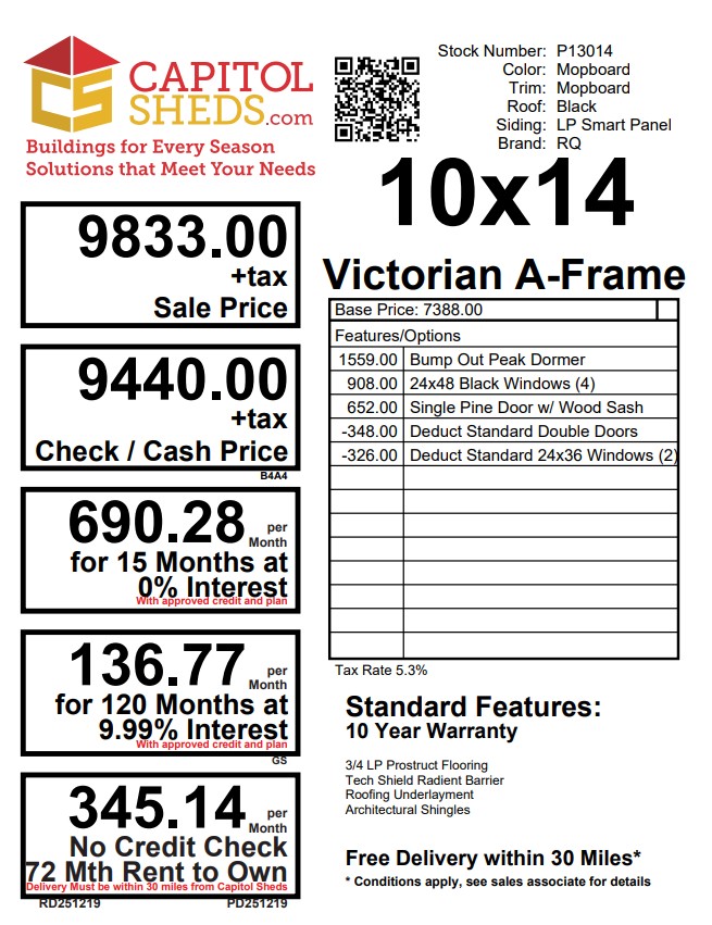 Style Name: Victorian A-Frame Size: 10×14 Siding: LP Smart Panel Main Color: Mopboard Trim Color: Mopboard Roof Color: Black Roofing: Architectural Shingles Roofing Underlayment: Roof Felt Paper Number of Windows: 4 Number of Doors: 1 Wall Framing: 2×4 studs 16 inches on center Roof Framing: 2×4 rafters 16 inches on center Roof Sheeting: LP Tech Shield Flooring: LP T&G Prostruct Flooring Floor Joists: Pressure Treated 2×4 joists 12 inches on center Included Upgrades: