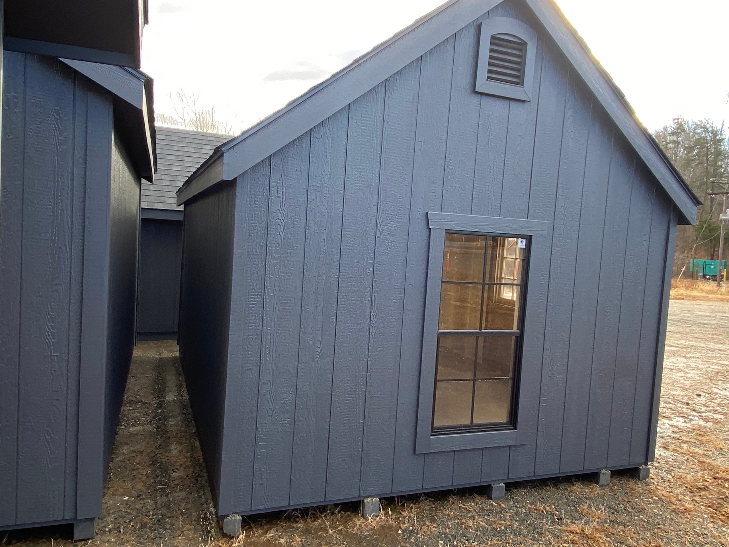 This 10×14 Victorian A-Frame features timeless character with eye-catching architectural details. Finished in Mopboard LP Smart Panel siding with matching Mopboard trim and a Black architectural shingle roof, this shed delivers a cohesive, classic look. Built with durable 2×4 wall framing and 2×4 rafters spaced 16″ on center, it also includes LP Tech Shield roof sheeting and LP T&G Prostruct flooring over pressure-treated 2×4 joists. The bump-out peak dormer enhances both curb appeal and interior headroom, while four 24×48 black windows bring in abundant natural light. A single pine door with a sash window completes this charming, functional design.