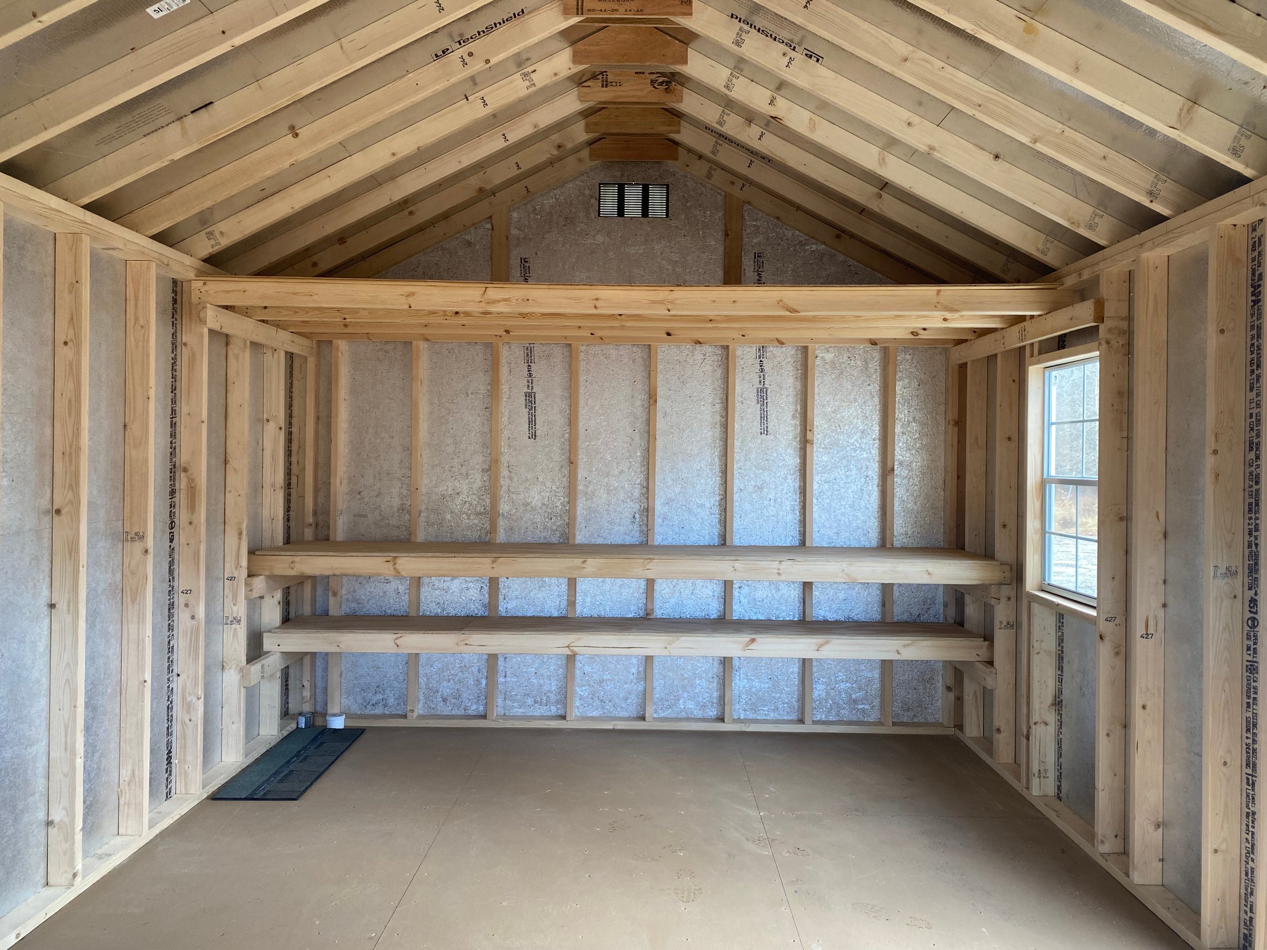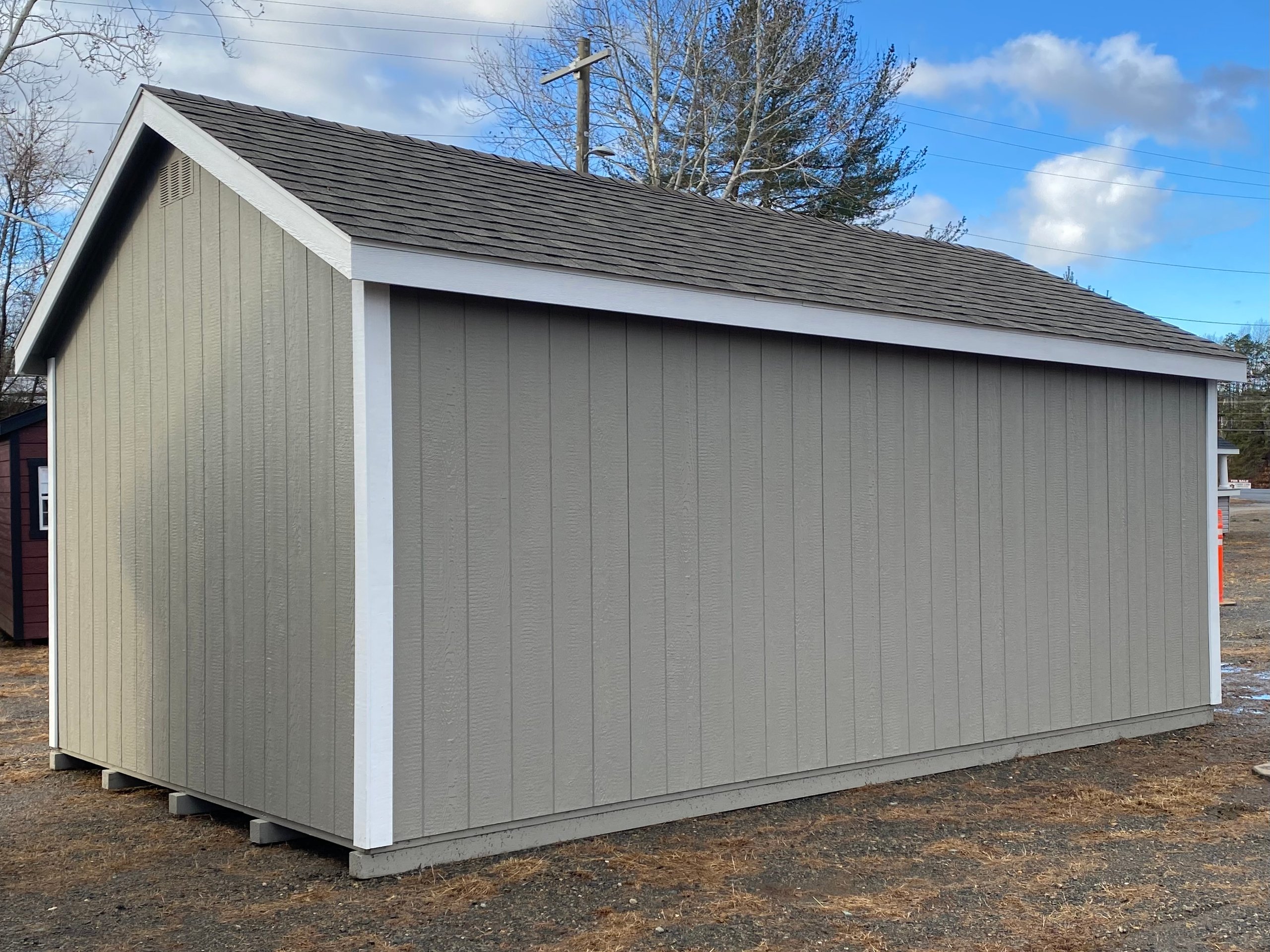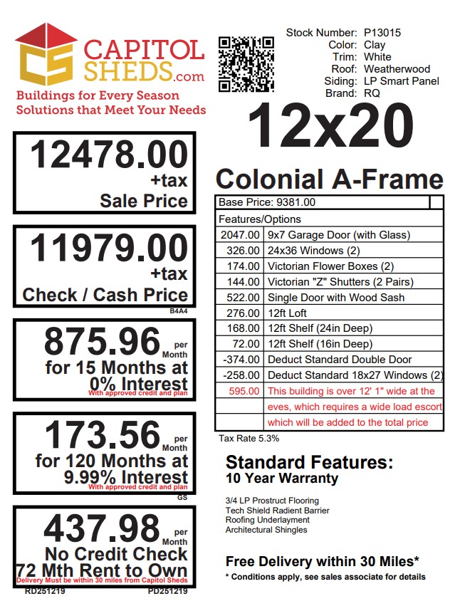 Style Name: Colonial A-Frame Size: 12×20 Siding: LP Smart Panel Main Color: Clay Trim Color: White Roof Color: Weatherwood Roofing: Architectural Shingles Roofing Underlayment: Roof Felt Paper Number of Windows: 2 Number of Doors: 1 Wall Framing: 2×4 studs 16 inches on center Roof Framing: 2×4 rafters 16 inches on center Roof Sheeting: LP Tech Shield Flooring: LP T&G Prostruct Flooring Floor Joists: Pressure Treated 2×4 joists 8 inches on center Included Upgrades: