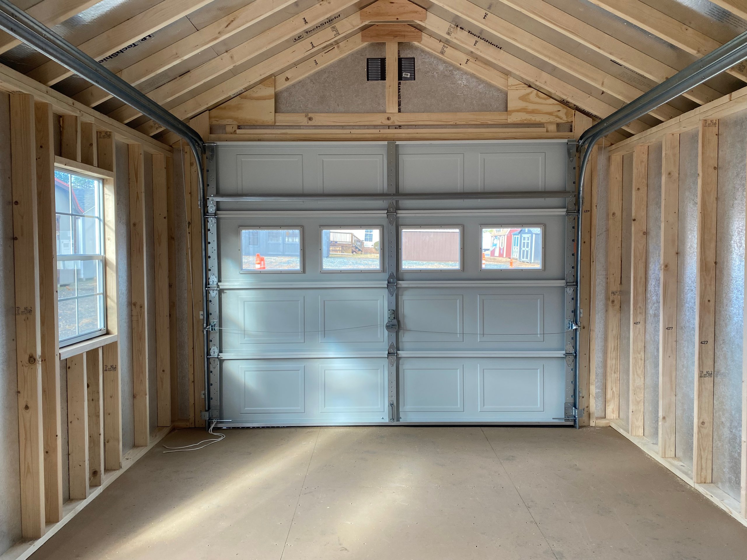This 12×20 Colonial A-Frame offers a perfect blend of classic style and heavy-duty construction. Finished in Clay LP Smart Panel siding with crisp White trim and a Weatherwood architectural shingle roof, this building stands out with timeless curb appeal. Built on pressure-treated 2×4 floor joists spaced 8″ on center, it provides exceptional strength and durability. LP Tech Shield roof sheeting and LP T&G Prostruct flooring ensure long-lasting performance. Upgrades include a 9×7 overhead door with glass, two 24×36 windows, Victorian flower boxes and “Z” shutters, plus a single entry door with a wood sash window. Interior shelving adds practical storage space.